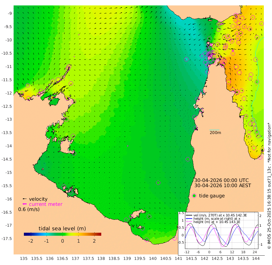 8cm/s 54T +3cm/s rms + 7cm/s -42T. ARA-GOC87 57m 12cm/s -176T +3cm/s rms + 2cm/s -2T. ARA-GOC87 60m 9cm/s 24T +2cm/s rms + 3cm/s 61T. ARA-GOC87 47m 111cm Daru 117cm Bobo Island 57cm Meer Island Barge 86cm Bramble Cay 103cm Unnamed Cay 112cm Pearce Cay 100cm Stephens Island 104cm Merrie England Shoals 116cm Mutacomal Reef 88cm Darnley Island Barge 68cm East Cay 97cm Yorke Island Barge 104cm Rennel Island 106cm Aureed Island 97cm Dungeness Reef 79cm Zagai Island 82cm Yam Island 31cm Dauan Island 31cm Saibai Island 39cm Phipi Reef 85cm Warrior Reef - West 10cm Mabuiag Island Barge 103cm Half Way Island 101cm Coconut Island 106cm Dugong Islet 92cm Poll Island 89cm Kirkcaldie Reef 71cm Suarji Island 80cm Sue Islet -37cm Hawkesbury Island 51cm Alert Patches 65cm Twin Island -39cm Badu Island 61cm St Pauls (Moa Island) -3cm Kubin (Moa Island) 31cm Ince Point 11cm Thursday Island 16cm Nardana Patches -11cm Turtle Head -24cm Round Island -49cm Goods Island -80cm Booby Island -62cm White Rocks Area -83cm Carpentaria 52cm Papou Point -79cm Bampfield Head -77cm Crab Island -61cm Red Wallis Island -13cm Packe Island 116cm Harrington Reef -45cm Herald Camp 18cm Sharp Point -10cm Red Island Point 22cm Possession Island 72cm Alpha Rock 89cm Frederick Point 113cm Wyborn Reef Light 110cm Tetley Island 58cm Triangle Reef 105cm Turtle Head Island 57cm Maclennan Cay 30cm Raine Island 96cm Mcsweeny Reef 84cm Collette Reef 51cm Shadwell Reef 95cm Hannibal Island 90cm Round Point -83cm Vrilya Point 75cm Cape Grenville 67cm Hicks Island 66cm Sir Charles Hardy Island 23cm Harvey Island 61cm Kay Reef 46cm Rocky Island 38cm Chapman Island 35cm Ham Reef 40cm Jubilee Reef 45cm Night Island 38cm Unnamed Reef No. 3 48cm Morris Island 27cm 1st 3 Mile Opening 40cm Creech Reef 55cm Fife Island 49cm Eden Reef 44cm Stanley Island 62cm Normanby River 38cm Yabooma Island 59cm Hutchison River 42cm Elcho Island 44cm North West Crocodile Island 56cm Cape Wessel 54cm Stevens Island 67cm Guluwuru Island 43cm Hopeful Bay 43cm Auster Point 56cm Two Island Bay 76cm Cadell Strait 106cm Mallison Island 58cm Melville Bay (Gove Harbour) 60cm Truant Island 41cm Cape Arnhem 22cm Cape Grey 26cm Hawk Island 0cm Milner Bay (Groote Eylandt) 5cm Cape Beatrice -8cm West Island -17cm Centre Island 9cm Mornington Island 3cm West Wellesley Islands 9cm Bountiful Island 3cm Albert River Mouth 1cm Sweers Island 6cm Karumba 9cm Nassau River Offshore -4cm Christmas Creek -37cm Archer River -41cm Boyd Point -48cm Weipa (Humbug Point) -60cm Pennefather River -65cm Cullen Point