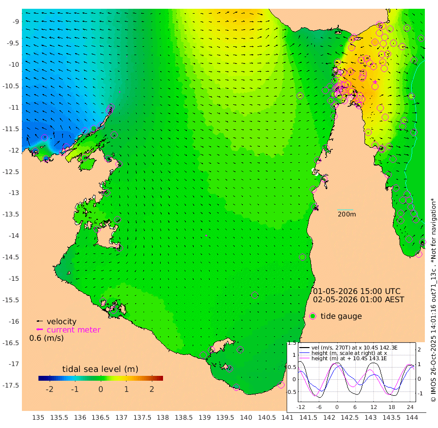 7cm/s 94T +3cm/s rms + 7cm/s -42T. ARA-GOC87 57m 13cm/s 137T +3cm/s rms + 2cm/s -2T. ARA-GOC87 60m 2cm/s 74T +2cm/s rms + 3cm/s 61T. ARA-GOC87 47m 80cm Daru 81cm Bobo Island 22cm Meer Island Barge 28cm Bramble Cay 53cm Unnamed Cay 68cm Pearce Cay 52cm Stephens Island 43cm Merrie England Shoals 68cm Mutacomal Reef 53cm Darnley Island Barge 21cm East Cay 72cm Yorke Island Barge 66cm Rennel Island 84cm Aureed Island 88cm Dungeness Reef 115cm Zagai Island 104cm Yam Island 107cm Dauan Island 111cm Saibai Island 109cm Phipi Reef 117cm Warrior Reef - West 83cm Mabuiag Island Barge 67cm Half Way Island 93cm Coconut Island 80cm Dugong Islet 97cm Poll Island 94cm Kirkcaldie Reef 121cm Suarji Island 100cm Sue Islet 18cm Hawkesbury Island 99cm Alert Patches 102cm Twin Island 43cm Badu Island 111cm St Pauls (Moa Island) 46cm Kubin (Moa Island) 84cm Ince Point 74cm Thursday Island 77cm Nardana Patches 55cm Turtle Head 36cm Round Island 24cm Goods Island 14cm Booby Island 14cm White Rocks Area 34cm Carpentaria 94cm Papou Point 27cm Bampfield Head 11cm Crab Island 16cm Red Wallis Island 36cm Packe Island 92cm Harrington Reef 25cm Herald Camp 38cm Sharp Point 49cm Red Island Point 78cm Possession Island 87cm Alpha Rock 97cm Frederick Point 76cm Wyborn Reef Light 82cm Tetley Island 32cm Triangle Reef 77cm Turtle Head Island 27cm Maclennan Cay 5cm Raine Island 56cm Mcsweeny Reef 46cm Collette Reef 22cm Shadwell Reef 46cm Hannibal Island 25cm Round Point 10cm Vrilya Point 24cm Cape Grenville 24cm Hicks Island 29cm Sir Charles Hardy Island 9cm Harvey Island 10cm Kay Reef 9cm Rocky Island 5cm Chapman Island 6cm Ham Reef 10cm Jubilee Reef 12cm Night Island 7cm Unnamed Reef No. 3 7cm Morris Island 11cm 1st 3 Mile Opening 12cm Creech Reef 5cm Fife Island 1cm Eden Reef 3cm Stanley Island 1cm Normanby River -153cm Yabooma Island -154cm Hutchison River -148cm Elcho Island -148cm North West Crocodile Island -60cm Cape Wessel -125cm Stevens Island -20cm Guluwuru Island -122cm Hopeful Bay -82cm Auster Point -91cm Two Island Bay -106cm Cadell Strait 13cm Mallison Island -33cm Melville Bay (Gove Harbour) -29cm Truant Island -8cm Cape Arnhem -6cm Cape Grey -12cm Hawk Island -12cm Milner Bay (Groote Eylandt) -14cm Cape Beatrice 1cm West Island 7cm Centre Island 0cm Mornington Island 1cm West Wellesley Islands -17cm Bountiful Island -55cm Albert River Mouth -56cm Sweers Island -50cm Karumba 1cm Nassau River Offshore 16cm Christmas Creek 7cm Archer River 19cm Boyd Point 6cm Weipa (Humbug Point) 9cm Pennefather River 12cm Cullen Point