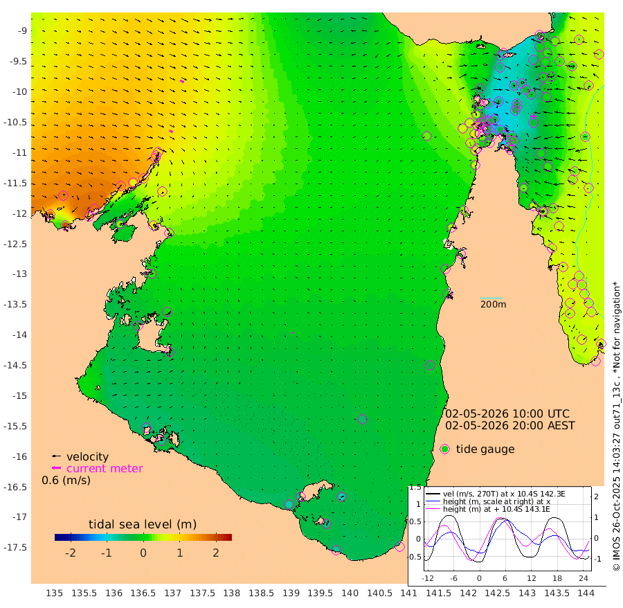 25cm/s 123T +3cm/s rms + 7cm/s -42T. ARA-GOC87 57m 10cm/s -6T +3cm/s rms + 2cm/s -2T. ARA-GOC87 60m 27cm/s 115T +2cm/s rms + 3cm/s 61T. ARA-GOC87 47m -8cm Daru -2cm Bobo Island 32cm Meer Island Barge 35cm Bramble Cay 16cm Unnamed Cay 10cm Pearce Cay 19cm Stephens Island 27cm Merrie England Shoals -1cm Mutacomal Reef 13cm Darnley Island Barge 40cm East Cay -3cm Yorke Island Barge 6cm Rennel Island -12cm Aureed Island -19cm Dungeness Reef -54cm Zagai Island -50cm Yam Island -72cm Dauan Island -75cm Saibai Island -55cm Phipi Reef -63cm Warrior Reef - West -36cm Mabuiag Island Barge 0cm Half Way Island -10cm Coconut Island -15cm Dugong Islet -32cm Poll Island -24cm Kirkcaldie Reef -53cm Suarji Island -38cm Sue Islet 51cm Hawkesbury Island -26cm Alert Patches -32cm Twin Island 31cm Badu Island -47cm St Pauls (Moa Island) 16cm Kubin (Moa Island) -22cm Ince Point -11cm Thursday Island -15cm Nardana Patches 11cm Turtle Head 37cm Round Island 46cm Goods Island 57cm Booby Island 54cm White Rocks Area 29cm Carpentaria -28cm Papou Point 75cm Bampfield Head 57cm Crab Island 45cm Red Wallis Island 25cm Packe Island -12cm Harrington Reef 39cm Herald Camp -27cm Sharp Point 20cm Red Island Point 0cm Possession Island -33cm Alpha Rock -23cm Frederick Point 0cm Wyborn Reef Light -7cm Tetley Island 20cm Triangle Reef 18cm Turtle Head Island 26cm Maclennan Cay 46cm Raine Island 12cm Mcsweeny Reef 20cm Collette Reef 32cm Shadwell Reef 25cm Hannibal Island 43cm Round Point 52cm Vrilya Point 34cm Cape Grenville 36cm Hicks Island 25cm Sir Charles Hardy Island 9cm Harvey Island 46cm Kay Reef 41cm Rocky Island 45cm Chapman Island 41cm Ham Reef 41cm Jubilee Reef 34cm Night Island 43cm Unnamed Reef No. 3 46cm Morris Island 44cm 1st 3 Mile Opening 41cm Creech Reef 42cm Fife Island 55cm Eden Reef 48cm Stanley Island 51cm Normanby River 171cm Yabooma Island 193cm Hutchison River 169cm Elcho Island 159cm North West Crocodile Island 92cm Cape Wessel 152cm Stevens Island 69cm Guluwuru Island 142cm Hopeful Bay 119cm Auster Point 113cm Two Island Bay 147cm Cadell Strait 37cm Mallison Island 70cm Melville Bay (Gove Harbour) 75cm Truant Island 37cm Cape Arnhem 17cm Cape Grey 6cm Hawk Island -22cm Milner Bay (Groote Eylandt) -32cm Cape Beatrice -76cm West Island -71cm Centre Island -73cm Mornington Island -81cm West Wellesley Islands -84cm Bountiful Island -74cm Albert River Mouth -70cm Sweers Island -66cm Karumba -57cm Nassau River Offshore -35cm Christmas Creek 14cm Archer River 13cm Boyd Point 22cm Weipa (Humbug Point) 40cm Pennefather River 31cm Cullen Point