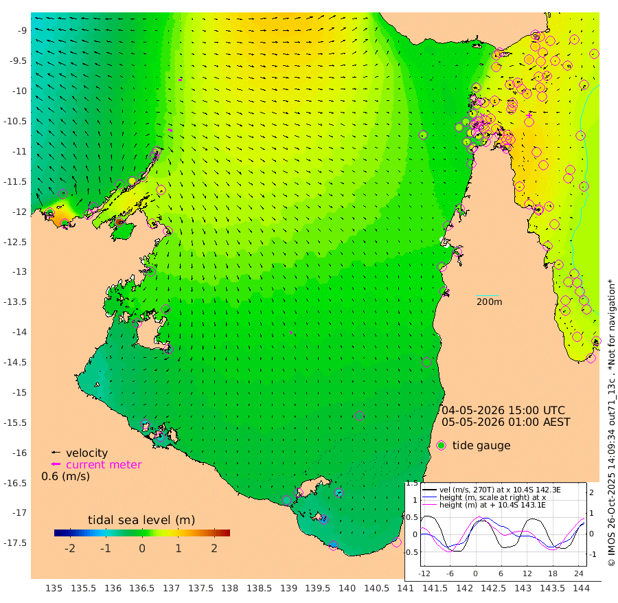 30cm/s 110T +3cm/s rms + 7cm/s -42T. ARA-GOC87 57m 21cm/s 155T +3cm/s rms + 2cm/s -2T. ARA-GOC87 60m 22cm/s 100T +2cm/s rms + 3cm/s 61T. ARA-GOC87 47m 94cm Daru 96cm Bobo Island 55cm Meer Island Barge 69cm Bramble Cay 83cm Unnamed Cay 88cm Pearce Cay 75cm Stephens Island 79cm Merrie England Shoals 92cm Mutacomal Reef 78cm Darnley Island Barge 58cm East Cay 87cm Yorke Island Barge 81cm Rennel Island 91cm Aureed Island 89cm Dungeness Reef 104cm Zagai Island 93cm Yam Island 101cm Dauan Island 106cm Saibai Island 100cm Phipi Reef 108cm Warrior Reef - West 78cm Mabuiag Island Barge 76cm Half Way Island 99cm Coconut Island 81cm Dugong Islet 91cm Poll Island 85cm Kirkcaldie Reef 95cm Suarji Island 96cm Sue Islet 58cm Hawkesbury Island 89cm Alert Patches 91cm Twin Island 67cm Badu Island 91cm St Pauls (Moa Island) 64cm Kubin (Moa Island) 77cm Ince Point 70cm Thursday Island 72cm Nardana Patches 64cm Turtle Head 64cm Round Island 49cm Goods Island 36cm Booby Island 34cm White Rocks Area 33cm Carpentaria 80cm Papou Point 66cm Bampfield Head 28cm Crab Island 38cm Red Wallis Island 59cm Packe Island 89cm Harrington Reef 56cm Herald Camp 25cm Sharp Point 56cm Red Island Point 77cm Possession Island 86cm Alpha Rock 93cm Frederick Point 100cm Wyborn Reef Light 102cm Tetley Island 63cm Triangle Reef 93cm Turtle Head Island 52cm Maclennan Cay 41cm Raine Island 79cm Mcsweeny Reef 76cm Collette Reef 58cm Shadwell Reef 80cm Hannibal Island 71cm Round Point 21cm Vrilya Point 60cm Cape Grenville 58cm Hicks Island 67cm Sir Charles Hardy Island 18cm Harvey Island 55cm Kay Reef 48cm Rocky Island 53cm Chapman Island 47cm Ham Reef 47cm Jubilee Reef 43cm Night Island 47cm Unnamed Reef No. 3 46cm Morris Island 42cm 1st 3 Mile Opening 46cm Creech Reef 44cm Fife Island 50cm Eden Reef 44cm Stanley Island 44cm Normanby River -23cm Yabooma Island -8cm Hutchison River -24cm Elcho Island -33cm North West Crocodile Island 34cm Cape Wessel 6cm Stevens Island 71cm Guluwuru Island 3cm Hopeful Bay 19cm Auster Point 12cm Two Island Bay 30cm Cadell Strait 205cm Mallison Island 51cm Melville Bay (Gove Harbour) 61cm Truant Island 44cm Cape Arnhem 10cm Cape Grey 1cm Hawk Island -43cm Milner Bay (Groote Eylandt) -54cm Cape Beatrice -85cm West Island -79cm Centre Island -67cm Mornington Island -71cm West Wellesley Islands -87cm Bountiful Island -130cm Albert River Mouth -133cm Sweers Island -120cm Karumba -38cm Nassau River Offshore 0cm Christmas Creek 18cm Archer River 29cm Boyd Point 22cm Weipa (Humbug Point) 19cm Pennefather River 27cm Cullen Point