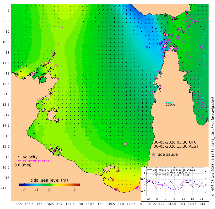 19cm/s 41T +3cm/s rms + 7cm/s -42T. ARA-GOC87 57m 13cm/s -37T +3cm/s rms + 2cm/s -2T. ARA-GOC87 60m 25cm/s 39T +2cm/s rms + 3cm/s 61T. ARA-GOC87 47m -25cm Daru -22cm Bobo Island -37cm Meer Island Barge -31cm Bramble Cay -31cm Unnamed Cay -32cm Pearce Cay -38cm Stephens Island -31cm Merrie England Shoals -25cm Mutacomal Reef -30cm Darnley Island Barge -43cm East Cay -26cm Yorke Island Barge -38cm Rennel Island -26cm Aureed Island -35cm Dungeness Reef -11cm Zagai Island -29cm Yam Island -15cm Dauan Island -3cm Saibai Island -20cm Phipi Reef -11cm Warrior Reef - West -46cm Mabuiag Island Barge -39cm Half Way Island -33cm Coconut Island -39cm Dugong Islet -33cm Poll Island -45cm Kirkcaldie Reef -42cm Suarji Island -24cm Sue Islet -150cm Hawkesbury Island -62cm Alert Patches -57cm Twin Island -116cm Badu Island -51cm St Pauls (Moa Island) -119cm Kubin (Moa Island) -75cm Ince Point -93cm Thursday Island -86cm Nardana Patches -112cm Turtle Head -136cm Round Island -147cm Goods Island -171cm Booby Island -161cm White Rocks Area -155cm Carpentaria -53cm Papou Point -197cm Bampfield Head -146cm Crab Island -160cm Red Wallis Island -138cm Packe Island -45cm Harrington Reef -175cm Herald Camp -2cm Sharp Point -102cm Red Island Point -91cm Possession Island -39cm Alpha Rock -49cm Frederick Point -30cm Wyborn Reef Light -30cm Tetley Island -33cm Triangle Reef -54cm Turtle Head Island -46cm Maclennan Cay -44cm Raine Island -33cm Mcsweeny Reef -30cm Collette Reef -33cm Shadwell Reef -30cm Hannibal Island -40cm Round Point -142cm Vrilya Point -42cm Cape Grenville -45cm Hicks Island -46cm Sir Charles Hardy Island -15cm Harvey Island -42cm Kay Reef -42cm Rocky Island -40cm Chapman Island -42cm Ham Reef -40cm Jubilee Reef -41cm Night Island -43cm Unnamed Reef No. 3 -45cm Morris Island -50cm 1st 3 Mile Opening -47cm Creech Reef -41cm Fife Island -44cm Eden Reef -47cm Stanley Island -46cm Normanby River 9cm Yabooma Island 27cm Hutchison River 28cm Elcho Island 27cm North West Crocodile Island 32cm Cape Wessel 41cm Stevens Island 62cm Guluwuru Island 32cm Hopeful Bay 25cm Auster Point 23cm Two Island Bay 54cm Cadell Strait 156cm Mallison Island 52cm Melville Bay (Gove Harbour) 47cm Truant Island 42cm Cape Arnhem 48cm Cape Grey 53cm Hawk Island 62cm Milner Bay (Groote Eylandt) 62cm Cape Beatrice 63cm West Island 58cm Centre Island 83cm Mornington Island 86cm West Wellesley Islands 105cm Bountiful Island 158cm Albert River Mouth 168cm Sweers Island 132cm Karumba 36cm Nassau River Offshore -15cm Christmas Creek -61cm Archer River -83cm Boyd Point -91cm Weipa (Humbug Point) -92cm Pennefather River -128cm Cullen Point