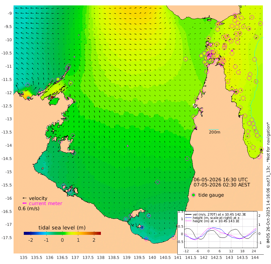 21cm/s 114T +3cm/s rms + 7cm/s -42T. ARA-GOC87 57m 28cm/s 158T +3cm/s rms + 2cm/s -2T. ARA-GOC87 60m 11cm/s 111T +2cm/s rms + 3cm/s 61T. ARA-GOC87 47m 71cm Daru 67cm Bobo Island 50cm Meer Island Barge 58cm Bramble Cay 69cm Unnamed Cay 61cm Pearce Cay 59cm Stephens Island 66cm Merrie England Shoals 74cm Mutacomal Reef 65cm Darnley Island Barge 50cm East Cay 69cm Yorke Island Barge 62cm Rennel Island 65cm Aureed Island 65cm Dungeness Reef 77cm Zagai Island 72cm Yam Island 89cm Dauan Island 93cm Saibai Island 75cm Phipi Reef 82cm Warrior Reef - West 69cm Mabuiag Island Barge 58cm Half Way Island 69cm Coconut Island 63cm Dugong Islet 67cm Poll Island 63cm Kirkcaldie Reef 65cm Suarji Island 75cm Sue Islet 67cm Hawkesbury Island 69cm Alert Patches 69cm Twin Island 65cm Badu Island 70cm St Pauls (Moa Island) 64cm Kubin (Moa Island) 65cm Ince Point 63cm Thursday Island 63cm Nardana Patches 62cm Turtle Head 66cm Round Island 57cm Goods Island 53cm Booby Island 45cm White Rocks Area 54cm Carpentaria 57cm Papou Point 79cm Bampfield Head 41cm Crab Island 54cm Red Wallis Island 67cm Packe Island 61cm Harrington Reef 75cm Herald Camp 19cm Sharp Point 46cm Red Island Point 61cm Possession Island 72cm Alpha Rock 69cm Frederick Point 78cm Wyborn Reef Light 79cm Tetley Island 56cm Triangle Reef 67cm Turtle Head Island 48cm Maclennan Cay 41cm Raine Island 64cm Mcsweeny Reef 65cm Collette Reef 56cm Shadwell Reef 67cm Hannibal Island 60cm Round Point 39cm Vrilya Point 55cm Cape Grenville 50cm Hicks Island 66cm Sir Charles Hardy Island 16cm Harvey Island 54cm Kay Reef 47cm Rocky Island 53cm Chapman Island 49cm Ham Reef 47cm Jubilee Reef 42cm Night Island 48cm Unnamed Reef No. 3 45cm Morris Island 43cm 1st 3 Mile Opening 46cm Creech Reef 44cm Fife Island 50cm Eden Reef 48cm Stanley Island 44cm Normanby River -49cm Yabooma Island -54cm Hutchison River -59cm Elcho Island -67cm North West Crocodile Island 9cm Cape Wessel -23cm Stevens Island 43cm Guluwuru Island -20cm Hopeful Bay -8cm Auster Point -10cm Two Island Bay -9cm Cadell Strait 225cm Mallison Island 26cm Melville Bay (Gove Harbour) 36cm Truant Island 26cm Cape Arnhem -7cm Cape Grey -14cm Hawk Island -52cm Milner Bay (Groote Eylandt) -59cm Cape Beatrice -82cm West Island -79cm Centre Island -71cm Mornington Island -68cm West Wellesley Islands -90cm Bountiful Island -141cm Albert River Mouth -149cm Sweers Island -132cm Karumba -31cm Nassau River Offshore 13cm Christmas Creek 31cm Archer River 44cm Boyd Point 40cm Weipa (Humbug Point) 31cm Pennefather River 48cm Cullen Point