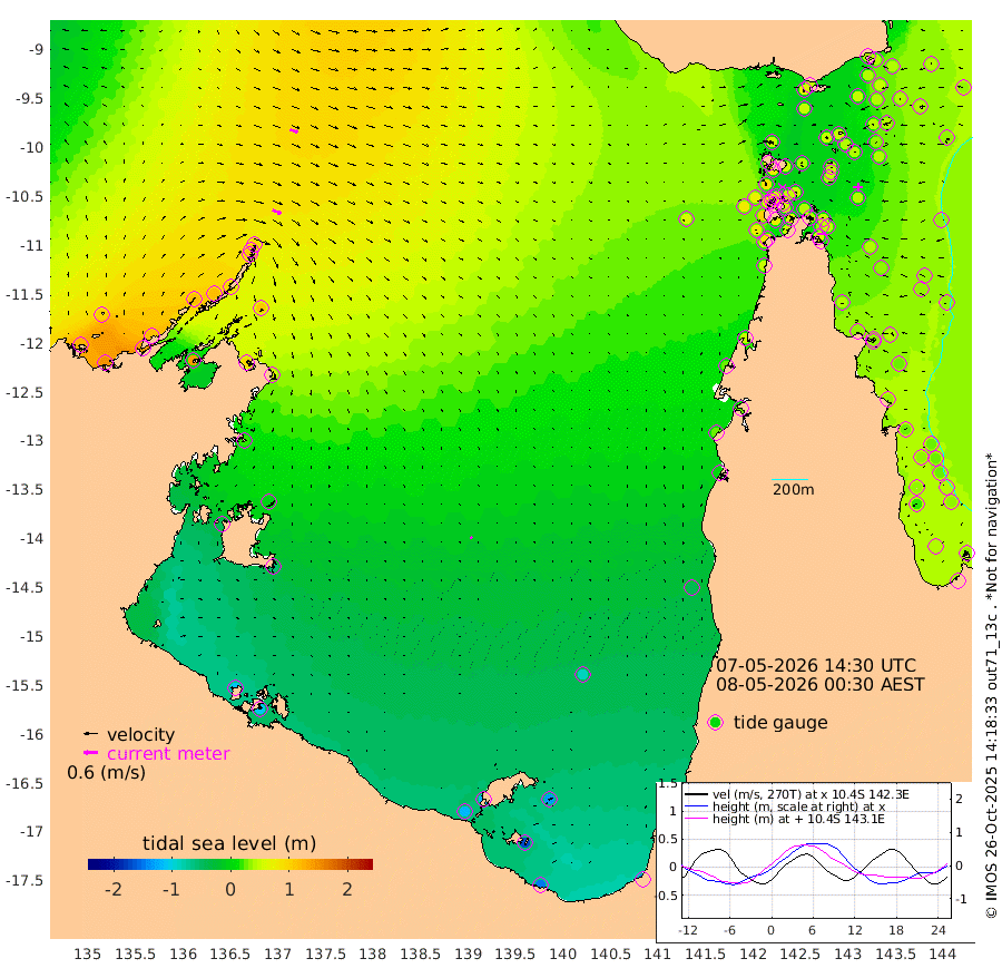 40cm/s 115T +3cm/s rms + 7cm/s -42T. ARA-GOC87 57m 8cm/s 133T +3cm/s rms + 2cm/s -2T. ARA-GOC87 60m 36cm/s 110T +2cm/s rms + 3cm/s 61T. ARA-GOC87 47m 44cm Daru 41cm Bobo Island 37cm Meer Island Barge 39cm Bramble Cay 45cm Unnamed Cay 40cm Pearce Cay 40cm Stephens Island 39cm Merrie England Shoals 42cm Mutacomal Reef 40cm Darnley Island Barge 32cm East Cay 42cm Yorke Island Barge 40cm Rennel Island 36cm Aureed Island 44cm Dungeness Reef 52cm Zagai Island 51cm Yam Island 62cm Dauan Island 52cm Saibai Island 51cm Phipi Reef 48cm Warrior Reef - West 52cm Mabuiag Island Barge 41cm Half Way Island 44cm Coconut Island 41cm Dugong Islet 45cm Poll Island 43cm Kirkcaldie Reef 41cm Suarji Island 43cm Sue Islet 83cm Hawkesbury Island 47cm Alert Patches 49cm Twin Island 82cm Badu Island 52cm St Pauls (Moa Island) 78cm Kubin (Moa Island) 54cm Ince Point 58cm Thursday Island 58cm Nardana Patches 66cm Turtle Head 79cm Round Island 79cm Goods Island 79cm Booby Island 73cm White Rocks Area 59cm Carpentaria 51cm Papou Point 102cm Bampfield Head 63cm Crab Island 70cm Red Wallis Island 72cm Packe Island 37cm Harrington Reef 84cm Herald Camp 5cm Sharp Point 47cm Red Island Point 56cm Possession Island 43cm Alpha Rock 44cm Frederick Point 50cm Wyborn Reef Light 51cm Tetley Island 35cm Triangle Reef 59cm Turtle Head Island 33cm Maclennan Cay 32cm Raine Island 38cm Mcsweeny Reef 36cm Collette Reef 35cm Shadwell Reef 39cm Hannibal Island 37cm Round Point 51cm Vrilya Point 32cm Cape Grenville 36cm Hicks Island 42cm Sir Charles Hardy Island 10cm Harvey Island 30cm Kay Reef 30cm Rocky Island 29cm Chapman Island 28cm Ham Reef 33cm Jubilee Reef 27cm Night Island 25cm Unnamed Reef No. 3 31cm Morris Island 39cm 1st 3 Mile Opening 31cm Creech Reef 20cm Fife Island 38cm Eden Reef 31cm Stanley Island 29cm Normanby River 122cm Yabooma Island 146cm Hutchison River 115cm Elcho Island 102cm North West Crocodile Island 96cm Cape Wessel 117cm Stevens Island 114cm Guluwuru Island 98cm Hopeful Bay 102cm Auster Point 108cm Two Island Bay 137cm Cadell Strait 137cm Mallison Island 93cm Melville Bay (Gove Harbour) 106cm Truant Island 64cm Cape Arnhem 20cm Cape Grey -2cm Hawk Island -42cm Milner Bay (Groote Eylandt) -58cm Cape Beatrice -110cm West Island -106cm Centre Island -115cm Mornington Island -117cm West Wellesley Islands -130cm Bountiful Island -143cm Albert River Mouth -165cm Sweers Island -149cm Karumba -83cm Nassau River Offshore -38cm Christmas Creek 2cm Archer River 24cm Boyd Point 27cm Weipa (Humbug Point) 27cm Pennefather River 46cm Cullen Point