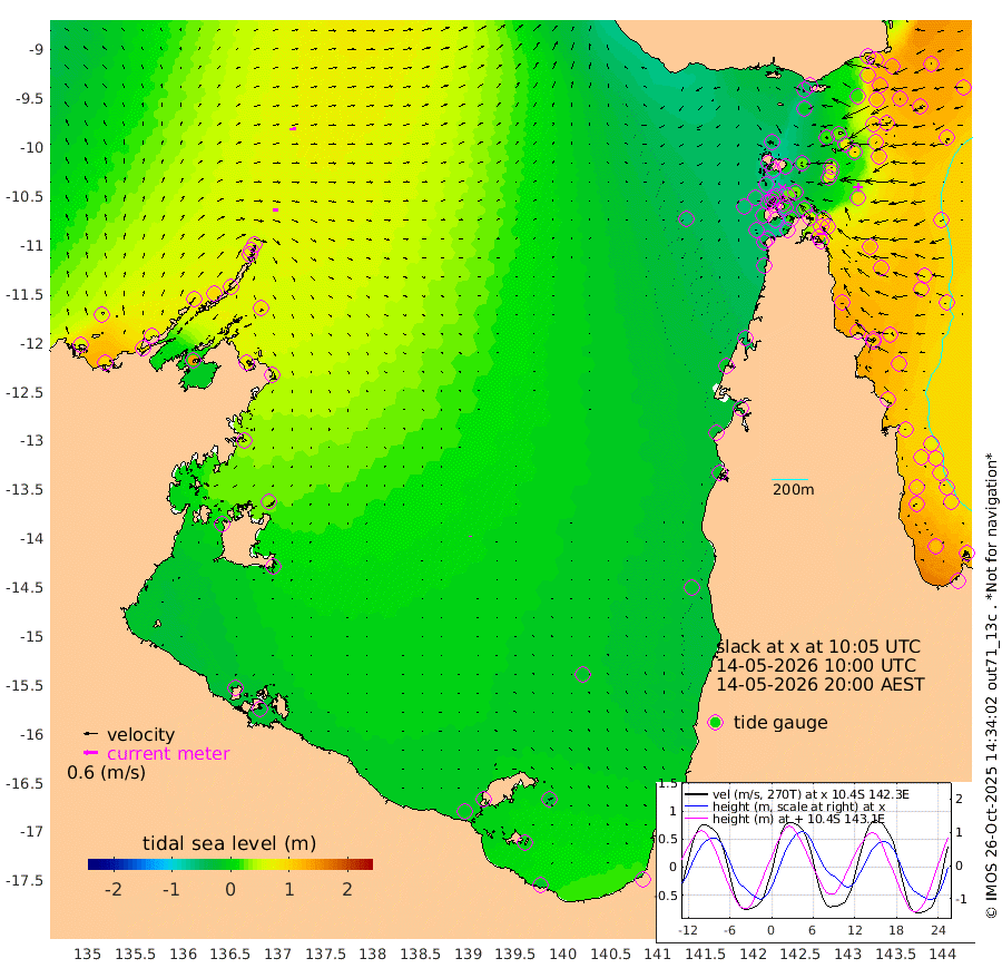 24cm/s 96T +3cm/s rms + 7cm/s -42T. ARA-GOC87 57m 4cm/s -9T +3cm/s rms + 2cm/s -2T. ARA-GOC87 60m 24cm/s 83T +2cm/s rms + 3cm/s 61T. ARA-GOC87 47m 105cm Daru 112cm Bobo Island 101cm Meer Island Barge 120cm Bramble Cay 122cm Unnamed Cay 115cm Pearce Cay 124cm Stephens Island 132cm Merrie England Shoals 108cm Mutacomal Reef 115cm Darnley Island Barge 109cm East Cay 105cm Yorke Island Barge 110cm Rennel Island 99cm Aureed Island 82cm Dungeness Reef 29cm Zagai Island 22cm Yam Island -46cm Dauan Island -50cm Saibai Island -10cm Phipi Reef 18cm Warrior Reef - West -42cm Mabuiag Island Barge 106cm Half Way Island 92cm Coconut Island 93cm Dugong Islet 55cm Poll Island 66cm Kirkcaldie Reef 24cm Suarji Island 47cm Sue Islet -45cm Hawkesbury Island 24cm Alert Patches 24cm Twin Island -44cm Badu Island 7cm St Pauls (Moa Island) -26cm Kubin (Moa Island) -5cm Ince Point -16cm Thursday Island -14cm Nardana Patches -20cm Turtle Head -18cm Round Island -36cm Goods Island -53cm Booby Island -46cm White Rocks Area -56cm Carpentaria 11cm Papou Point -20cm Bampfield Head -41cm Crab Island -57cm Red Wallis Island -31cm Packe Island 105cm Harrington Reef -43cm Herald Camp -6cm Sharp Point -22cm Red Island Point 15cm Possession Island 28cm Alpha Rock 58cm Frederick Point 104cm Wyborn Reef Light 91cm Tetley Island 77cm Triangle Reef 122cm Turtle Head Island 89cm Maclennan Cay 86cm Raine Island 113cm Mcsweeny Reef 113cm Collette Reef 95cm Shadwell Reef 128cm Hannibal Island 125cm Round Point -42cm Vrilya Point 113cm Cape Grenville 109cm Hicks Island 95cm Sir Charles Hardy Island 35cm Harvey Island 110cm Kay Reef 93cm Rocky Island 84cm Chapman Island 81cm Ham Reef 90cm Jubilee Reef 87cm Night Island 84cm Unnamed Reef No. 3 101cm Morris Island 93cm 1st 3 Mile Opening 93cm Creech Reef 100cm Fife Island 113cm Eden Reef 104cm Stanley Island 114cm Normanby River 60cm Yabooma Island 92cm Hutchison River 69cm Elcho Island 55cm North West Crocodile Island 58cm Cape Wessel 78cm Stevens Island 91cm Guluwuru Island 69cm Hopeful Bay 69cm Auster Point 63cm Two Island Bay 90cm Cadell Strait 139cm Mallison Island 78cm Melville Bay (Gove Harbour) 83cm Truant Island 57cm Cape Arnhem 42cm Cape Grey 34cm Hawk Island 6cm Milner Bay (Groote Eylandt) 1cm Cape Beatrice -29cm West Island -26cm Centre Island -6cm Mornington Island -13cm West Wellesley Islands -23cm Bountiful Island -18cm Albert River Mouth -5cm Sweers Island -15cm Karumba -18cm Nassau River Offshore -16cm Christmas Creek -15cm Archer River -23cm Boyd Point -27cm Weipa (Humbug Point) -12cm Pennefather River -48cm Cullen Point