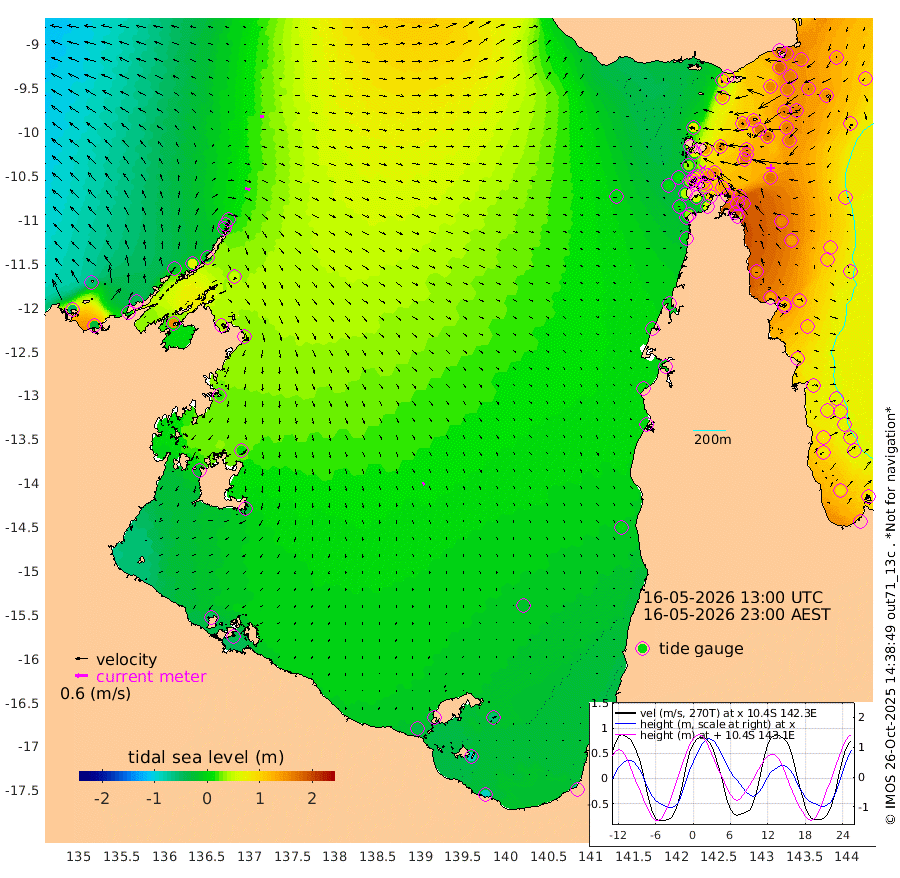 26cm/s 104T +3cm/s rms + 7cm/s -42T. ARA-GOC87 57m 15cm/s 154T +3cm/s rms + 2cm/s -2T. ARA-GOC87 60m 18cm/s 92T +2cm/s rms + 3cm/s 61T. ARA-GOC87 47m 177cm Daru 174cm Bobo Island 99cm Meer Island Barge 130cm Bramble Cay 165cm Unnamed Cay 163cm Pearce Cay 154cm Stephens Island 164cm Merrie England Shoals 176cm Mutacomal Reef 144cm Darnley Island Barge 104cm East Cay 159cm Yorke Island Barge 163cm Rennel Island 162cm Aureed Island 166cm Dungeness Reef 153cm Zagai Island 146cm Yam Island 101cm Dauan Island 95cm Saibai Island 125cm Phipi Reef 151cm Warrior Reef - West 77cm Mabuiag Island Barge 161cm Half Way Island 175cm Coconut Island 166cm Dugong Islet 159cm Poll Island 162cm Kirkcaldie Reef 152cm Suarji Island 152cm Sue Islet 31cm Hawkesbury Island 140cm Alert Patches 143cm Twin Island 48cm Badu Island 140cm St Pauls (Moa Island) 66cm Kubin (Moa Island) 108cm Ince Point 90cm Thursday Island 95cm Nardana Patches 72cm Turtle Head 61cm Round Island 34cm Goods Island 7cm Booby Island 14cm White Rocks Area 4cm Carpentaria 122cm Papou Point 43cm Bampfield Head 5cm Crab Island 9cm Red Wallis Island 54cm Packe Island 183cm Harrington Reef 33cm Herald Camp 39cm Sharp Point 55cm Red Island Point 110cm Possession Island 136cm Alpha Rock 159cm Frederick Point 180cm Wyborn Reef Light 177cm Tetley Island 96cm Triangle Reef 186cm Turtle Head Island 96cm Maclennan Cay 68cm Raine Island 152cm Mcsweeny Reef 141cm Collette Reef 99cm Shadwell Reef 154cm Hannibal Island 132cm Round Point -3cm Vrilya Point 119cm Cape Grenville 110cm Hicks Island 107cm Sir Charles Hardy Island 37cm Harvey Island 100cm Kay Reef 80cm Rocky Island 69cm Chapman Island 66cm Ham Reef 78cm Jubilee Reef 78cm Night Island 69cm Unnamed Reef No. 3 84cm Morris Island 79cm 1st 3 Mile Opening 80cm Creech Reef 78cm Fife Island 86cm Eden Reef 84cm Stanley Island 88cm Normanby River -52cm Yabooma Island -25cm Hutchison River -44cm Elcho Island -55cm North West Crocodile Island 7cm Cape Wessel -16cm Stevens Island 65cm Guluwuru Island -27cm Hopeful Bay -1cm Auster Point -8cm Two Island Bay 5cm Cadell Strait 153cm Mallison Island 43cm Melville Bay (Gove Harbour) 51cm Truant Island 41cm Cape Arnhem 20cm Cape Grey 11cm Hawk Island -22cm Milner Bay (Groote Eylandt) -27cm Cape Beatrice -49cm West Island -43cm Centre Island -28cm Mornington Island -33cm West Wellesley Islands -57cm Bountiful Island -84cm Albert River Mouth -90cm Sweers Island -79cm Karumba -20cm Nassau River Offshore 5cm Christmas Creek 4cm Archer River 11cm Boyd Point 0cm Weipa (Humbug Point) 10cm Pennefather River -4cm Cullen Point