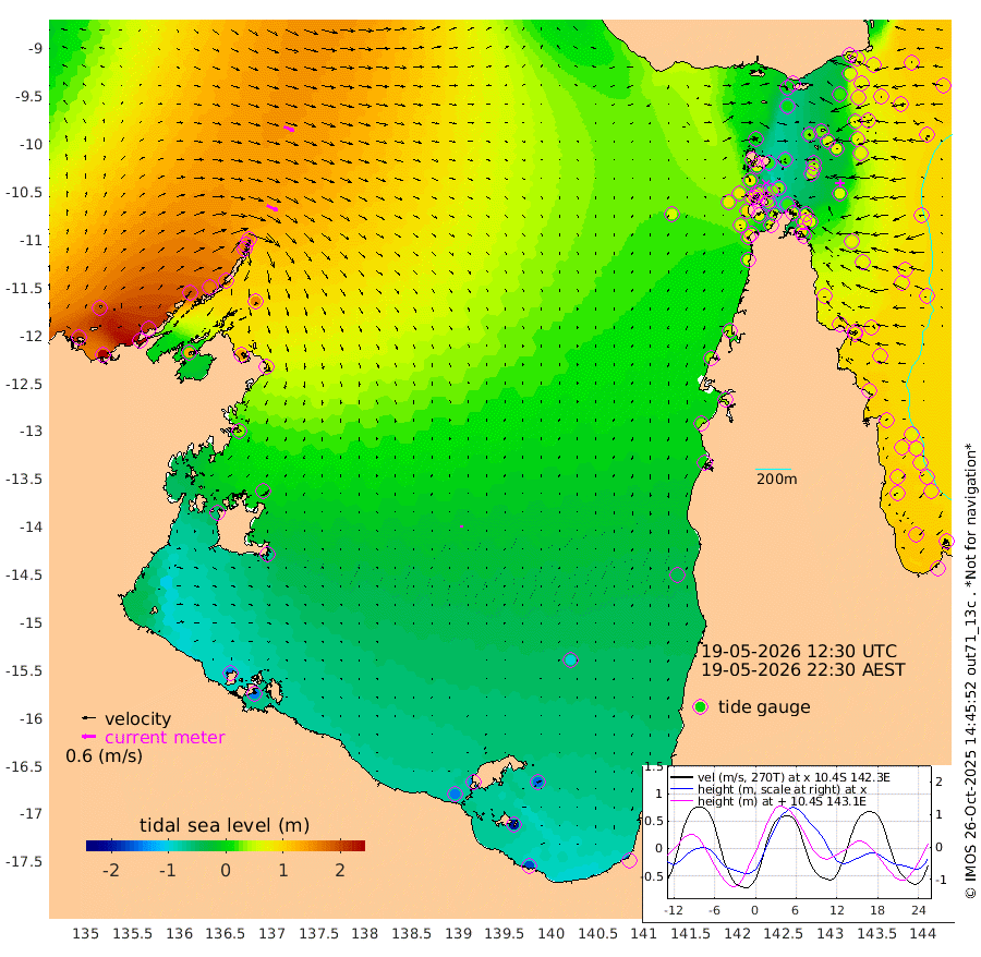 53cm/s 117T +3cm/s rms + 7cm/s -42T. ARA-GOC87 57m 8cm/s 149T +3cm/s rms + 2cm/s -2T. ARA-GOC87 60m 50cm/s 111T +2cm/s rms + 3cm/s 61T. ARA-GOC87 47m 60cm Daru 78cm Bobo Island 85cm Meer Island Barge 89cm Bramble Cay 75cm Unnamed Cay 92cm Pearce Cay 85cm Stephens Island 76cm Merrie England Shoals 58cm Mutacomal Reef 80cm Darnley Island Barge 91cm East Cay 68cm Yorke Island Barge 71cm Rennel Island 70cm Aureed Island 57cm Dungeness Reef 28cm Zagai Island 26cm Yam Island 4cm Dauan Island -5cm Saibai Island 7cm Phipi Reef 22cm Warrior Reef - West 9cm Mabuiag Island Barge 70cm Half Way Island 63cm Coconut Island 59cm Dugong Islet 42cm Poll Island 44cm Kirkcaldie Reef 21cm Suarji Island 28cm Sue Islet 81cm Hawkesbury Island 29cm Alert Patches 35cm Twin Island 72cm Badu Island 22cm St Pauls (Moa Island) 65cm Kubin (Moa Island) 33cm Ince Point 38cm Thursday Island 36cm Nardana Patches 56cm Turtle Head 62cm Round Island 83cm Goods Island 82cm Booby Island 82cm White Rocks Area 53cm Carpentaria 36cm Papou Point 96cm Bampfield Head 68cm Crab Island 75cm Red Wallis Island 69cm Packe Island 63cm Harrington Reef 65cm Herald Camp -14cm Sharp Point 53cm Red Island Point 42cm Possession Island 21cm Alpha Rock 46cm Frederick Point 64cm Wyborn Reef Light 57cm Tetley Island 73cm Triangle Reef 87cm Turtle Head Island 80cm Maclennan Cay 84cm Raine Island 72cm Mcsweeny Reef 71cm Collette Reef 72cm Shadwell Reef 81cm Hannibal Island 94cm Round Point 53cm Vrilya Point 78cm Cape Grenville 87cm Hicks Island 88cm Sir Charles Hardy Island 24cm Harvey Island 84cm Kay Reef 82cm Rocky Island 86cm Chapman Island 80cm Ham Reef 83cm Jubilee Reef 73cm Night Island 82cm Unnamed Reef No. 3 88cm Morris Island 86cm 1st 3 Mile Opening 85cm Creech Reef 80cm Fife Island 107cm Eden Reef 85cm Stanley Island 97cm Normanby River 204cm Yabooma Island 254cm Hutchison River 205cm Elcho Island 188cm North West Crocodile Island 156cm Cape Wessel 189cm Stevens Island 162cm Guluwuru Island 165cm Hopeful Bay 164cm Auster Point 167cm Two Island Bay 229cm Cadell Strait 127cm Mallison Island 136cm Melville Bay (Gove Harbour) 151cm Truant Island 88cm Cape Arnhem 33cm Cape Grey 2cm Hawk Island -59cm Milner Bay (Groote Eylandt) -72cm Cape Beatrice -146cm West Island -143cm Centre Island -138cm Mornington Island -144cm West Wellesley Islands -157cm Bountiful Island -169cm Albert River Mouth -195cm Sweers Island -171cm Karumba -94cm Nassau River Offshore -43cm Christmas Creek 11cm Archer River 26cm Boyd Point 33cm Weipa (Humbug Point) 32cm Pennefather River 40cm Cullen Point