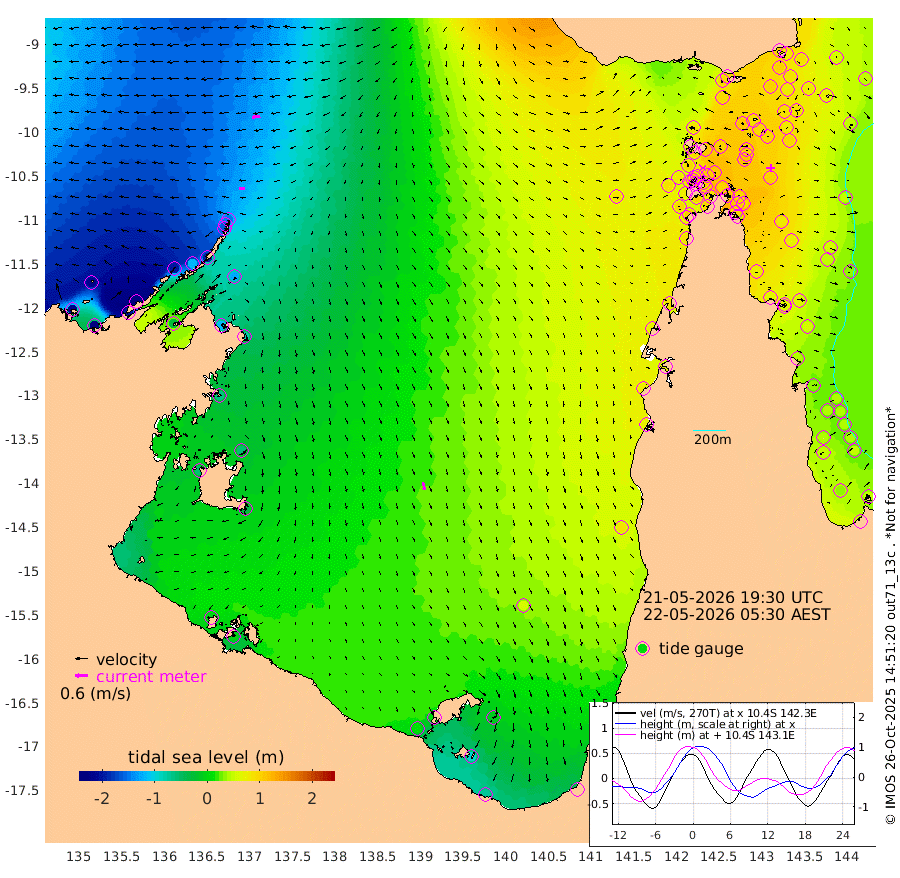 26cm/s -92T +3cm/s rms + 7cm/s -42T. ARA-GOC87 57m 38cm/s 166T +3cm/s rms + 2cm/s -2T. ARA-GOC87 60m 40cm/s -98T +2cm/s rms + 3cm/s 61T. ARA-GOC87 47m 99cm Daru 80cm Bobo Island 47cm Meer Island Barge 59cm Bramble Cay 84cm Unnamed Cay 75cm Pearce Cay 78cm Stephens Island 85cm Merrie England Shoals 99cm Mutacomal Reef 73cm Darnley Island Barge 52cm East Cay 84cm Yorke Island Barge 90cm Rennel Island 81cm Aureed Island 97cm Dungeness Reef 89cm Zagai Island 106cm Yam Island 96cm Dauan Island 92cm Saibai Island 96cm Phipi Reef 105cm Warrior Reef - West 87cm Mabuiag Island Barge 94cm Half Way Island 92cm Coconut Island 105cm Dugong Islet 99cm Poll Island 116cm Kirkcaldie Reef 100cm Suarji Island 103cm Sue Islet 96cm Hawkesbury Island 112cm Alert Patches 109cm Twin Island 85cm Badu Island 112cm St Pauls (Moa Island) 95cm Kubin (Moa Island) 106cm Ince Point 105cm Thursday Island 104cm Nardana Patches 101cm Turtle Head 83cm Round Island 88cm Goods Island 89cm Booby Island 81cm White Rocks Area 88cm Carpentaria 92cm Papou Point 79cm Bampfield Head 81cm Crab Island 94cm Red Wallis Island 104cm Packe Island 108cm Harrington Reef 107cm Herald Camp 38cm Sharp Point 92cm Red Island Point 89cm Possession Island 101cm Alpha Rock 108cm Frederick Point 92cm Wyborn Reef Light 95cm Tetley Island 49cm Triangle Reef 95cm Turtle Head Island 55cm Maclennan Cay 34cm Raine Island 82cm Mcsweeny Reef 74cm Collette Reef 52cm Shadwell Reef 75cm Hannibal Island 62cm Round Point 88cm Vrilya Point 65cm Cape Grenville 56cm Hicks Island 64cm Sir Charles Hardy Island 21cm Harvey Island 53cm Kay Reef 42cm Rocky Island 35cm Chapman Island 39cm Ham Reef 42cm Jubilee Reef 43cm Night Island 41cm Unnamed Reef No. 3 43cm Morris Island 40cm 1st 3 Mile Opening 45cm Creech Reef 48cm Fife Island 35cm Eden Reef 48cm Stanley Island 44cm Normanby River -214cm Yabooma Island -252cm Hutchison River -229cm Elcho Island -217cm North West Crocodile Island -144cm Cape Wessel -201cm Stevens Island -117cm Guluwuru Island -188cm Hopeful Bay -164cm Auster Point -160cm Two Island Bay -197cm Cadell Strait -29cm Mallison Island -116cm Melville Bay (Gove Harbour) -120cm Truant Island -77cm Cape Arnhem -62cm Cape Grey -59cm Hawk Island -55cm Milner Bay (Groote Eylandt) -36cm Cape Beatrice -1cm West Island -7cm Centre Island 9cm Mornington Island 13cm West Wellesley Islands -10cm Bountiful Island -71cm Albert River Mouth -91cm Sweers Island -45cm Karumba 56cm Nassau River Offshore 86cm Christmas Creek 74cm Archer River 78cm Boyd Point 74cm Weipa (Humbug Point) 72cm Pennefather River 84cm Cullen Point