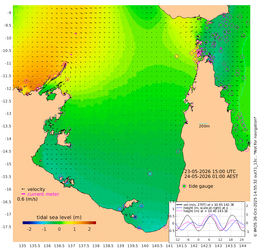 30cm/s 118T +3cm/s rms + 7cm/s -42T. ARA-GOC87 57m 4cm/s 86T +3cm/s rms + 2cm/s -2T. ARA-GOC87 60m 31cm/s 111T +2cm/s rms + 3cm/s 61T. ARA-GOC87 47m -35cm Daru -28cm Bobo Island 0cm Meer Island Barge -11cm Bramble Cay -25cm Unnamed Cay -22cm Pearce Cay -25cm Stephens Island -33cm Merrie England Shoals -34cm Mutacomal Reef -19cm Darnley Island Barge -2cm East Cay -24cm Yorke Island Barge -29cm Rennel Island -27cm Aureed Island -27cm Dungeness Reef -10cm Zagai Island -10cm Yam Island 27cm Dauan Island 27cm Saibai Island 2cm Phipi Reef -12cm Warrior Reef - West 32cm Mabuiag Island Barge -34cm Half Way Island -27cm Coconut Island -34cm Dugong Islet -22cm Poll Island -32cm Kirkcaldie Reef -14cm Suarji Island -20cm Sue Islet 92cm Hawkesbury Island -8cm Alert Patches -8cm Twin Island 78cm Badu Island -7cm St Pauls (Moa Island) 60cm Kubin (Moa Island) 13cm Ince Point 26cm Thursday Island 24cm Nardana Patches 46cm Turtle Head 71cm Round Island 81cm Goods Island 93cm Booby Island 88cm White Rocks Area 72cm Carpentaria 3cm Papou Point 116cm Bampfield Head 69cm Crab Island 83cm Red Wallis Island 61cm Packe Island -43cm Harrington Reef 92cm Herald Camp -15cm Sharp Point 39cm Red Island Point 21cm Possession Island -11cm Alpha Rock -21cm Frederick Point -24cm Wyborn Reef Light -22cm Tetley Island 5cm Triangle Reef -25cm Turtle Head Island 0cm Maclennan Cay 13cm Raine Island -26cm Mcsweeny Reef -20cm Collette Reef -2cm Shadwell Reef -24cm Hannibal Island -11cm Round Point 53cm Vrilya Point -13cm Cape Grenville -4cm Hicks Island 10cm Sir Charles Hardy Island -5cm Harvey Island -2cm Kay Reef 8cm Rocky Island 19cm Chapman Island 16cm Ham Reef 9cm Jubilee Reef 0cm Night Island 11cm Unnamed Reef No. 3 5cm Morris Island 12cm 1st 3 Mile Opening 6cm Creech Reef -4cm Fife Island 13cm Eden Reef 3cm Stanley Island 2cm Normanby River 169cm Yabooma Island 184cm Hutchison River 156cm Elcho Island 146cm North West Crocodile Island 121cm Cape Wessel 144cm Stevens Island 101cm Guluwuru Island 135cm Hopeful Bay 126cm Auster Point 128cm Two Island Bay 153cm Cadell Strait 87cm Mallison Island 90cm Melville Bay (Gove Harbour) 102cm Truant Island 57cm Cape Arnhem 16cm Cape Grey -4cm Hawk Island -41cm Milner Bay (Groote Eylandt) -59cm Cape Beatrice -109cm West Island -107cm Centre Island -123cm Mornington Island -120cm West Wellesley Islands -116cm Bountiful Island -137cm Albert River Mouth -151cm Sweers Island -142cm Karumba -89cm Nassau River Offshore -46cm Christmas Creek 5cm Archer River 27cm Boyd Point 37cm Weipa (Humbug Point) 17cm Pennefather River 56cm Cullen Point