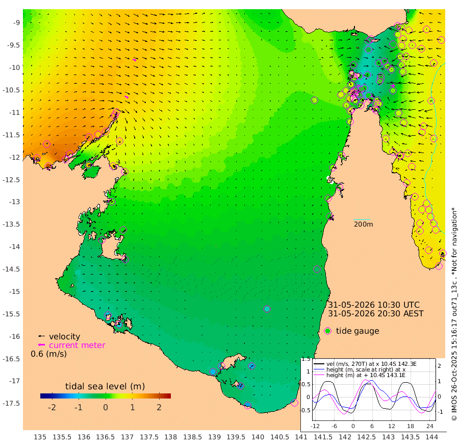 34cm/s 119T +3cm/s rms + 7cm/s -42T. ARA-GOC87 57m 3cm/s 68T +3cm/s rms + 2cm/s -2T. ARA-GOC87 60m 33cm/s 113T +2cm/s rms + 3cm/s 61T. ARA-GOC87 47m 37cm Daru 45cm Bobo Island 62cm Meer Island Barge 71cm Bramble Cay 60cm Unnamed Cay 53cm Pearce Cay 59cm Stephens Island 69cm Merrie England Shoals 46cm Mutacomal Reef 55cm Darnley Island Barge 69cm East Cay 42cm Yorke Island Barge 47cm Rennel Island 33cm Aureed Island 23cm Dungeness Reef -8cm Zagai Island -9cm Yam Island -39cm Dauan Island -38cm Saibai Island -25cm Phipi Reef -19cm Warrior Reef - West -11cm Mabuiag Island Barge 41cm Half Way Island 36cm Coconut Island 28cm Dugong Islet 10cm Poll Island 16cm Kirkcaldie Reef -12cm Suarji Island 5cm Sue Islet 62cm Hawkesbury Island 10cm Alert Patches 6cm Twin Island 45cm Badu Island -10cm St Pauls (Moa Island) 36cm Kubin (Moa Island) 7cm Ince Point 14cm Thursday Island 11cm Nardana Patches 29cm Turtle Head 54cm Round Island 56cm Goods Island 61cm Booby Island 58cm White Rocks Area 43cm Carpentaria 5cm Papou Point 93cm Bampfield Head 54cm Crab Island 50cm Red Wallis Island 42cm Packe Island 34cm Harrington Reef 51cm Herald Camp -17cm Sharp Point 30cm Red Island Point 28cm Possession Island 7cm Alpha Rock 19cm Frederick Point 49cm Wyborn Reef Light 42cm Tetley Island 51cm Triangle Reef 63cm Turtle Head Island 55cm Maclennan Cay 66cm Raine Island 52cm Mcsweeny Reef 58cm Collette Reef 61cm Shadwell Reef 67cm Hannibal Island 78cm Round Point 48cm Vrilya Point 67cm Cape Grenville 66cm Hicks Island 62cm Sir Charles Hardy Island 19cm Harvey Island 76cm Kay Reef 66cm Rocky Island 68cm Chapman Island 64cm Ham Reef 65cm Jubilee Reef 57cm Night Island 65cm Unnamed Reef No. 3 71cm Morris Island 67cm 1st 3 Mile Opening 65cm Creech Reef 62cm Fife Island 84cm Eden Reef 73cm Stanley Island 77cm Normanby River 156cm Yabooma Island 191cm Hutchison River 160cm Elcho Island 145cm North West Crocodile Island 109cm Cape Wessel 152cm Stevens Island 108cm Guluwuru Island 140cm Hopeful Bay 126cm Auster Point 121cm Two Island Bay 154cm Cadell Strait 121cm Mallison Island 95cm Melville Bay (Gove Harbour) 105cm Truant Island 59cm Cape Arnhem 24cm Cape Grey 9cm Hawk Island -38cm Milner Bay (Groote Eylandt) -50cm Cape Beatrice -106cm West Island -100cm Centre Island -106cm Mornington Island -115cm West Wellesley Islands -127cm Bountiful Island -134cm Albert River Mouth -135cm Sweers Island -128cm Karumba -84cm Nassau River Offshore -46cm Christmas Creek 9cm Archer River 17cm Boyd Point 21cm Weipa (Humbug Point) 35cm Pennefather River 32cm Cullen Point