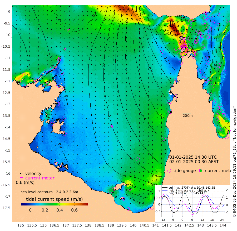 26cm/s 51T +3cm/s rms + 7cm/s -42T. ARA-GOC87 57m 23cm/s -8T +3cm/s rms + 2cm/s -2T. ARA-GOC87 60m 34cm/s 48T +2cm/s rms + 3cm/s 61T. ARA-GOC87 47m 35cm Daru 36cm Bobo Island -14cm Meer Island Barge 8cm Bramble Cay 26cm Unnamed Cay 24cm Pearce Cay 14cm Stephens Island 28cm Merrie England Shoals 38cm Mutacomal Reef 13cm Darnley Island Barge -15cm East Cay 25cm Yorke Island Barge 18cm Rennel Island 26cm Aureed Island 18cm Dungeness Reef 23cm Zagai Island 7cm Yam Island -24cm Dauan Island -11cm Saibai Island -9cm Phipi Reef 15cm Warrior Reef - West -41cm Mabuiag Island Barge 19cm Half Way Island 23cm Coconut Island 19cm Dugong Islet 17cm Poll Island 9cm Kirkcaldie Reef 1cm Suarji Island 22cm Sue Islet -164cm Hawkesbury Island -22cm Alert Patches -15cm Twin Island -134cm Badu Island -12cm St Pauls (Moa Island) -122cm Kubin (Moa Island) -53cm Ince Point -78cm Thursday Island -71cm Nardana Patches -115cm Turtle Head -135cm Round Island -171cm Goods Island -205cm Booby Island -185cm White Rocks Area -187cm Carpentaria -20cm Papou Point -213cm Bampfield Head -174cm Crab Island -193cm Red Wallis Island -150cm Packe Island 26cm Harrington Reef -192cm Herald Camp 10cm Sharp Point -99cm Red Island Point -59cm Possession Island 3cm Alpha Rock 5cm Frederick Point 35cm Wyborn Reef Light 32cm Tetley Island -15cm Triangle Reef 23cm Turtle Head Island -24cm Maclennan Cay -36cm Raine Island 19cm Mcsweeny Reef 15cm Collette Reef -11cm Shadwell Reef 20cm Hannibal Island 4cm Round Point -166cm Vrilya Point -5cm Cape Grenville -13cm Hicks Island -28cm Sir Charles Hardy Island -2cm Harvey Island -16cm Kay Reef -27cm Rocky Island -33cm Chapman Island -35cm Ham Reef -29cm Jubilee Reef -25cm Night Island -36cm Unnamed Reef No. 3 -29cm Morris Island -39cm 1st 3 Mile Opening -34cm Creech Reef -22cm Fife Island -34cm Eden Reef -29cm Stanley Island -22cm Normanby River 13cm Yabooma Island 21cm Hutchison River 19cm Elcho Island 22cm North West Crocodile Island 38cm Cape Wessel 51cm Stevens Island 60cm Guluwuru Island 37cm Hopeful Bay 38cm Auster Point 34cm Two Island Bay 58cm Cadell Strait 149cm Mallison Island 58cm Melville Bay (Gove Harbour) 55cm Truant Island 46cm Cape Arnhem 62cm Cape Grey 66cm Hawk Island 83cm Milner Bay (Groote Eylandt) 74cm Cape Beatrice 85cm West Island 81cm Centre Island 86cm Mornington Island 89cm West Wellesley Islands 107cm Bountiful Island 141cm Albert River Mouth 182cm Sweers Island 126cm Karumba 25cm Nassau River Offshore -37cm Christmas Creek -89cm Archer River -113cm Boyd Point -127cm Weipa (Humbug Point) -107cm Pennefather River -159cm Cullen Point