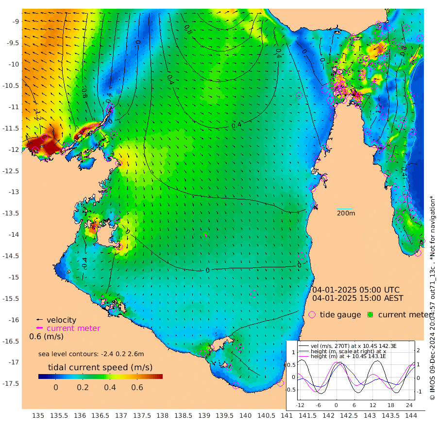 7cm/s 105T +3cm/s rms + 7cm/s -42T. ARA-GOC87 57m 35cm/s 163T +3cm/s rms + 2cm/s -2T. ARA-GOC87 60m 5cm/s -84T +2cm/s rms + 3cm/s 61T. ARA-GOC87 47m 136cm Daru 121cm Bobo Island 63cm Meer Island Barge 84cm Bramble Cay 115cm Unnamed Cay 107cm Pearce Cay 105cm Stephens Island 110cm Merrie England Shoals 133cm Mutacomal Reef 100cm Darnley Island Barge 68cm East Cay 116cm Yorke Island Barge 119cm Rennel Island 113cm Aureed Island 124cm Dungeness Reef 133cm Zagai Island 139cm Yam Island 136cm Dauan Island 132cm Saibai Island 117cm Phipi Reef 147cm Warrior Reef - West 101cm Mabuiag Island Barge 118cm Half Way Island 125cm Coconut Island 130cm Dugong Islet 129cm Poll Island 135cm Kirkcaldie Reef 118cm Suarji Island 134cm Sue Islet 71cm Hawkesbury Island 119cm Alert Patches 125cm Twin Island 72cm Badu Island 130cm St Pauls (Moa Island) 87cm Kubin (Moa Island) 109cm Ince Point 97cm Thursday Island 100cm Nardana Patches 85cm Turtle Head 66cm Round Island 56cm Goods Island 39cm Booby Island 38cm White Rocks Area 36cm Carpentaria 111cm Papou Point 44cm Bampfield Head 35cm Crab Island 49cm Red Wallis Island 79cm Packe Island 132cm Harrington Reef 70cm Herald Camp 41cm Sharp Point 70cm Red Island Point 86cm Possession Island 125cm Alpha Rock 130cm Frederick Point 134cm Wyborn Reef Light 137cm Tetley Island 68cm Triangle Reef 128cm Turtle Head Island 67cm Maclennan Cay 42cm Raine Island 109cm Mcsweeny Reef 98cm Collette Reef 68cm Shadwell Reef 101cm Hannibal Island 85cm Round Point 32cm Vrilya Point 77cm Cape Grenville 72cm Hicks Island 84cm Sir Charles Hardy Island 25cm Harvey Island 63cm Kay Reef 51cm Rocky Island 44cm Chapman Island 47cm Ham Reef 53cm Jubilee Reef 49cm Night Island 47cm Unnamed Reef No. 3 51cm Morris Island 46cm 1st 3 Mile Opening 51cm Creech Reef 60cm Fife Island 46cm Eden Reef 53cm Stanley Island 54cm Normanby River -95cm Yabooma Island -103cm Hutchison River -107cm Elcho Island -106cm North West Crocodile Island -24cm Cape Wessel -68cm Stevens Island 25cm Guluwuru Island -76cm Hopeful Bay -50cm Auster Point -41cm Two Island Bay -37cm Cadell Strait 184cm Mallison Island 3cm Melville Bay (Gove Harbour) 9cm Truant Island 10cm Cape Arnhem -13cm Cape Grey -27cm Hawk Island -57cm Milner Bay (Groote Eylandt) -50cm Cape Beatrice -61cm West Island -71cm Centre Island -47cm Mornington Island -42cm West Wellesley Islands -73cm Bountiful Island -119cm Albert River Mouth -151cm Sweers Island -109cm Karumba -6cm Nassau River Offshore 32cm Christmas Creek 26cm Archer River 41cm Boyd Point 31cm Weipa (Humbug Point) 24cm Pennefather River 36cm Cullen Point