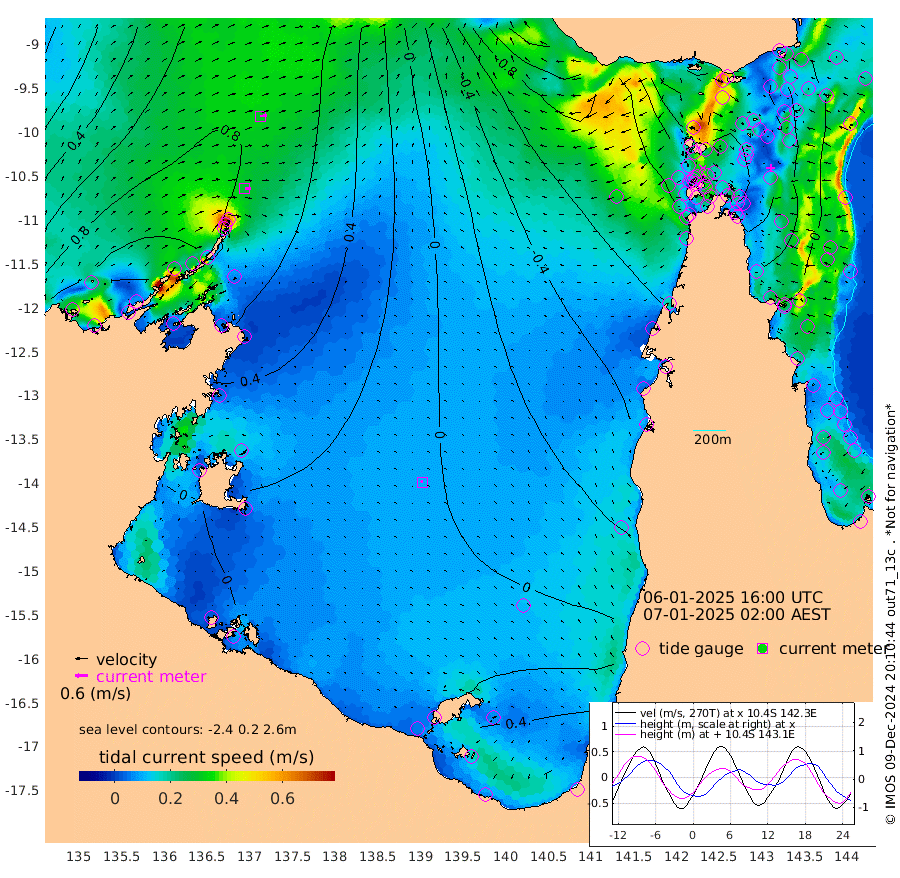 28cm/s 97T +3cm/s rms + 7cm/s -42T. ARA-GOC87 57m 10cm/s -58T +3cm/s rms + 2cm/s -2T. ARA-GOC87 60m 30cm/s 81T +2cm/s rms + 3cm/s 61T. ARA-GOC87 47m -23cm Daru -14cm Bobo Island 9cm Meer Island Barge 0cm Bramble Cay -20cm Unnamed Cay -3cm Pearce Cay -7cm Stephens Island -19cm Merrie England Shoals -37cm Mutacomal Reef -3cm Darnley Island Barge 4cm East Cay -14cm Yorke Island Barge -23cm Rennel Island -13cm Aureed Island -27cm Dungeness Reef -43cm Zagai Island -61cm Yam Island -42cm Dauan Island -59cm Saibai Island -34cm Phipi Reef -41cm Warrior Reef - West -73cm Mabuiag Island Barge -24cm Half Way Island -34cm Coconut Island -35cm Dugong Islet -45cm Poll Island -53cm Kirkcaldie Reef -60cm Suarji Island -52cm Sue Islet -101cm Hawkesbury Island -69cm Alert Patches -69cm Twin Island -78cm Badu Island -69cm St Pauls (Moa Island) -81cm Kubin (Moa Island) -75cm Ince Point -80cm Thursday Island -78cm Nardana Patches -76cm Turtle Head -89cm Round Island -83cm Goods Island -97cm Booby Island -96cm White Rocks Area -114cm Carpentaria -69cm Papou Point -111cm Bampfield Head -79cm Crab Island -98cm Red Wallis Island -85cm Packe Island -40cm Harrington Reef -110cm Herald Camp -25cm Sharp Point -80cm Red Island Point -72cm Possession Island -70cm Alpha Rock -55cm Frederick Point -36cm Wyborn Reef Light -43cm Tetley Island -3cm Triangle Reef -28cm Turtle Head Island -3cm Maclennan Cay 12cm Raine Island -12cm Mcsweeny Reef -10cm Collette Reef 2cm Shadwell Reef -7cm Hannibal Island 0cm Round Point -81cm Vrilya Point -9cm Cape Grenville 1cm Hicks Island -10cm Sir Charles Hardy Island -1cm Harvey Island -5cm Kay Reef 7cm Rocky Island 9cm Chapman Island 3cm Ham Reef 7cm Jubilee Reef 9cm Night Island 4cm Unnamed Reef No. 3 9cm Morris Island 11cm 1st 3 Mile Opening 7cm Creech Reef 21cm Fife Island 19cm Eden Reef 6cm Stanley Island 9cm Normanby River 110cm Yabooma Island 137cm Hutchison River 119cm Elcho Island 108cm North West Crocodile Island 76cm Cape Wessel 114cm Stevens Island 92cm Guluwuru Island 104cm Hopeful Bay 92cm Auster Point 92cm Two Island Bay 147cm Cadell Strait 112cm Mallison Island 92cm Melville Bay (Gove Harbour) 92cm Truant Island 67cm Cape Arnhem 50cm Cape Grey 48cm Hawk Island 34cm Milner Bay (Groote Eylandt) 28cm Cape Beatrice 1cm West Island -1cm Centre Island 41cm Mornington Island 37cm West Wellesley Islands 55cm Bountiful Island 98cm Albert River Mouth 118cm Sweers Island 87cm Karumba 26cm Nassau River Offshore -2cm Christmas Creek -23cm Archer River -43cm Boyd Point -38cm Weipa (Humbug Point) -40cm Pennefather River -76cm Cullen Point