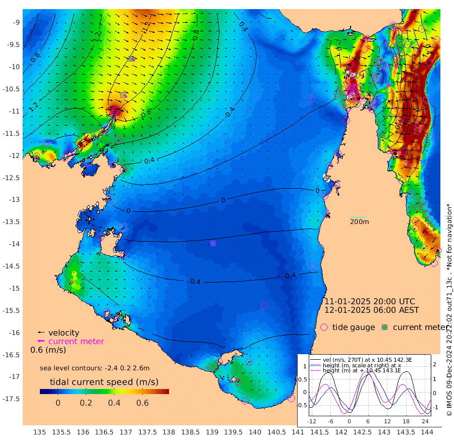 38cm/s 120T +3cm/s rms + 7cm/s -42T. ARA-GOC87 57m 5cm/s 111T +3cm/s rms + 2cm/s -2T. ARA-GOC87 60m 37cm/s 117T +2cm/s rms + 3cm/s 61T. ARA-GOC87 47m -67cm Daru -48cm Bobo Island 28cm Meer Island Barge 7cm Bramble Cay -36cm Unnamed Cay -29cm Pearce Cay -18cm Stephens Island -28cm Merrie England Shoals -68cm Mutacomal Reef -10cm Darnley Island Barge 27cm East Cay -39cm Yorke Island Barge -48cm Rennel Island -48cm Aureed Island -74cm Dungeness Reef -100cm Zagai Island -107cm Yam Island -106cm Dauan Island -99cm Saibai Island -115cm Phipi Reef -111cm Warrior Reef - West -76cm Mabuiag Island Barge -48cm Half Way Island -67cm Coconut Island -68cm Dugong Islet -90cm Poll Island -88cm Kirkcaldie Reef -116cm Suarji Island -88cm Sue Islet 14cm Hawkesbury Island -90cm Alert Patches -92cm Twin Island -2cm Badu Island -107cm St Pauls (Moa Island) -23cm Kubin (Moa Island) -73cm Ince Point -56cm Thursday Island -62cm Nardana Patches -29cm Turtle Head -15cm Round Island 22cm Goods Island 46cm Booby Island 31cm White Rocks Area 50cm Carpentaria -80cm Papou Point 44cm Bampfield Head 41cm Crab Island 32cm Red Wallis Island -8cm Packe Island -75cm Harrington Reef 0cm Herald Camp -47cm Sharp Point -21cm Red Island Point -60cm Possession Island -90cm Alpha Rock -84cm Frederick Point -65cm Wyborn Reef Light -73cm Tetley Island 11cm Triangle Reef -47cm Turtle Head Island 18cm Maclennan Cay 48cm Raine Island -29cm Mcsweeny Reef -17cm Collette Reef 18cm Shadwell Reef -13cm Hannibal Island 10cm Round Point 48cm Vrilya Point 8cm Cape Grenville 17cm Hicks Island 19cm Sir Charles Hardy Island 1cm Harvey Island 32cm Kay Reef 38cm Rocky Island 49cm Chapman Island 48cm Ham Reef 43cm Jubilee Reef 31cm Night Island 48cm Unnamed Reef No. 3 44cm Morris Island 45cm 1st 3 Mile Opening 43cm Creech Reef 39cm Fife Island 64cm Eden Reef 44cm Stanley Island 46cm Normanby River 153cm Yabooma Island 184cm Hutchison River 162cm Elcho Island 146cm North West Crocodile Island 116cm Cape Wessel 144cm Stevens Island 108cm Guluwuru Island 136cm Hopeful Bay 124cm Auster Point 126cm Two Island Bay 165cm Cadell Strait 120cm Mallison Island 93cm Melville Bay (Gove Harbour) 103cm Truant Island 59cm Cape Arnhem 20cm Cape Grey -4cm Hawk Island -41cm Milner Bay (Groote Eylandt) -52cm Cape Beatrice -104cm West Island -103cm Centre Island -118cm Mornington Island -123cm West Wellesley Islands -136cm Bountiful Island -138cm Albert River Mouth -142cm Sweers Island -142cm Karumba -90cm Nassau River Offshore -54cm Christmas Creek 7cm Archer River 17cm Boyd Point 22cm Weipa (Humbug Point) 33cm Pennefather River 31cm Cullen Point