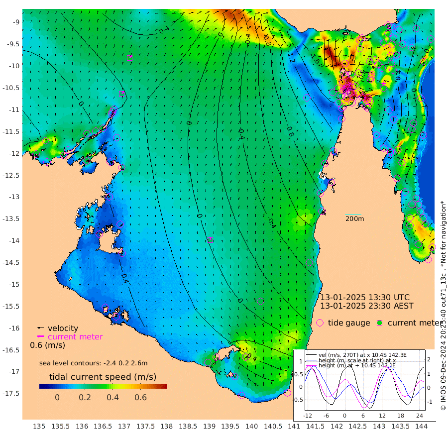 24cm/s 43T +3cm/s rms + 7cm/s -42T. ARA-GOC87 57m 26cm/s -5T +3cm/s rms + 2cm/s -2T. ARA-GOC87 60m 31cm/s 44T +2cm/s rms + 3cm/s 61T. ARA-GOC87 47m 49cm Daru 56cm Bobo Island 2cm Meer Island Barge 23cm Bramble Cay 41cm Unnamed Cay 47cm Pearce Cay 38cm Stephens Island 43cm Merrie England Shoals 52cm Mutacomal Reef 32cm Darnley Island Barge 3cm East Cay 42cm Yorke Island Barge 39cm Rennel Island 50cm Aureed Island 36cm Dungeness Reef 26cm Zagai Island 16cm Yam Island -44cm Dauan Island -36cm Saibai Island -29cm Phipi Reef 16cm Warrior Reef - West -58cm Mabuiag Island Barge 45cm Half Way Island 40cm Coconut Island 45cm Dugong Islet 33cm Poll Island 25cm Kirkcaldie Reef 15cm Suarji Island 26cm Sue Islet -175cm Hawkesbury Island -18cm Alert Patches -3cm Twin Island -155cm Badu Island -4cm St Pauls (Moa Island) -117cm Kubin (Moa Island) -48cm Ince Point -74cm Thursday Island -68cm Nardana Patches -115cm Turtle Head -133cm Round Island -174cm Goods Island -206cm Booby Island -181cm White Rocks Area -176cm Carpentaria -11cm Papou Point -206cm Bampfield Head -178cm Crab Island -187cm Red Wallis Island -140cm Packe Island 55cm Harrington Reef -182cm Herald Camp 9cm Sharp Point -105cm Red Island Point -51cm Possession Island 12cm Alpha Rock 21cm Frederick Point 49cm Wyborn Reef Light 45cm Tetley Island -2cm Triangle Reef 43cm Turtle Head Island -4cm Maclennan Cay -26cm Raine Island 37cm Mcsweeny Reef 28cm Collette Reef -3cm Shadwell Reef 35cm Hannibal Island 21cm Round Point -169cm Vrilya Point 13cm Cape Grenville 6cm Hicks Island -10cm Sir Charles Hardy Island 5cm Harvey Island -3cm Kay Reef -15cm Rocky Island -24cm Chapman Island -26cm Ham Reef -18cm Jubilee Reef -8cm Night Island -24cm Unnamed Reef No. 3 -14cm Morris Island -26cm 1st 3 Mile Opening -19cm Creech Reef -4cm Fife Island -18cm Eden Reef -14cm Stanley Island -1cm Normanby River 2cm Yabooma Island 5cm Hutchison River 6cm Elcho Island 8cm North West Crocodile Island 37cm Cape Wessel 34cm Stevens Island 45cm Guluwuru Island 22cm Hopeful Bay 30cm Auster Point 34cm Two Island Bay 38cm Cadell Strait 86cm Mallison Island 44cm Melville Bay (Gove Harbour) 44cm Truant Island 38cm Cape Arnhem 49cm Cape Grey 58cm Hawk Island 82cm Milner Bay (Groote Eylandt) 74cm Cape Beatrice 93cm West Island 91cm Centre Island 81cm Mornington Island 85cm West Wellesley Islands 88cm Bountiful Island 120cm Albert River Mouth 155cm Sweers Island 105cm Karumba 19cm Nassau River Offshore -42cm Christmas Creek -100cm Archer River -117cm Boyd Point -134cm Weipa (Humbug Point) -116cm Pennefather River -156cm Cullen Point