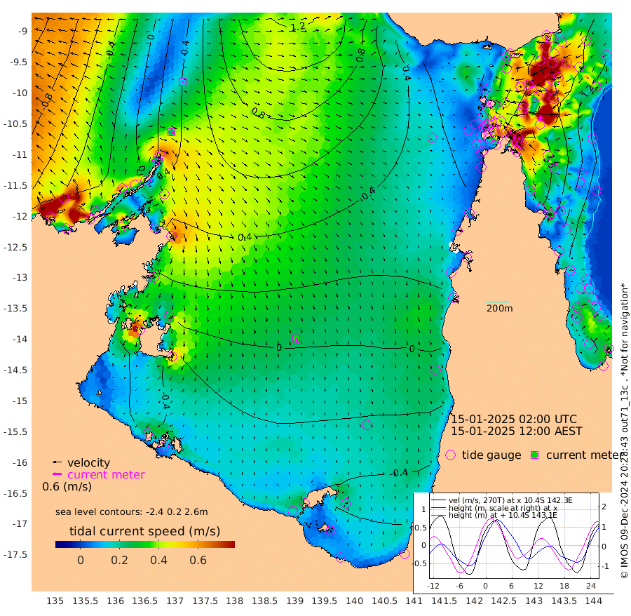 24cm/s 116T +3cm/s rms + 7cm/s -42T. ARA-GOC87 57m 36cm/s 165T +3cm/s rms + 2cm/s -2T. ARA-GOC87 60m 13cm/s 113T +2cm/s rms + 3cm/s 61T. ARA-GOC87 47m 177cm Daru 181cm Bobo Island 117cm Meer Island Barge 145cm Bramble Cay 169cm Unnamed Cay 185cm Pearce Cay 167cm Stephens Island 166cm Merrie England Shoals 178cm Mutacomal Reef 157cm Darnley Island Barge 130cm East Cay 167cm Yorke Island Barge 175cm Rennel Island 175cm Aureed Island 172cm Dungeness Reef 148cm Zagai Island 150cm Yam Island 121cm Dauan Island 112cm Saibai Island 117cm Phipi Reef 158cm Warrior Reef - West 99cm Mabuiag Island Barge 171cm Half Way Island 175cm Coconut Island 180cm Dugong Islet 165cm Poll Island 164cm Kirkcaldie Reef 153cm Suarji Island 156cm Sue Islet 105cm Hawkesbury Island 149cm Alert Patches 155cm Twin Island 95cm Badu Island 149cm St Pauls (Moa Island) 113cm Kubin (Moa Island) 130cm Ince Point 118cm Thursday Island 120cm Nardana Patches 112cm Turtle Head 94cm Round Island 92cm Goods Island 70cm Booby Island 79cm White Rocks Area 48cm Carpentaria 133cm Papou Point 88cm Bampfield Head 50cm Crab Island 78cm Red Wallis Island 108cm Packe Island 191cm Harrington Reef 91cm Herald Camp 33cm Sharp Point 97cm Red Island Point 121cm Possession Island 144cm Alpha Rock 170cm Frederick Point 183cm Wyborn Reef Light 181cm Tetley Island 119cm Triangle Reef 193cm Turtle Head Island 120cm Maclennan Cay 90cm Raine Island 164cm Mcsweeny Reef 150cm Collette Reef 113cm Shadwell Reef 160cm Hannibal Island 153cm Round Point 39cm Vrilya Point 134cm Cape Grenville 130cm Hicks Island 137cm Sir Charles Hardy Island 42cm Harvey Island 120cm Kay Reef 104cm Rocky Island 102cm Chapman Island 97cm Ham Reef 102cm Jubilee Reef 97cm Night Island 100cm Unnamed Reef No. 3 107cm Morris Island 97cm 1st 3 Mile Opening 105cm Creech Reef 113cm Fife Island 115cm Eden Reef 107cm Stanley Island 120cm Normanby River 3cm Yabooma Island 20cm Hutchison River -9cm Elcho Island -14cm North West Crocodile Island 47cm Cape Wessel 16cm Stevens Island 79cm Guluwuru Island 6cm Hopeful Bay 31cm Auster Point 32cm Two Island Bay 58cm Cadell Strait 156cm Mallison Island 57cm Melville Bay (Gove Harbour) 69cm Truant Island 43cm Cape Arnhem 4cm Cape Grey -14cm Hawk Island -73cm Milner Bay (Groote Eylandt) -70cm Cape Beatrice -108cm West Island -113cm Centre Island -92cm Mornington Island -85cm West Wellesley Islands -117cm Bountiful Island -179cm Albert River Mouth -199cm Sweers Island -165cm Karumba -41cm Nassau River Offshore 10cm Christmas Creek 28cm Archer River 46cm Boyd Point 39cm Weipa (Humbug Point) 28cm Pennefather River 40cm Cullen Point