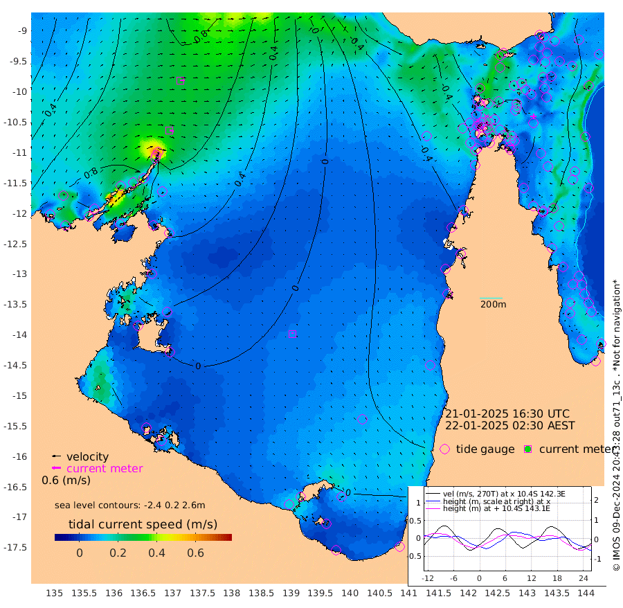 29cm/s 100T +3cm/s rms + 7cm/s -42T. ARA-GOC87 57m 6cm/s -5T +3cm/s rms + 2cm/s -2T. ARA-GOC87 60m 30cm/s 87T +2cm/s rms + 3cm/s 61T. ARA-GOC87 47m -23cm Daru -23cm Bobo Island -16cm Meer Island Barge -19cm Bramble Cay -27cm Unnamed Cay -24cm Pearce Cay -28cm Stephens Island -26cm Merrie England Shoals -32cm Mutacomal Reef -22cm Darnley Island Barge -22cm East Cay -24cm Yorke Island Barge -33cm Rennel Island -30cm Aureed Island -33cm Dungeness Reef -23cm Zagai Island -40cm Yam Island -13cm Dauan Island -14cm Saibai Island -9cm Phipi Reef -25cm Warrior Reef - West -24cm Mabuiag Island Barge -37cm Half Way Island -30cm Coconut Island -44cm Dugong Islet -36cm Poll Island -43cm Kirkcaldie Reef -45cm Suarji Island -30cm Sue Islet -48cm Hawkesbury Island -40cm Alert Patches -44cm Twin Island -30cm Badu Island -40cm St Pauls (Moa Island) -48cm Kubin (Moa Island) -44cm Ince Point -47cm Thursday Island -45cm Nardana Patches -47cm Turtle Head -45cm Round Island -51cm Goods Island -58cm Booby Island -64cm White Rocks Area -68cm Carpentaria -40cm Papou Point -59cm Bampfield Head -43cm Crab Island -65cm Red Wallis Island -58cm Packe Island -44cm Harrington Reef -68cm Herald Camp -11cm Sharp Point -43cm Red Island Point -40cm Possession Island -40cm Alpha Rock -40cm Frederick Point -25cm Wyborn Reef Light -27cm Tetley Island -17cm Triangle Reef -24cm Turtle Head Island -28cm Maclennan Cay -13cm Raine Island -24cm Mcsweeny Reef -20cm Collette Reef -13cm Shadwell Reef -21cm Hannibal Island -19cm Round Point -42cm Vrilya Point -27cm Cape Grenville -22cm Hicks Island -32cm Sir Charles Hardy Island -8cm Harvey Island -23cm Kay Reef -17cm Rocky Island -14cm Chapman Island -17cm Ham Reef -16cm Jubilee Reef -17cm Night Island -19cm Unnamed Reef No. 3 -18cm Morris Island -17cm 1st 3 Mile Opening -20cm Creech Reef -11cm Fife Island -18cm Eden Reef -21cm Stanley Island -24cm Normanby River 87cm Yabooma Island 107cm Hutchison River 93cm Elcho Island 85cm North West Crocodile Island 67cm Cape Wessel 102cm Stevens Island 82cm Guluwuru Island 92cm Hopeful Bay 81cm Auster Point 78cm Two Island Bay 120cm Cadell Strait 152cm Mallison Island 81cm Melville Bay (Gove Harbour) 83cm Truant Island 58cm Cape Arnhem 43cm Cape Grey 37cm Hawk Island 19cm Milner Bay (Groote Eylandt) 6cm Cape Beatrice -21cm West Island -22cm Centre Island -7cm Mornington Island -16cm West Wellesley Islands -2cm Bountiful Island 18cm Albert River Mouth 45cm Sweers Island 17cm Karumba -18cm Nassau River Offshore -30cm Christmas Creek -24cm Archer River -34cm Boyd Point -34cm Weipa (Humbug Point) -17cm Pennefather River -47cm Cullen Point