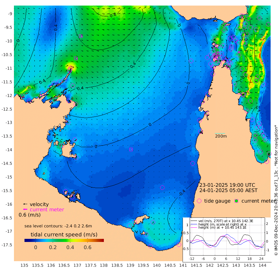 26cm/s 107T +3cm/s rms + 7cm/s -42T. ARA-GOC87 57m 6cm/s 116T +3cm/s rms + 2cm/s -2T. ARA-GOC87 60m 23cm/s 99T +2cm/s rms + 3cm/s 61T. ARA-GOC87 47m -11cm Daru -7cm Bobo Island 24cm Meer Island Barge 18cm Bramble Cay 5cm Unnamed Cay -7cm Pearce Cay 4cm Stephens Island 10cm Merrie England Shoals -11cm Mutacomal Reef 13cm Darnley Island Barge 19cm East Cay 1cm Yorke Island Barge -12cm Rennel Island -12cm Aureed Island -26cm Dungeness Reef -34cm Zagai Island -48cm Yam Island -48cm Dauan Island -38cm Saibai Island -46cm Phipi Reef -44cm Warrior Reef - West -40cm Mabuiag Island Barge -13cm Half Way Island -18cm Coconut Island -25cm Dugong Islet -37cm Poll Island -35cm Kirkcaldie Reef -56cm Suarji Island -26cm Sue Islet -30cm Hawkesbury Island -40cm Alert Patches -45cm Twin Island -29cm Badu Island -51cm St Pauls (Moa Island) -38cm Kubin (Moa Island) -44cm Ince Point -43cm Thursday Island -44cm Nardana Patches -39cm Turtle Head -26cm Round Island -29cm Goods Island -23cm Booby Island -37cm White Rocks Area -6cm Carpentaria -44cm Papou Point -6cm Bampfield Head -17cm Crab Island -33cm Red Wallis Island -39cm Packe Island -27cm Harrington Reef -34cm Herald Camp -18cm Sharp Point -38cm Red Island Point -33cm Possession Island -35cm Alpha Rock -34cm Frederick Point -8cm Wyborn Reef Light -14cm Tetley Island 13cm Triangle Reef -4cm Turtle Head Island 11cm Maclennan Cay 26cm Raine Island 3cm Mcsweeny Reef 12cm Collette Reef 24cm Shadwell Reef 16cm Hannibal Island 18cm Round Point -6cm Vrilya Point 17cm Cape Grenville 16cm Hicks Island 15cm Sir Charles Hardy Island 4cm Harvey Island 27cm Kay Reef 24cm Rocky Island 27cm Chapman Island 27cm Ham Reef 27cm Jubilee Reef 20cm Night Island 25cm Unnamed Reef No. 3 26cm Morris Island 27cm 1st 3 Mile Opening 25cm Creech Reef 24cm Fife Island 35cm Eden Reef 29cm Stanley Island 24cm Normanby River 31cm Yabooma Island 48cm Hutchison River 42cm Elcho Island 28cm North West Crocodile Island 47cm Cape Wessel 54cm Stevens Island 73cm Guluwuru Island 53cm Hopeful Bay 50cm Auster Point 49cm Two Island Bay 64cm Cadell Strait 189cm Mallison Island 61cm Melville Bay (Gove Harbour) 67cm Truant Island 46cm Cape Arnhem 25cm Cape Grey 16cm Hawk Island -9cm Milner Bay (Groote Eylandt) -21cm Cape Beatrice -48cm West Island -45cm Centre Island -51cm Mornington Island -59cm West Wellesley Islands -69cm Bountiful Island -75cm Albert River Mouth -57cm Sweers Island -75cm Karumba -51cm Nassau River Offshore -36cm Christmas Creek -10cm Archer River -7cm Boyd Point -12cm Weipa (Humbug Point) 7cm Pennefather River -12cm Cullen Point