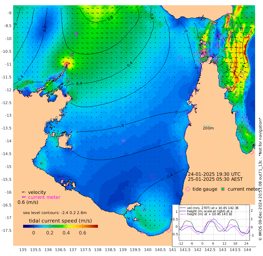 28cm/s 112T +3cm/s rms + 7cm/s -42T. ARA-GOC87 57m 8cm/s 129T +3cm/s rms + 2cm/s -2T. ARA-GOC87 60m 23cm/s 107T +2cm/s rms + 3cm/s 61T. ARA-GOC87 47m -7cm Daru -4cm Bobo Island 37cm Meer Island Barge 30cm Bramble Cay 15cm Unnamed Cay 1cm Pearce Cay 16cm Stephens Island 21cm Merrie England Shoals -5cm Mutacomal Reef 24cm Darnley Island Barge 31cm East Cay 7cm Yorke Island Barge -4cm Rennel Island -8cm Aureed Island -22cm Dungeness Reef -40cm Zagai Island -49cm Yam Island -57cm Dauan Island -51cm Saibai Island -56cm Phipi Reef -51cm Warrior Reef - West -44cm Mabuiag Island Barge -3cm Half Way Island -16cm Coconut Island -16cm Dugong Islet -35cm Poll Island -31cm Kirkcaldie Reef -59cm Suarji Island -27cm Sue Islet -11cm Hawkesbury Island -39cm Alert Patches -44cm Twin Island -18cm Badu Island -52cm St Pauls (Moa Island) -23cm Kubin (Moa Island) -40cm Ince Point -35cm Thursday Island -37cm Nardana Patches -27cm Turtle Head -11cm Round Island -9cm Goods Island 2cm Booby Island -13cm White Rocks Area 16cm Carpentaria -43cm Papou Point 20cm Bampfield Head 3cm Crab Island -11cm Red Wallis Island -20cm Packe Island -21cm Harrington Reef -11cm Herald Camp -21cm Sharp Point -31cm Red Island Point -27cm Possession Island -34cm Alpha Rock -32cm Frederick Point -4cm Wyborn Reef Light -11cm Tetley Island 22cm Triangle Reef 6cm Turtle Head Island 24cm Maclennan Cay 40cm Raine Island 12cm Mcsweeny Reef 21cm Collette Reef 35cm Shadwell Reef 27cm Hannibal Island 30cm Round Point 14cm Vrilya Point 31cm Cape Grenville 29cm Hicks Island 30cm Sir Charles Hardy Island 8cm Harvey Island 41cm Kay Reef 38cm Rocky Island 38cm Chapman Island 40cm Ham Reef 40cm Jubilee Reef 33cm Night Island 38cm Unnamed Reef No. 3 41cm Morris Island 43cm 1st 3 Mile Opening 39cm Creech Reef 35cm Fife Island 54cm Eden Reef 45cm Stanley Island 41cm Normanby River 48cm Yabooma Island 66cm Hutchison River 57cm Elcho Island 42cm North West Crocodile Island 54cm Cape Wessel 65cm Stevens Island 78cm Guluwuru Island 62cm Hopeful Bay 58cm Auster Point 61cm Two Island Bay 74cm Cadell Strait 178cm Mallison Island 63cm Melville Bay (Gove Harbour) 70cm Truant Island 45cm Cape Arnhem 20cm Cape Grey 8cm Hawk Island -20cm Milner Bay (Groote Eylandt) -31cm Cape Beatrice -62cm West Island -60cm Centre Island -71cm Mornington Island -77cm West Wellesley Islands -92cm Bountiful Island -101cm Albert River Mouth -91cm Sweers Island -102cm Karumba -62cm Nassau River Offshore -38cm Christmas Creek -4cm Archer River 4cm Boyd Point 0cm Weipa (Humbug Point) 19cm Pennefather River 5cm Cullen Point
