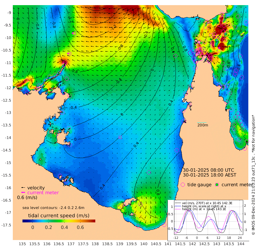 43cm/s -86T +3cm/s rms + 7cm/s -42T. ARA-GOC87 57m 15cm/s -121T +3cm/s rms + 2cm/s -2T. ARA-GOC87 60m 41cm/s -93T +2cm/s rms + 3cm/s 61T. ARA-GOC87 47m -110cm Daru -113cm Bobo Island -49cm Meer Island Barge -79cm Bramble Cay -106cm Unnamed Cay -105cm Pearce Cay -94cm Stephens Island -107cm Merrie England Shoals -117cm Mutacomal Reef -86cm Darnley Island Barge -52cm East Cay -99cm Yorke Island Barge -101cm Rennel Island -99cm Aureed Island -92cm Dungeness Reef -84cm Zagai Island -75cm Yam Island -21cm Dauan Island -32cm Saibai Island -12cm Phipi Reef -69cm Warrior Reef - West -30cm Mabuiag Island Barge -102cm Half Way Island -106cm Coconut Island -105cm Dugong Islet -95cm Poll Island -89cm Kirkcaldie Reef -75cm Suarji Island -95cm Sue Islet 28cm Hawkesbury Island -68cm Alert Patches -76cm Twin Island 16cm Badu Island -74cm St Pauls (Moa Island) 2cm Kubin (Moa Island) -43cm Ince Point -26cm Thursday Island -29cm Nardana Patches 5cm Turtle Head 21cm Round Island 38cm Goods Island 59cm Booby Island 40cm White Rocks Area 40cm Carpentaria -65cm Papou Point 44cm Bampfield Head 60cm Crab Island 52cm Red Wallis Island 27cm Packe Island -119cm Harrington Reef 66cm Herald Camp -19cm Sharp Point 8cm Red Island Point -32cm Possession Island -87cm Alpha Rock -96cm Frederick Point -126cm Wyborn Reef Light -123cm Tetley Island -48cm Triangle Reef -132cm Turtle Head Island -44cm Maclennan Cay -22cm Raine Island -98cm Mcsweeny Reef -85cm Collette Reef -48cm Shadwell Reef -94cm Hannibal Island -80cm Round Point 55cm Vrilya Point -64cm Cape Grenville -55cm Hicks Island -49cm Sir Charles Hardy Island -19cm Harvey Island -52cm Kay Reef -32cm Rocky Island -25cm Chapman Island -24cm Ham Reef -34cm Jubilee Reef -29cm Night Island -25cm Unnamed Reef No. 3 -35cm Morris Island -27cm 1st 3 Mile Opening -30cm Creech Reef -38cm Fife Island -33cm Eden Reef -35cm Stanley Island -45cm Normanby River -79cm Yabooma Island -101cm Hutchison River -77cm Elcho Island -68cm North West Crocodile Island -114cm Cape Wessel -113cm Stevens Island -133cm Guluwuru Island -81cm Hopeful Bay -104cm Auster Point -101cm Two Island Bay -127cm Cadell Strait -216cm Mallison Island -111cm Melville Bay (Gove Harbour) -125cm Truant Island -82cm Cape Arnhem -56cm Cape Grey -28cm Hawk Island -7cm Milner Bay (Groote Eylandt) 11cm Cape Beatrice 39cm West Island 49cm Centre Island 91cm Mornington Island 80cm West Wellesley Islands 109cm Bountiful Island 129cm Albert River Mouth 116cm Sweers Island 146cm Karumba 104cm Nassau River Offshore 96cm Christmas Creek 77cm Archer River 58cm Boyd Point 79cm Weipa (Humbug Point) 47cm Pennefather River 68cm Cullen Point