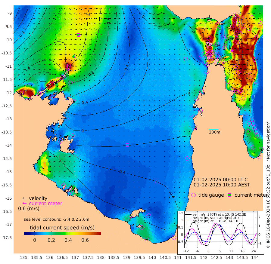 32cm/s 121T +3cm/s rms + 7cm/s -42T. ARA-GOC87 57m 8cm/s 171T +3cm/s rms + 2cm/s -2T. ARA-GOC87 60m 31cm/s 115T +2cm/s rms + 3cm/s 61T. ARA-GOC87 47m 51cm Daru 66cm Bobo Island 91cm Meer Island Barge 97cm Bramble Cay 82cm Unnamed Cay 90cm Pearce Cay 90cm Stephens Island 84cm Merrie England Shoals 60cm Mutacomal Reef 83cm Darnley Island Barge 99cm East Cay 67cm Yorke Island Barge 74cm Rennel Island 63cm Aureed Island 50cm Dungeness Reef -2cm Zagai Island 7cm Yam Island -28cm Dauan Island -37cm Saibai Island -33cm Phipi Reef -7cm Warrior Reef - West -8cm Mabuiag Island Barge 73cm Half Way Island 45cm Coconut Island 66cm Dugong Islet 30cm Poll Island 33cm Kirkcaldie Reef 5cm Suarji Island 17cm Sue Islet 82cm Hawkesbury Island 16cm Alert Patches 19cm Twin Island 53cm Badu Island 3cm St Pauls (Moa Island) 57cm Kubin (Moa Island) 20cm Ince Point 27cm Thursday Island 24cm Nardana Patches 47cm Turtle Head 50cm Round Island 80cm Goods Island 80cm Booby Island 89cm White Rocks Area 46cm Carpentaria 17cm Papou Point 86cm Bampfield Head 51cm Crab Island 72cm Red Wallis Island 59cm Packe Island 61cm Harrington Reef 61cm Herald Camp -22cm Sharp Point 40cm Red Island Point 25cm Possession Island 14cm Alpha Rock 34cm Frederick Point 58cm Wyborn Reef Light 48cm Tetley Island 73cm Triangle Reef 84cm Turtle Head Island 89cm Maclennan Cay 89cm Raine Island 76cm Mcsweeny Reef 74cm Collette Reef 77cm Shadwell Reef 85cm Hannibal Island 101cm Round Point 39cm Vrilya Point 90cm Cape Grenville 95cm Hicks Island 100cm Sir Charles Hardy Island 27cm Harvey Island 98cm Kay Reef 93cm Rocky Island 94cm Chapman Island 90cm Ham Reef 92cm Jubilee Reef 79cm Night Island 90cm Unnamed Reef No. 3 99cm Morris Island 96cm 1st 3 Mile Opening 94cm Creech Reef 90cm Fife Island 120cm Eden Reef 100cm Stanley Island 117cm Normanby River 229cm Yabooma Island 261cm Hutchison River 215cm Elcho Island 204cm North West Crocodile Island 152cm Cape Wessel 191cm Stevens Island 137cm Guluwuru Island 171cm Hopeful Bay 165cm Auster Point 170cm Two Island Bay 217cm Cadell Strait 55cm Mallison Island 119cm Melville Bay (Gove Harbour) 130cm Truant Island 70cm Cape Arnhem 31cm Cape Grey -1cm Hawk Island -48cm Milner Bay (Groote Eylandt) -54cm Cape Beatrice -113cm West Island -120cm Centre Island -125cm Mornington Island -114cm West Wellesley Islands -115cm Bountiful Island -139cm Albert River Mouth -161cm Sweers Island -148cm Karumba -83cm Nassau River Offshore -43cm Christmas Creek 5cm Archer River 21cm Boyd Point 31cm Weipa (Humbug Point) 13cm Pennefather River 30cm Cullen Point