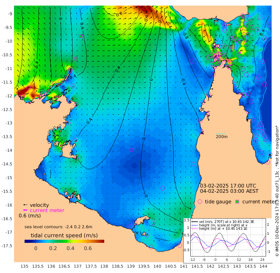 28cm/s 83T +3cm/s rms + 7cm/s -42T. ARA-GOC87 57m 3cm/s 58T +3cm/s rms + 2cm/s -2T. ARA-GOC87 60m 27cm/s 68T +2cm/s rms + 3cm/s 61T. ARA-GOC87 47m 53cm Daru 56cm Bobo Island 33cm Meer Island Barge 36cm Bramble Cay 44cm Unnamed Cay 47cm Pearce Cay 46cm Stephens Island 42cm Merrie England Shoals 39cm Mutacomal Reef 51cm Darnley Island Barge 26cm East Cay 52cm Yorke Island Barge 38cm Rennel Island 51cm Aureed Island 38cm Dungeness Reef 38cm Zagai Island 15cm Yam Island 2cm Dauan Island 3cm Saibai Island 14cm Phipi Reef 33cm Warrior Reef - West -31cm Mabuiag Island Barge 40cm Half Way Island 42cm Coconut Island 35cm Dugong Islet 27cm Poll Island 23cm Kirkcaldie Reef 14cm Suarji Island 31cm Sue Islet -125cm Hawkesbury Island -5cm Alert Patches -2cm Twin Island -91cm Badu Island 2cm St Pauls (Moa Island) -77cm Kubin (Moa Island) -30cm Ince Point -48cm Thursday Island -43cm Nardana Patches -70cm Turtle Head -86cm Round Island -111cm Goods Island -133cm Booby Island -133cm White Rocks Area -107cm Carpentaria -8cm Papou Point -121cm Bampfield Head -109cm Crab Island -132cm Red Wallis Island -96cm Packe Island 42cm Harrington Reef -123cm Herald Camp 6cm Sharp Point -75cm Red Island Point -28cm Possession Island 4cm Alpha Rock 19cm Frederick Point 43cm Wyborn Reef Light 38cm Tetley Island 22cm Triangle Reef 46cm Turtle Head Island 20cm Maclennan Cay 14cm Raine Island 45cm Mcsweeny Reef 42cm Collette Reef 29cm Shadwell Reef 48cm Hannibal Island 33cm Round Point -101cm Vrilya Point 27cm Cape Grenville 28cm Hicks Island 19cm Sir Charles Hardy Island 10cm Harvey Island 20cm Kay Reef 18cm Rocky Island 10cm Chapman Island 10cm Ham Reef 18cm Jubilee Reef 21cm Night Island 10cm Unnamed Reef No. 3 20cm Morris Island 19cm 1st 3 Mile Opening 18cm Creech Reef 28cm Fife Island 22cm Eden Reef 18cm Stanley Island 18cm Normanby River -39cm Yabooma Island -17cm Hutchison River -23cm Elcho Island -34cm North West Crocodile Island 22cm Cape Wessel 5cm Stevens Island 78cm Guluwuru Island -2cm Hopeful Bay 15cm Auster Point 14cm Two Island Bay 37cm Cadell Strait 197cm Mallison Island 64cm Melville Bay (Gove Harbour) 68cm Truant Island 60cm Cape Arnhem 50cm Cape Grey 45cm Hawk Island 37cm Milner Bay (Groote Eylandt) 27cm Cape Beatrice 20cm West Island 19cm Centre Island 36cm Mornington Island 29cm West Wellesley Islands 27cm Bountiful Island 36cm Albert River Mouth 64cm Sweers Island 29cm Karumba 4cm Nassau River Offshore -17cm Christmas Creek -47cm Archer River -55cm Boyd Point -69cm Weipa (Humbug Point) -53cm Pennefather River -95cm Cullen Point