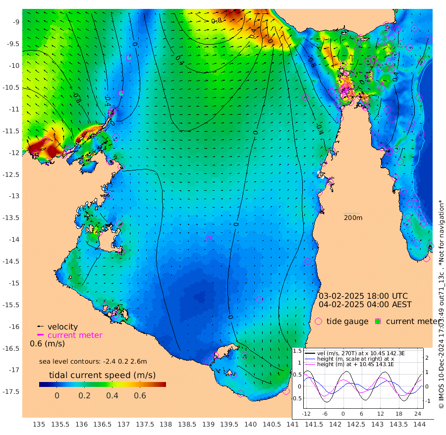 16cm/s 63T +3cm/s rms + 7cm/s -42T. ARA-GOC87 57m 7cm/s 70T +3cm/s rms + 2cm/s -2T. ARA-GOC87 60m 15cm/s 46T +2cm/s rms + 3cm/s 61T. ARA-GOC87 47m 41cm Daru 41cm Bobo Island 18cm Meer Island Barge 20cm Bramble Cay 33cm Unnamed Cay 26cm Pearce Cay 31cm Stephens Island 32cm Merrie England Shoals 32cm Mutacomal Reef 38cm Darnley Island Barge 10cm East Cay 42cm Yorke Island Barge 26cm Rennel Island 38cm Aureed Island 28cm Dungeness Reef 34cm Zagai Island 14cm Yam Island -4cm Dauan Island 6cm Saibai Island 5cm Phipi Reef 25cm Warrior Reef - West -23cm Mabuiag Island Barge 29cm Half Way Island 34cm Coconut Island 28cm Dugong Islet 22cm Poll Island 21cm Kirkcaldie Reef 16cm Suarji Island 33cm Sue Islet -116cm Hawkesbury Island 2cm Alert Patches 2cm Twin Island -88cm Badu Island 6cm St Pauls (Moa Island) -74cm Kubin (Moa Island) -23cm Ince Point -39cm Thursday Island -35cm Nardana Patches -65cm Turtle Head -76cm Round Island -104cm Goods Island -117cm Booby Island -122cm White Rocks Area -70cm Carpentaria -5cm Papou Point -100cm Bampfield Head -97cm Crab Island -117cm Red Wallis Island -90cm Packe Island 35cm Harrington Reef -107cm Herald Camp 11cm Sharp Point -69cm Red Island Point -21cm Possession Island 12cm Alpha Rock 17cm Frederick Point 36cm Wyborn Reef Light 33cm Tetley Island 11cm Triangle Reef 35cm Turtle Head Island 8cm Maclennan Cay 0cm Raine Island 34cm Mcsweeny Reef 32cm Collette Reef 18cm Shadwell Reef 36cm Hannibal Island 16cm Round Point -81cm Vrilya Point 17cm Cape Grenville 13cm Hicks Island 8cm Sir Charles Hardy Island 6cm Harvey Island 10cm Kay Reef 5cm Rocky Island -5cm Chapman Island 0cm Ham Reef 6cm Jubilee Reef 8cm Night Island -2cm Unnamed Reef No. 3 5cm Morris Island 6cm 1st 3 Mile Opening 6cm Creech Reef 9cm Fife Island 3cm Eden Reef 6cm Stanley Island 1cm Normanby River -123cm Yabooma Island -117cm Hutchison River -105cm Elcho Island -114cm North West Crocodile Island -31cm Cape Wessel -72cm Stevens Island 24cm Guluwuru Island -70cm Hopeful Bay -46cm Auster Point -49cm Two Island Bay -59cm Cadell Strait 155cm Mallison Island 12cm Melville Bay (Gove Harbour) 14cm Truant Island 26cm Cape Arnhem 30cm Cape Grey 29cm Hawk Island 36cm Milner Bay (Groote Eylandt) 28cm Cape Beatrice 42cm West Island 44cm Centre Island 36cm Mornington Island 32cm West Wellesley Islands 18cm Bountiful Island 14cm Albert River Mouth 44cm Sweers Island 9cm Karumba -2cm Nassau River Offshore -20cm Christmas Creek -44cm Archer River -45cm Boyd Point -64cm Weipa (Humbug Point) -41cm Pennefather River -77cm Cullen Point