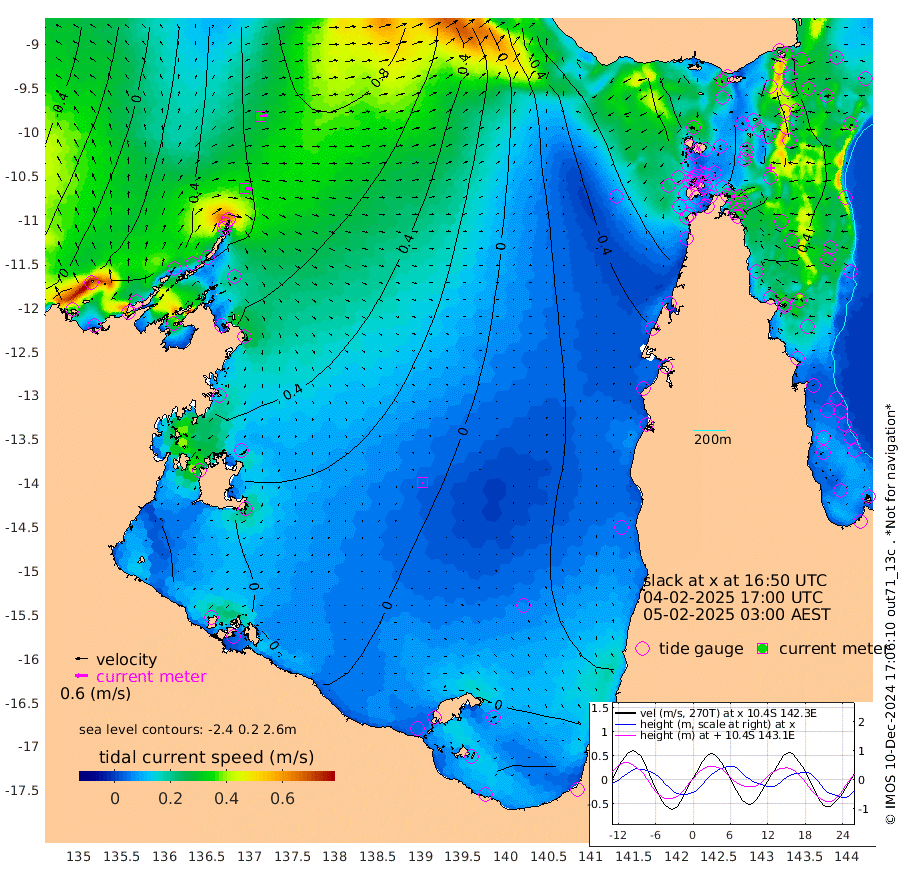 36cm/s 97T +3cm/s rms + 7cm/s -42T. ARA-GOC87 57m 4cm/s 153T +3cm/s rms + 2cm/s -2T. ARA-GOC87 60m 33cm/s 84T +2cm/s rms + 3cm/s 61T. ARA-GOC87 47m 33cm Daru 42cm Bobo Island 41cm Meer Island Barge 38cm Bramble Cay 30cm Unnamed Cay 41cm Pearce Cay 41cm Stephens Island 30cm Merrie England Shoals 17cm Mutacomal Reef 46cm Darnley Island Barge 36cm East Cay 39cm Yorke Island Barge 25cm Rennel Island 39cm Aureed Island 22cm Dungeness Reef 13cm Zagai Island -9cm Yam Island -10cm Dauan Island -15cm Saibai Island -3cm Phipi Reef 11cm Warrior Reef - West -43cm Mabuiag Island Barge 27cm Half Way Island 23cm Coconut Island 18cm Dugong Islet 6cm Poll Island 2cm Kirkcaldie Reef -13cm Suarji Island 5cm Sue Islet -98cm Hawkesbury Island -25cm Alert Patches -21cm Twin Island -69cm Badu Island -20cm St Pauls (Moa Island) -64cm Kubin (Moa Island) -39cm Ince Point -51cm Thursday Island -48cm Nardana Patches -59cm Turtle Head -75cm Round Island -80cm Goods Island -96cm Booby Island -100cm White Rocks Area -85cm Carpentaria -24cm Papou Point -95cm Bampfield Head -78cm Crab Island -98cm Red Wallis Island -75cm Packe Island 20cm Harrington Reef -101cm Herald Camp -8cm Sharp Point -64cm Red Island Point -38cm Possession Island -20cm Alpha Rock -2cm Frederick Point 21cm Wyborn Reef Light 15cm Tetley Island 28cm Triangle Reef 29cm Turtle Head Island 28cm Maclennan Cay 31cm Raine Island 35cm Mcsweeny Reef 35cm Collette Reef 33cm Shadwell Reef 41cm Hannibal Island 35cm Round Point -73cm Vrilya Point 28cm Cape Grenville 34cm Hicks Island 28cm Sir Charles Hardy Island 10cm Harvey Island 27cm Kay Reef 31cm Rocky Island 27cm Chapman Island 26cm Ham Reef 32cm Jubilee Reef 32cm Night Island 26cm Unnamed Reef No. 3 34cm Morris Island 34cm 1st 3 Mile Opening 33cm Creech Reef 43cm Fife Island 43cm Eden Reef 31cm Stanley Island 33cm Normanby River 24cm Yabooma Island 55cm Hutchison River 40cm Elcho Island 26cm North West Crocodile Island 58cm Cape Wessel 55cm Stevens Island 106cm Guluwuru Island 44cm Hopeful Bay 55cm Auster Point 56cm Two Island Bay 99cm Cadell Strait 203cm Mallison Island 90cm Melville Bay (Gove Harbour) 95cm Truant Island 74cm Cape Arnhem 50cm Cape Grey 38cm Hawk Island 15cm Milner Bay (Groote Eylandt) 6cm Cape Beatrice -20cm West Island -21cm Centre Island 5cm Mornington Island -2cm West Wellesley Islands -3cm Bountiful Island 9cm Albert River Mouth 25cm Sweers Island 1cm Karumba -5cm Nassau River Offshore -14cm Christmas Creek -29cm Archer River -36cm Boyd Point -43cm Weipa (Humbug Point) -34cm Pennefather River -70cm Cullen Point