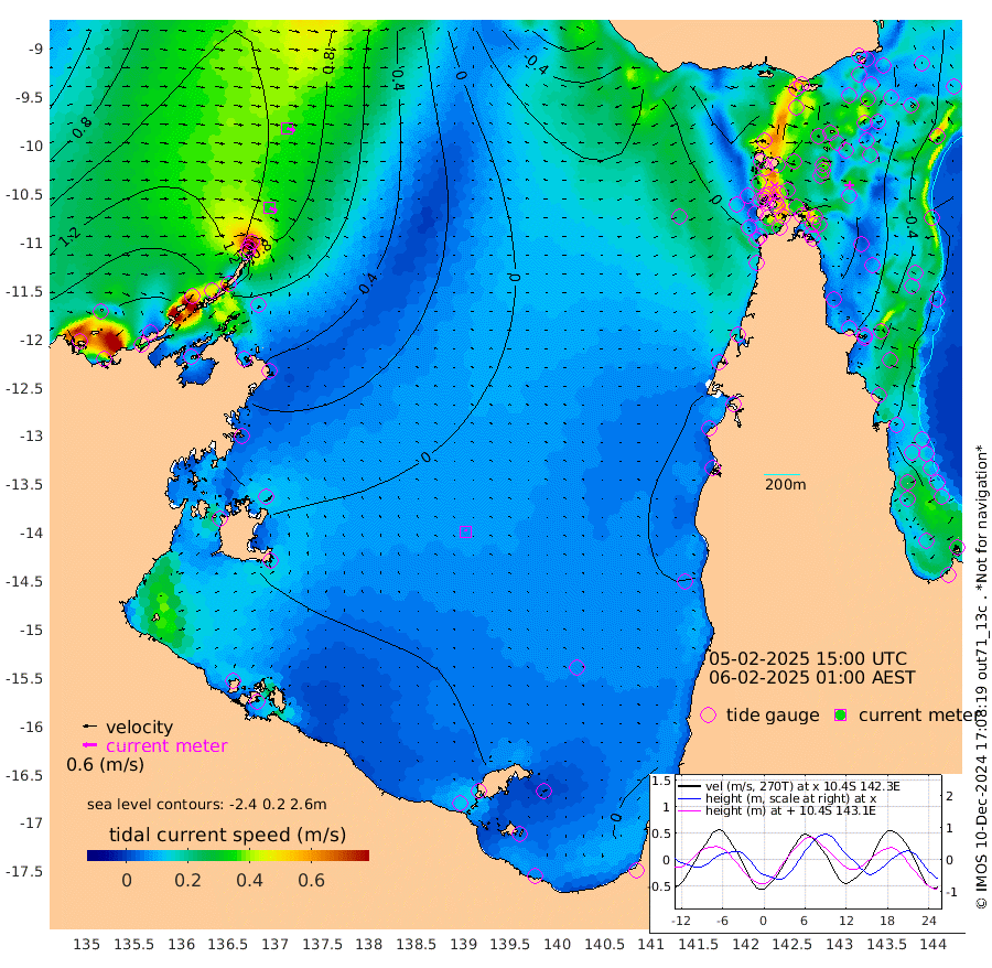 34cm/s 118T +3cm/s rms + 7cm/s -42T. ARA-GOC87 57m 7cm/s -25T +3cm/s rms + 2cm/s -2T. ARA-GOC87 60m 35cm/s 109T +2cm/s rms + 3cm/s 61T. ARA-GOC87 47m -57cm Daru -50cm Bobo Island -30cm Meer Island Barge -41cm Bramble Cay -62cm Unnamed Cay -39cm Pearce Cay -51cm Stephens Island -63cm Merrie England Shoals -68cm Mutacomal Reef -51cm Darnley Island Barge -33cm East Cay -56cm Yorke Island Barge -56cm Rennel Island -50cm Aureed Island -52cm Dungeness Reef -43cm Zagai Island -52cm Yam Island -10cm Dauan Island -26cm Saibai Island -17cm Phipi Reef -40cm Warrior Reef - West -18cm Mabuiag Island Barge -58cm Half Way Island -52cm Coconut Island -65cm Dugong Islet -50cm Poll Island -61cm Kirkcaldie Reef -51cm Suarji Island -60cm Sue Islet 9cm Hawkesbury Island -45cm Alert Patches -45cm Twin Island 24cm Badu Island -42cm St Pauls (Moa Island) -2cm Kubin (Moa Island) -30cm Ince Point -21cm Thursday Island -23cm Nardana Patches -5cm Turtle Head -8cm Round Island 16cm Goods Island 20cm Booby Island 17cm White Rocks Area -14cm Carpentaria -36cm Papou Point -3cm Bampfield Head 23cm Crab Island 16cm Red Wallis Island 3cm Packe Island -67cm Harrington Reef -13cm Herald Camp -21cm Sharp Point -5cm Red Island Point -32cm Possession Island -57cm Alpha Rock -52cm Frederick Point -60cm Wyborn Reef Light -59cm Tetley Island -26cm Triangle Reef -53cm Turtle Head Island -34cm Maclennan Cay -13cm Raine Island -52cm Mcsweeny Reef -50cm Collette Reef -33cm Shadwell Reef -55cm Hannibal Island -38cm Round Point 15cm Vrilya Point -48cm Cape Grenville -36cm Hicks Island -45cm Sir Charles Hardy Island -15cm Harvey Island -41cm Kay Reef -26cm Rocky Island -16cm Chapman Island -23cm Ham Reef -24cm Jubilee Reef -23cm Night Island -21cm Unnamed Reef No. 3 -26cm Morris Island -22cm 1st 3 Mile Opening -25cm Creech Reef -16cm Fife Island -23cm Eden Reef -32cm Stanley Island -32cm Normanby River 166cm Yabooma Island 190cm Hutchison River 167cm Elcho Island 160cm North West Crocodile Island 98cm Cape Wessel 150cm Stevens Island 77cm Guluwuru Island 133cm Hopeful Bay 115cm Auster Point 116cm Two Island Bay 172cm Cadell Strait 32cm Mallison Island 82cm Melville Bay (Gove Harbour) 86cm Truant Island 52cm Cape Arnhem 25cm Cape Grey 15cm Hawk Island -4cm Milner Bay (Groote Eylandt) -14cm Cape Beatrice -53cm West Island -54cm Centre Island -38cm Mornington Island -45cm West Wellesley Islands -34cm Bountiful Island -1cm Albert River Mouth 0cm Sweers Island -7cm Karumba -21cm Nassau River Offshore -20cm Christmas Creek 1cm Archer River -5cm Boyd Point 6cm Weipa (Humbug Point) 12cm Pennefather River 4cm Cullen Point