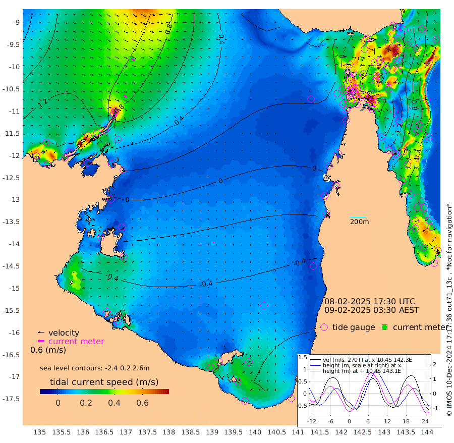 33cm/s 120T +3cm/s rms + 7cm/s -42T. ARA-GOC87 57m 11cm/s 34T +3cm/s rms + 2cm/s -2T. ARA-GOC87 60m 35cm/s 116T +2cm/s rms + 3cm/s 61T. ARA-GOC87 47m -129cm Daru -120cm Bobo Island -60cm Meer Island Barge -89cm Bramble Cay -122cm Unnamed Cay -115cm Pearce Cay -112cm Stephens Island -124cm Merrie England Shoals -138cm Mutacomal Reef -99cm Darnley Island Barge -70cm East Cay -112cm Yorke Island Barge -125cm Rennel Island -118cm Aureed Island -125cm Dungeness Reef -98cm Zagai Island -107cm Yam Island -54cm Dauan Island -48cm Saibai Island -81cm Phipi Reef -105cm Warrior Reef - West -35cm Mabuiag Island Barge -124cm Half Way Island -120cm Coconut Island -134cm Dugong Islet -117cm Poll Island -125cm Kirkcaldie Reef -116cm Suarji Island -109cm Sue Islet 20cm Hawkesbury Island -96cm Alert Patches -99cm Twin Island 18cm Badu Island -95cm St Pauls (Moa Island) -15cm Kubin (Moa Island) -66cm Ince Point -47cm Thursday Island -52cm Nardana Patches -27cm Turtle Head -7cm Round Island 18cm Goods Island 46cm Booby Island 27cm White Rocks Area 51cm Carpentaria -76cm Papou Point 38cm Bampfield Head 43cm Crab Island 32cm Red Wallis Island -10cm Packe Island -143cm Harrington Reef 6cm Herald Camp -35cm Sharp Point -20cm Red Island Point -61cm Possession Island -99cm Alpha Rock -114cm Frederick Point -125cm Wyborn Reef Light -122cm Tetley Island -57cm Triangle Reef -120cm Turtle Head Island -65cm Maclennan Cay -34cm Raine Island -110cm Mcsweeny Reef -100cm Collette Reef -62cm Shadwell Reef -109cm Hannibal Island -91cm Round Point 48cm Vrilya Point -88cm Cape Grenville -75cm Hicks Island -73cm Sir Charles Hardy Island -28cm Harvey Island -69cm Kay Reef -50cm Rocky Island -38cm Chapman Island -36cm Ham Reef -44cm Jubilee Reef -50cm Night Island -40cm Unnamed Reef No. 3 -52cm Morris Island -42cm 1st 3 Mile Opening -48cm Creech Reef -52cm Fife Island -48cm Eden Reef -56cm Stanley Island -64cm Normanby River 136cm Yabooma Island 150cm Hutchison River 140cm Elcho Island 131cm North West Crocodile Island 97cm Cape Wessel 125cm Stevens Island 74cm Guluwuru Island 116cm Hopeful Bay 104cm Auster Point 110cm Two Island Bay 136cm Cadell Strait 68cm Mallison Island 70cm Melville Bay (Gove Harbour) 78cm Truant Island 44cm Cape Arnhem 14cm Cape Grey -4cm Hawk Island -21cm Milner Bay (Groote Eylandt) -39cm Cape Beatrice -75cm West Island -74cm Centre Island -107cm Mornington Island -115cm West Wellesley Islands -117cm Bountiful Island -109cm Albert River Mouth -104cm Sweers Island -114cm Karumba -92cm Nassau River Offshore -68cm Christmas Creek -11cm Archer River 4cm Boyd Point 7cm Weipa (Humbug Point) 24cm Pennefather River 34cm Cullen Point