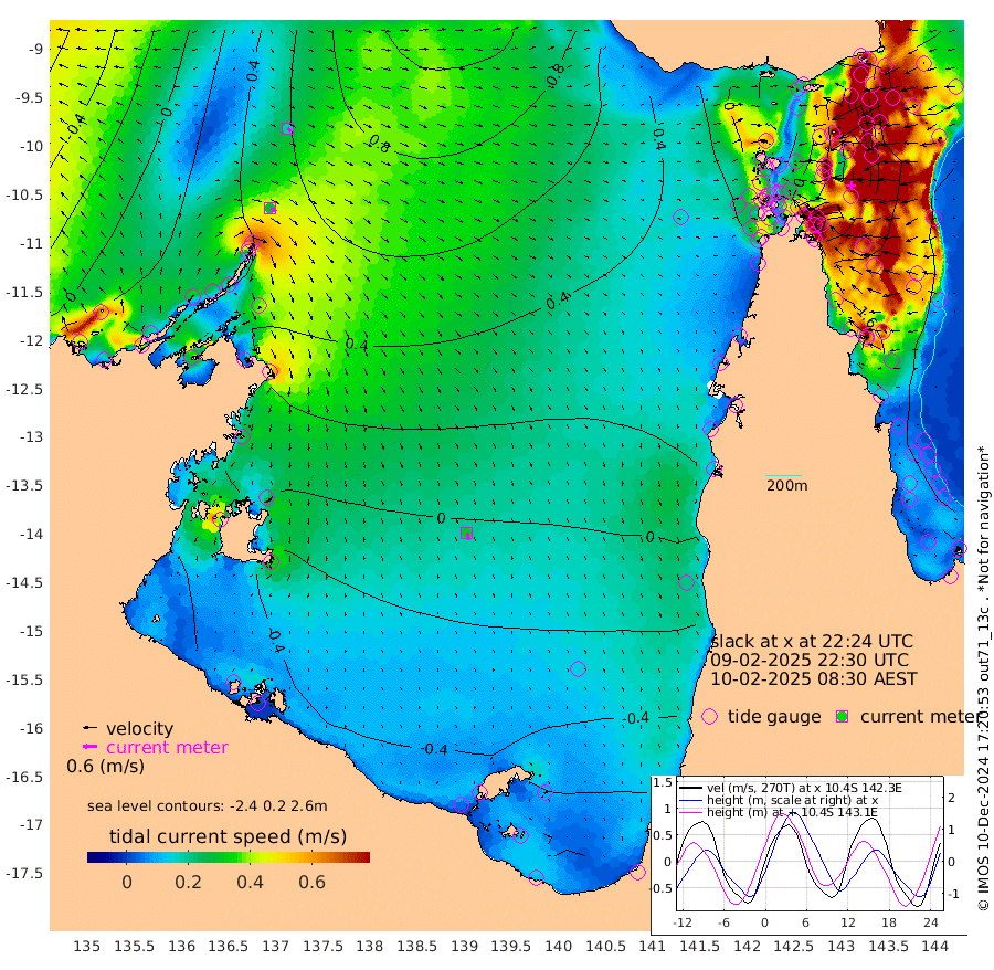 28cm/s 123T +3cm/s rms + 7cm/s -42T. ARA-GOC87 57m 31cm/s 163T +3cm/s rms + 2cm/s -2T. ARA-GOC87 60m 18cm/s 127T +2cm/s rms + 3cm/s 61T. ARA-GOC87 47m 132cm Daru 146cm Bobo Island 142cm Meer Island Barge 161cm Bramble Cay 158cm Unnamed Cay 166cm Pearce Cay 164cm Stephens Island 168cm Merrie England Shoals 144cm Mutacomal Reef 157cm Darnley Island Barge 154cm East Cay 144cm Yorke Island Barge 148cm Rennel Island 142cm Aureed Island 120cm Dungeness Reef 53cm Zagai Island 57cm Yam Island -9cm Dauan Island -8cm Saibai Island 2cm Phipi Reef 50cm Warrior Reef - West 6cm Mabuiag Island Barge 149cm Half Way Island 124cm Coconut Island 142cm Dugong Islet 94cm Poll Island 104cm Kirkcaldie Reef 58cm Suarji Island 86cm Sue Islet 66cm Hawkesbury Island 72cm Alert Patches 75cm Twin Island 40cm Badu Island 52cm St Pauls (Moa Island) 56cm Kubin (Moa Island) 54cm Ince Point 52cm Thursday Island 50cm Nardana Patches 57cm Turtle Head 43cm Round Island 65cm Goods Island 60cm Booby Island 65cm White Rocks Area 54cm Carpentaria 53cm Papou Point 67cm Bampfield Head 40cm Crab Island 60cm Red Wallis Island 66cm Packe Island 147cm Harrington Reef 48cm Herald Camp -1cm Sharp Point 51cm Red Island Point 55cm Possession Island 72cm Alpha Rock 103cm Frederick Point 137cm Wyborn Reef Light 125cm Tetley Island 123cm Triangle Reef 160cm Turtle Head Island 137cm Maclennan Cay 124cm Raine Island 152cm Mcsweeny Reef 148cm Collette Reef 131cm Shadwell Reef 165cm Hannibal Island 169cm Round Point 45cm Vrilya Point 156cm Cape Grenville 148cm Hicks Island 154cm Sir Charles Hardy Island 47cm Harvey Island 157cm Kay Reef 136cm Rocky Island 136cm Chapman Island 131cm Ham Reef 135cm Jubilee Reef 124cm Night Island 136cm Unnamed Reef No. 3 145cm Morris Island 132cm 1st 3 Mile Opening 140cm Creech Reef 140cm Fife Island 167cm Eden Reef 150cm Stanley Island 166cm Normanby River 33cm Yabooma Island 53cm Hutchison River 28cm Elcho Island 18cm North West Crocodile Island 56cm Cape Wessel 40cm Stevens Island 79cm Guluwuru Island 35cm Hopeful Bay 48cm Auster Point 47cm Two Island Bay 70cm Cadell Strait 147cm Mallison Island 56cm Melville Bay (Gove Harbour) 66cm Truant Island 37cm Cape Arnhem 3cm Cape Grey -17cm Hawk Island -67cm Milner Bay (Groote Eylandt) -64cm Cape Beatrice -100cm West Island -103cm Centre Island -98cm Mornington Island -90cm West Wellesley Islands -122cm Bountiful Island -178cm Albert River Mouth -192cm Sweers Island -171cm Karumba -48cm Nassau River Offshore 0cm Christmas Creek 32cm Archer River 42cm Boyd Point 39cm Weipa (Humbug Point) 39cm Pennefather River 35cm Cullen Point