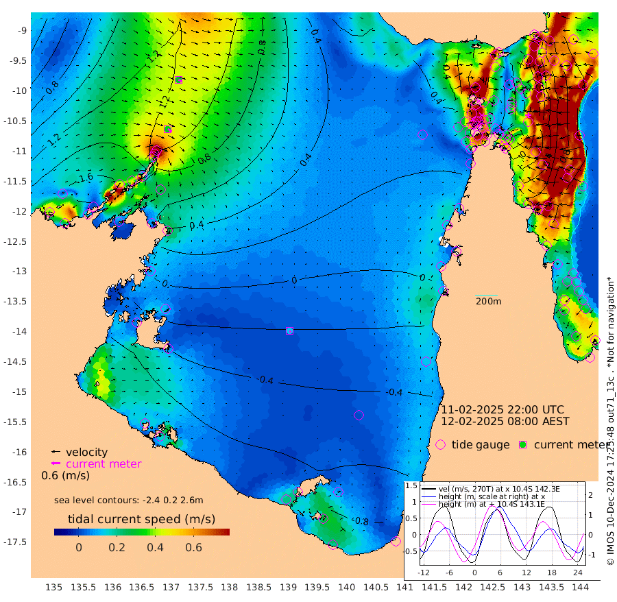 32cm/s 124T +3cm/s rms + 7cm/s -42T. ARA-GOC87 57m 13cm/s 157T +3cm/s rms + 2cm/s -2T. ARA-GOC87 60m 29cm/s 121T +2cm/s rms + 3cm/s 61T. ARA-GOC87 47m 12cm Daru 29cm Bobo Island 84cm Meer Island Barge 85cm Bramble Cay 57cm Unnamed Cay 53cm Pearce Cay 62cm Stephens Island 68cm Merrie England Shoals 31cm Mutacomal Reef 63cm Darnley Island Barge 91cm East Cay 37cm Yorke Island Barge 37cm Rennel Island 27cm Aureed Island 2cm Dungeness Reef -50cm Zagai Island -45cm Yam Island -79cm Dauan Island -72cm Saibai Island -84cm Phipi Reef -60cm Warrior Reef - West -41cm Mabuiag Island Barge 35cm Half Way Island 7cm Coconut Island 20cm Dugong Islet -18cm Poll Island -16cm Kirkcaldie Reef -51cm Suarji Island -22cm Sue Islet 69cm Hawkesbury Island -25cm Alert Patches -26cm Twin Island 30cm Badu Island -49cm St Pauls (Moa Island) 27cm Kubin (Moa Island) -19cm Ince Point -7cm Thursday Island -12cm Nardana Patches 17cm Turtle Head 36cm Round Island 64cm Goods Island 77cm Booby Island 76cm White Rocks Area 65cm Carpentaria -30cm Papou Point 93cm Bampfield Head 52cm Crab Island 69cm Red Wallis Island 44cm Packe Island 13cm Harrington Reef 55cm Herald Camp -35cm Sharp Point 15cm Red Island Point -7cm Possession Island -18cm Alpha Rock -10cm Frederick Point 27cm Wyborn Reef Light 16cm Tetley Island 67cm Triangle Reef 40cm Turtle Head Island 77cm Maclennan Cay 90cm Raine Island 51cm Mcsweeny Reef 60cm Collette Reef 75cm Shadwell Reef 71cm Hannibal Island 92cm Round Point 52cm Vrilya Point 85cm Cape Grenville 82cm Hicks Island 92cm Sir Charles Hardy Island 23cm Harvey Island 103cm Kay Reef 94cm Rocky Island 104cm Chapman Island 98cm Ham Reef 93cm Jubilee Reef 79cm Night Island 99cm Unnamed Reef No. 3 99cm Morris Island 92cm 1st 3 Mile Opening 94cm Creech Reef 89cm Fife Island 125cm Eden Reef 104cm Stanley Island 115cm Normanby River 180cm Yabooma Island 202cm Hutchison River 172cm Elcho Island 157cm North West Crocodile Island 132cm Cape Wessel 162cm Stevens Island 114cm Guluwuru Island 156cm Hopeful Bay 139cm Auster Point 140cm Two Island Bay 168cm Cadell Strait 146cm Mallison Island 99cm Melville Bay (Gove Harbour) 110cm Truant Island 57cm Cape Arnhem 14cm Cape Grey -6cm Hawk Island -56cm Milner Bay (Groote Eylandt) -65cm Cape Beatrice -121cm West Island -122cm Centre Island -137cm Mornington Island -131cm West Wellesley Islands -142cm Bountiful Island -176cm Albert River Mouth -184cm Sweers Island -178cm Karumba -90cm Nassau River Offshore -43cm Christmas Creek 17cm Archer River 30cm Boyd Point 38cm Weipa (Humbug Point) 30cm Pennefather River 44cm Cullen Point