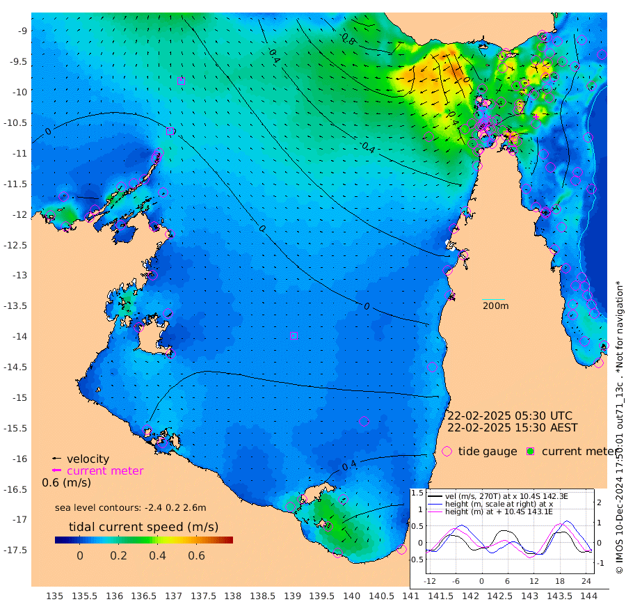 12cm/s -34T +3cm/s rms + 7cm/s -42T. ARA-GOC87 57m 11cm/s -97T +3cm/s rms + 2cm/s -2T. ARA-GOC87 60m 13cm/s -18T +2cm/s rms + 3cm/s 61T. ARA-GOC87 47m -34cm Daru -39cm Bobo Island -18cm Meer Island Barge -31cm Bramble Cay -39cm Unnamed Cay -45cm Pearce Cay -37cm Stephens Island -47cm Merrie England Shoals -48cm Mutacomal Reef -27cm Darnley Island Barge -24cm East Cay -31cm Yorke Island Barge -42cm Rennel Island -40cm Aureed Island -35cm Dungeness Reef -17cm Zagai Island -21cm Yam Island 17cm Dauan Island 16cm Saibai Island 17cm Phipi Reef -8cm Warrior Reef - West -20cm Mabuiag Island Barge -45cm Half Way Island -48cm Coconut Island -45cm Dugong Islet -43cm Poll Island -38cm Kirkcaldie Reef -43cm Suarji Island -30cm Sue Islet -55cm Hawkesbury Island -52cm Alert Patches -53cm Twin Island -41cm Badu Island -44cm St Pauls (Moa Island) -50cm Kubin (Moa Island) -48cm Ince Point -53cm Thursday Island -50cm Nardana Patches -49cm Turtle Head -50cm Round Island -56cm Goods Island -67cm Booby Island -75cm White Rocks Area -78cm Carpentaria -39cm Papou Point -78cm Bampfield Head -53cm Crab Island -73cm Red Wallis Island -66cm Packe Island -59cm Harrington Reef -49cm Herald Camp -6cm Sharp Point -39cm Red Island Point -49cm Possession Island -50cm Alpha Rock -53cm Frederick Point -53cm Wyborn Reef Light -53cm Tetley Island -25cm Triangle Reef -59cm Turtle Head Island -23cm Maclennan Cay -14cm Raine Island -40cm Mcsweeny Reef -34cm Collette Reef -19cm Shadwell Reef -37cm Hannibal Island -40cm Round Point -61cm Vrilya Point -35cm Cape Grenville -24cm Hicks Island -18cm Sir Charles Hardy Island -8cm Harvey Island -29cm Kay Reef -16cm Rocky Island -21cm Chapman Island -15cm Ham Reef -15cm Jubilee Reef -21cm Night Island -22cm Unnamed Reef No. 3 -20cm Morris Island -15cm 1st 3 Mile Opening -19cm Creech Reef -23cm Fife Island -18cm Eden Reef -22cm Stanley Island -25cm Normanby River 11cm Yabooma Island 23cm Hutchison River 17cm Elcho Island 21cm North West Crocodile Island -5cm Cape Wessel 3cm Stevens Island 28cm Guluwuru Island 7cm Hopeful Bay -1cm Auster Point 6cm Two Island Bay 31cm Cadell Strait 30cm Mallison Island 19cm Melville Bay (Gove Harbour) 12cm Truant Island 14cm Cape Arnhem 25cm Cape Grey 22cm Hawk Island 22cm Milner Bay (Groote Eylandt) 28cm Cape Beatrice 24cm West Island 21cm Centre Island 70cm Mornington Island 64cm West Wellesley Islands 103cm Bountiful Island 130cm Albert River Mouth 121cm Sweers Island 125cm Karumba 53cm Nassau River Offshore 30cm Christmas Creek -3cm Archer River -17cm Boyd Point -12cm Weipa (Humbug Point) -39cm Pennefather River -46cm Cullen Point
