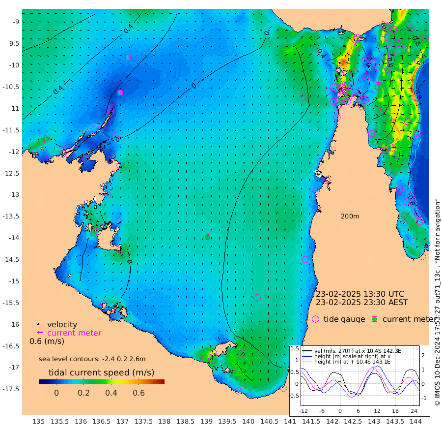 11cm/s 83T +3cm/s rms + 7cm/s -42T. ARA-GOC87 57m 30cm/s 9T +3cm/s rms + 2cm/s -2T. ARA-GOC87 60m 16cm/s 95T +2cm/s rms + 3cm/s 61T. ARA-GOC87 47m -33cm Daru -28cm Bobo Island -67cm Meer Island Barge -62cm Bramble Cay -53cm Unnamed Cay -37cm Pearce Cay -52cm Stephens Island -54cm Merrie England Shoals -34cm Mutacomal Reef -60cm Darnley Island Barge -66cm East Cay -46cm Yorke Island Barge -38cm Rennel Island -30cm Aureed Island -27cm Dungeness Reef 0cm Zagai Island -3cm Yam Island -12cm Dauan Island -8cm Saibai Island -23cm Phipi Reef -10cm Warrior Reef - West 5cm Mabuiag Island Barge -34cm Half Way Island -16cm Coconut Island -31cm Dugong Islet -5cm Poll Island -16cm Kirkcaldie Reef 9cm Suarji Island -15cm Sue Islet -33cm Hawkesbury Island -4cm Alert Patches 5cm Twin Island -16cm Badu Island 11cm St Pauls (Moa Island) -16cm Kubin (Moa Island) 0cm Ince Point -2cm Thursday Island -2cm Nardana Patches -20cm Turtle Head -25cm Round Island -31cm Goods Island -30cm Booby Island -15cm White Rocks Area -14cm Carpentaria 12cm Papou Point -39cm Bampfield Head -21cm Crab Island -19cm Red Wallis Island -21cm Packe Island -16cm Harrington Reef -47cm Herald Camp 7cm Sharp Point -10cm Red Island Point -8cm Possession Island 2cm Alpha Rock -4cm Frederick Point -23cm Wyborn Reef Light -16cm Tetley Island -51cm Triangle Reef -27cm Turtle Head Island -60cm Maclennan Cay -66cm Raine Island -45cm Mcsweeny Reef -55cm Collette Reef -66cm Shadwell Reef -61cm Hannibal Island -60cm Round Point -19cm Vrilya Point -65cm Cape Grenville -64cm Hicks Island -77cm Sir Charles Hardy Island -20cm Harvey Island -73cm Kay Reef -71cm Rocky Island -70cm Chapman Island -70cm Ham Reef -70cm Jubilee Reef -60cm Night Island -67cm Unnamed Reef No. 3 -72cm Morris Island -73cm 1st 3 Mile Opening -72cm Creech Reef -62cm Fife Island -88cm Eden Reef -79cm Stanley Island -75cm Normanby River 36cm Yabooma Island 31cm Hutchison River 36cm Elcho Island 41cm North West Crocodile Island 34cm Cape Wessel 40cm Stevens Island -7cm Guluwuru Island 24cm Hopeful Bay 31cm Auster Point 28cm Two Island Bay 23cm Cadell Strait -81cm Mallison Island 4cm Melville Bay (Gove Harbour) 8cm Truant Island 3cm Cape Arnhem 7cm Cape Grey 5cm Hawk Island 34cm Milner Bay (Groote Eylandt) 23cm Cape Beatrice 35cm West Island 35cm Centre Island -14cm Mornington Island -12cm West Wellesley Islands -26cm Bountiful Island -2cm Albert River Mouth 8cm Sweers Island -12cm Karumba -40cm Nassau River Offshore -59cm Christmas Creek -56cm Archer River -49cm Boyd Point -57cm Weipa (Humbug Point) -29cm Pennefather River -31cm Cullen Point