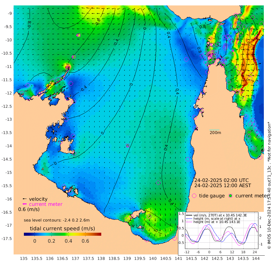 36cm/s -90T +3cm/s rms + 7cm/s -42T. ARA-GOC87 57m 24cm/s -174T +3cm/s rms + 2cm/s -2T. ARA-GOC87 60m 41cm/s -94T +2cm/s rms + 3cm/s 61T. ARA-GOC87 47m 64cm Daru 51cm Bobo Island -10cm Meer Island Barge 2cm Bramble Cay 30cm Unnamed Cay 45cm Pearce Cay 23cm Stephens Island 19cm Merrie England Shoals 58cm Mutacomal Reef 14cm Darnley Island Barge -4cm East Cay 38cm Yorke Island Barge 54cm Rennel Island 56cm Aureed Island 82cm Dungeness Reef 110cm Zagai Island 115cm Yam Island 158cm Dauan Island 138cm Saibai Island 156cm Phipi Reef 133cm Warrior Reef - West 132cm Mabuiag Island Barge 44cm Half Way Island 79cm Coconut Island 65cm Dugong Islet 101cm Poll Island 91cm Kirkcaldie Reef 145cm Suarji Island 92cm Sue Islet 128cm Hawkesbury Island 134cm Alert Patches 127cm Twin Island 131cm Badu Island 140cm St Pauls (Moa Island) 130cm Kubin (Moa Island) 133cm Ince Point 132cm Thursday Island 134cm Nardana Patches 135cm Turtle Head 127cm Round Island 121cm Goods Island 113cm Booby Island 115cm White Rocks Area 76cm Carpentaria 113cm Papou Point 121cm Bampfield Head 89cm Crab Island 118cm Red Wallis Island 133cm Packe Island 77cm Harrington Reef 135cm Herald Camp 42cm Sharp Point 112cm Red Island Point 124cm Possession Island 106cm Alpha Rock 107cm Frederick Point 67cm Wyborn Reef Light 78cm Tetley Island 18cm Triangle Reef 57cm Turtle Head Island 6cm Maclennan Cay -14cm Raine Island 34cm Mcsweeny Reef 22cm Collette Reef 0cm Shadwell Reef 14cm Hannibal Island 8cm Round Point 69cm Vrilya Point 3cm Cape Grenville 1cm Hicks Island 6cm Sir Charles Hardy Island 1cm Harvey Island -14cm Kay Reef -10cm Rocky Island -10cm Chapman Island -14cm Ham Reef -15cm Jubilee Reef -6cm Night Island -11cm Unnamed Reef No. 3 -15cm Morris Island -14cm 1st 3 Mile Opening -13cm Creech Reef -6cm Fife Island -32cm Eden Reef -21cm Stanley Island -25cm Normanby River -102cm Yabooma Island -112cm Hutchison River -106cm Elcho Island -98cm North West Crocodile Island -89cm Cape Wessel -112cm Stevens Island -98cm Guluwuru Island -100cm Hopeful Bay -92cm Auster Point -101cm Two Island Bay -123cm Cadell Strait -169cm Mallison Island -78cm Melville Bay (Gove Harbour) -82cm Truant Island -52cm Cape Arnhem -43cm Cape Grey -25cm Hawk Island -34cm Milner Bay (Groote Eylandt) -18cm Cape Beatrice -2cm West Island -3cm Centre Island 26cm Mornington Island 23cm West Wellesley Islands 27cm Bountiful Island -1cm Albert River Mouth -11cm Sweers Island 21cm Karumba 50cm Nassau River Offshore 65cm Christmas Creek 59cm Archer River 67cm Boyd Point 72cm Weipa (Humbug Point) 47cm Pennefather River 79cm Cullen Point
