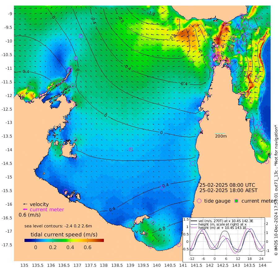 14cm/s -39T +3cm/s rms + 7cm/s -42T. ARA-GOC87 57m 17cm/s -62T +3cm/s rms + 2cm/s -2T. ARA-GOC87 60m 14cm/s -11T +2cm/s rms + 3cm/s 61T. ARA-GOC87 47m -61cm Daru -55cm Bobo Island 13cm Meer Island Barge -5cm Bramble Cay -35cm Unnamed Cay -44cm Pearce Cay -25cm Stephens Island -30cm Merrie England Shoals -64cm Mutacomal Reef -15cm Darnley Island Barge 11cm East Cay -39cm Yorke Island Barge -50cm Rennel Island -52cm Aureed Island -66cm Dungeness Reef -98cm Zagai Island -98cm Yam Island -100cm Dauan Island -100cm Saibai Island -74cm Phipi Reef -97cm Warrior Reef - West -111cm Mabuiag Island Barge -50cm Half Way Island -81cm Coconut Island -64cm Dugong Islet -95cm Poll Island -82cm Kirkcaldie Reef -115cm Suarji Island -88cm Sue Islet -96cm Hawkesbury Island -114cm Alert Patches -118cm Twin Island -105cm Badu Island -126cm St Pauls (Moa Island) -104cm Kubin (Moa Island) -115cm Ince Point -114cm Thursday Island -115cm Nardana Patches -100cm Turtle Head -88cm Round Island -90cm Goods Island -91cm Booby Island -99cm White Rocks Area -99cm Carpentaria -108cm Papou Point -97cm Bampfield Head -71cm Crab Island -100cm Red Wallis Island -102cm Packe Island -82cm Harrington Reef -77cm Herald Camp -35cm Sharp Point -81cm Red Island Point -94cm Possession Island -110cm Alpha Rock -104cm Frederick Point -82cm Wyborn Reef Light -92cm Tetley Island -12cm Triangle Reef -75cm Turtle Head Island 2cm Maclennan Cay 23cm Raine Island -38cm Mcsweeny Reef -22cm Collette Reef 6cm Shadwell Reef -18cm Hannibal Island -10cm Round Point -69cm Vrilya Point -1cm Cape Grenville 7cm Hicks Island 5cm Sir Charles Hardy Island 1cm Harvey Island 14cm Kay Reef 21cm Rocky Island 21cm Chapman Island 22cm Ham Reef 20cm Jubilee Reef 14cm Night Island 18cm Unnamed Reef No. 3 22cm Morris Island 23cm 1st 3 Mile Opening 21cm Creech Reef 14cm Fife Island 39cm Eden Reef 27cm Stanley Island 29cm Normanby River 30cm Yabooma Island 33cm Hutchison River 33cm Elcho Island 34cm North West Crocodile Island -12cm Cape Wessel 12cm Stevens Island 1cm Guluwuru Island 29cm Hopeful Bay 5cm Auster Point 10cm Two Island Bay 25cm Cadell Strait -11cm Mallison Island 2cm Melville Bay (Gove Harbour) -9cm Truant Island -3cm Cape Arnhem 17cm Cape Grey 27cm Hawk Island 36cm Milner Bay (Groote Eylandt) 43cm Cape Beatrice 46cm West Island 52cm Centre Island 101cm Mornington Island 95cm West Wellesley Islands 135cm Bountiful Island 170cm Albert River Mouth 179cm Sweers Island 171cm Karumba 78cm Nassau River Offshore 44cm Christmas Creek 9cm Archer River -24cm Boyd Point -11cm Weipa (Humbug Point) -33cm Pennefather River -55cm Cullen Point