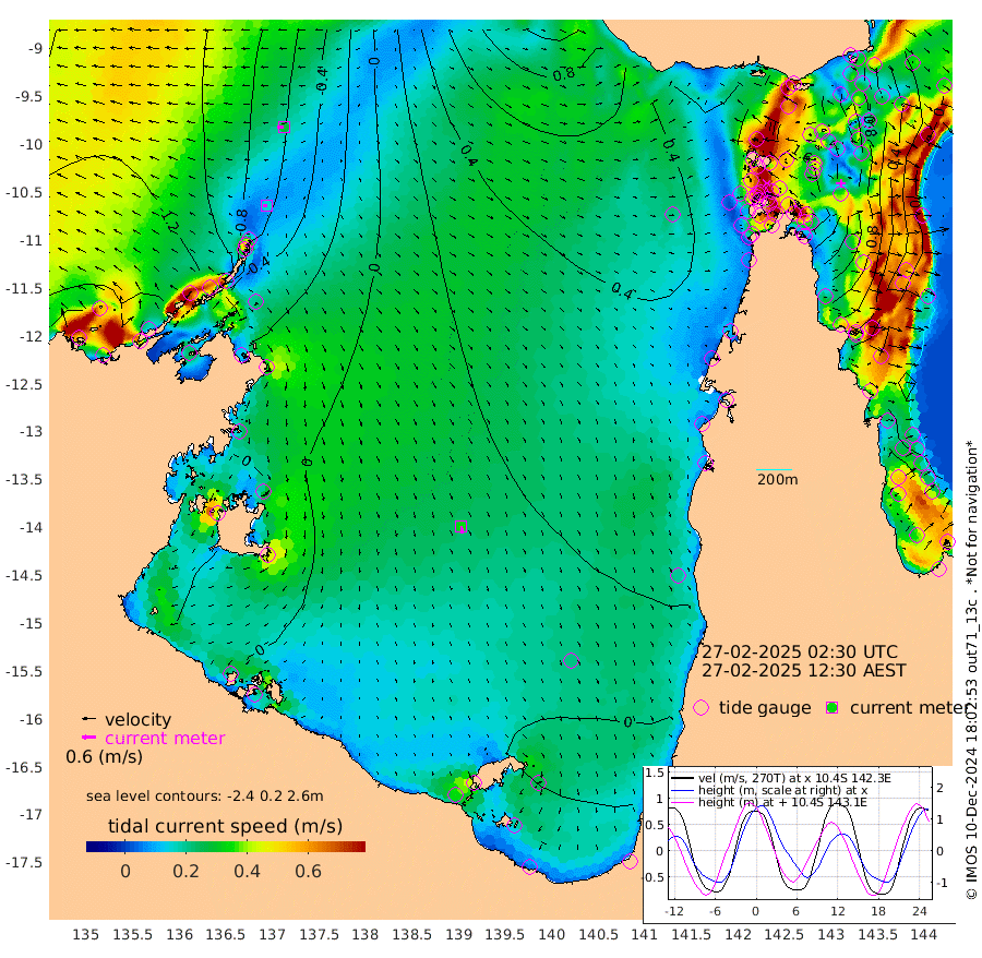 16cm/s -94T +3cm/s rms + 7cm/s -42T. ARA-GOC87 57m 33cm/s 170T +3cm/s rms + 2cm/s -2T. ARA-GOC87 60m 28cm/s -94T +2cm/s rms + 3cm/s 61T. ARA-GOC87 47m 135cm Daru 114cm Bobo Island 15cm Meer Island Barge 46cm Bramble Cay 93cm Unnamed Cay 95cm Pearce Cay 75cm Stephens Island 87cm Merrie England Shoals 135cm Mutacomal Reef 63cm Darnley Island Barge 20cm East Cay 96cm Yorke Island Barge 112cm Rennel Island 108cm Aureed Island 136cm Dungeness Reef 170cm Zagai Island 175cm Yam Island 193cm Dauan Island 180cm Saibai Island 179cm Phipi Reef 191cm Warrior Reef - West 158cm Mabuiag Island Barge 106cm Half Way Island 142cm Coconut Island 129cm Dugong Islet 160cm Poll Island 154cm Kirkcaldie Reef 181cm Suarji Island 156cm Sue Islet 112cm Hawkesbury Island 175cm Alert Patches 175cm Twin Island 125cm Badu Island 189cm St Pauls (Moa Island) 133cm Kubin (Moa Island) 164cm Ince Point 151cm Thursday Island 156cm Nardana Patches 136cm Turtle Head 113cm Round Island 99cm Goods Island 78cm Booby Island 84cm White Rocks Area 61cm Carpentaria 155cm Papou Point 80cm Bampfield Head 65cm Crab Island 93cm Red Wallis Island 128cm Packe Island 143cm Harrington Reef 103cm Herald Camp 62cm Sharp Point 110cm Red Island Point 135cm Possession Island 166cm Alpha Rock 164cm Frederick Point 142cm Wyborn Reef Light 154cm Tetley Island 43cm Triangle Reef 124cm Turtle Head Island 27cm Maclennan Cay -6cm Raine Island 90cm Mcsweeny Reef 72cm Collette Reef 28cm Shadwell Reef 69cm Hannibal Island 49cm Round Point 54cm Vrilya Point 39cm Cape Grenville 28cm Hicks Island 34cm Sir Charles Hardy Island 12cm Harvey Island 14cm Kay Reef 3cm Rocky Island -4cm Chapman Island -4cm Ham Reef 1cm Jubilee Reef 9cm Night Island 0cm Unnamed Reef No. 3 1cm Morris Island -5cm 1st 3 Mile Opening 0cm Creech Reef 11cm Fife Island -19cm Eden Reef -4cm Stanley Island -7cm Normanby River -139cm Yabooma Island -144cm Hutchison River -140cm Elcho Island -133cm North West Crocodile Island -75cm Cape Wessel -112cm Stevens Island -48cm Guluwuru Island -117cm Hopeful Bay -96cm Auster Point -97cm Two Island Bay -111cm Cadell Strait 27cm Mallison Island -50cm Melville Bay (Gove Harbour) -48cm Truant Island -27cm Cape Arnhem -36cm Cape Grey -28cm Hawk Island -48cm Milner Bay (Groote Eylandt) -33cm Cape Beatrice -27cm West Island -34cm Centre Island -12cm Mornington Island -11cm West Wellesley Islands -41cm Bountiful Island -69cm Albert River Mouth -97cm Sweers Island -57cm Karumba 18cm Nassau River Offshore 44cm Christmas Creek 35cm Archer River 51cm Boyd Point 42cm Weipa (Humbug Point) 39cm Pennefather River 57cm Cullen Point