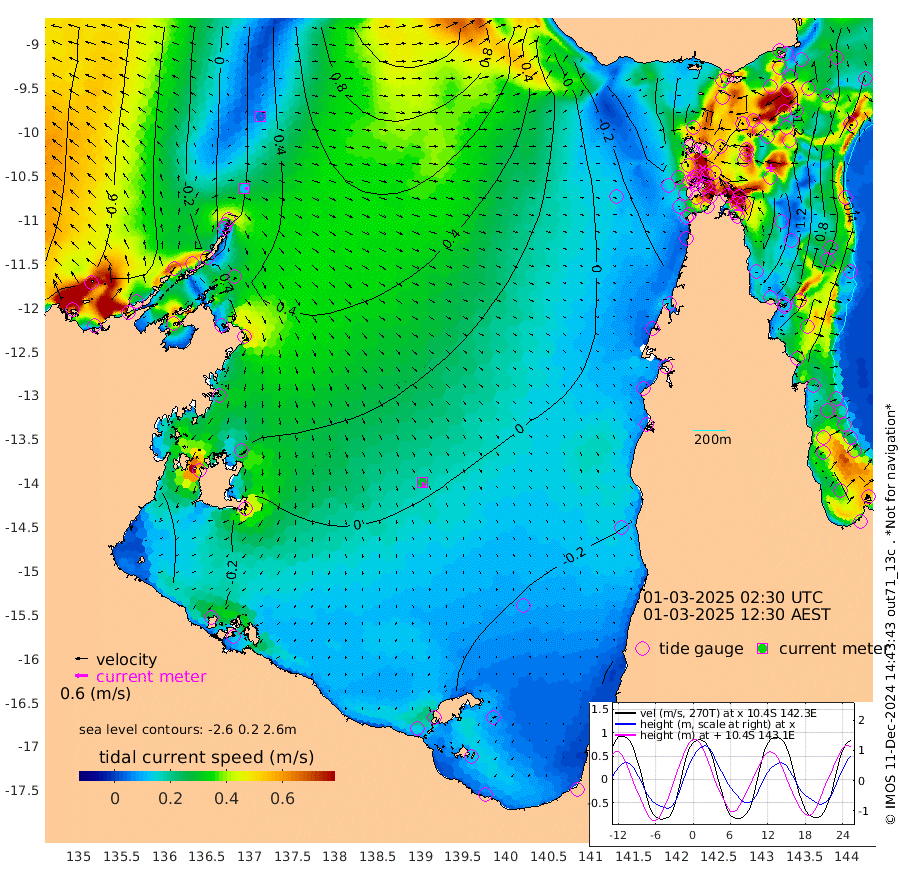 13cm/s 96T +3cm/s rms + 7cm/s -42T. ARA-GOC87 57m 29cm/s 166T +3cm/s rms + 2cm/s -2T. ARA-GOC87 60m 4cm/s 42T +2cm/s rms + 3cm/s 61T. ARA-GOC87 47m 171cm Daru 158cm Bobo Island 62cm Meer Island Barge 98cm Bramble Cay 141cm Unnamed Cay 143cm Pearce Cay 127cm Stephens Island 135cm Merrie England Shoals 168cm Mutacomal Reef 114cm Darnley Island Barge 68cm East Cay 140cm Yorke Island Barge 150cm Rennel Island 144cm Aureed Island 158cm Dungeness Reef 167cm Zagai Island 171cm Yam Island 150cm Dauan Island 142cm Saibai Island 138cm Phipi Reef 180cm Warrior Reef - West 113cm Mabuiag Island Barge 148cm Half Way Island 162cm Coconut Island 163cm Dugong Islet 166cm Poll Island 166cm Kirkcaldie Reef 156cm Suarji Island 163cm Sue Islet 54cm Hawkesbury Island 146cm Alert Patches 155cm Twin Island 64cm Badu Island 163cm St Pauls (Moa Island) 86cm Kubin (Moa Island) 126cm Ince Point 105cm Thursday Island 111cm Nardana Patches 81cm Turtle Head 54cm Round Island 36cm Goods Island 3cm Booby Island 14cm White Rocks Area -9cm Carpentaria 139cm Papou Point 3cm Bampfield Head -1cm Crab Island 18cm Red Wallis Island 65cm Packe Island 174cm Harrington Reef 31cm Herald Camp 50cm Sharp Point 68cm Red Island Point 99cm Possession Island 154cm Alpha Rock 166cm Frederick Point 173cm Wyborn Reef Light 177cm Tetley Island 72cm Triangle Reef 168cm Turtle Head Island 66cm Maclennan Cay 30cm Raine Island 132cm Mcsweeny Reef 113cm Collette Reef 65cm Shadwell Reef 119cm Hannibal Island 99cm Round Point -10cm Vrilya Point 82cm Cape Grenville 75cm Hicks Island 78cm Sir Charles Hardy Island 26cm Harvey Island 59cm Kay Reef 43cm Rocky Island 30cm Chapman Island 32cm Ham Reef 43cm Jubilee Reef 43cm Night Island 33cm Unnamed Reef No. 3 44cm Morris Island 33cm 1st 3 Mile Opening 40cm Creech Reef 52cm Fife Island 35cm Eden Reef 41cm Stanley Island 49cm Normanby River -31cm Yabooma Island -13cm Hutchison River -32cm Elcho Island -30cm North West Crocodile Island 21cm Cape Wessel -1cm Stevens Island 67cm Guluwuru Island -24cm Hopeful Bay 1cm Auster Point 11cm Two Island Bay 34cm Cadell Strait 161cm Mallison Island 44cm Melville Bay (Gove Harbour) 51cm Truant Island 36cm Cape Arnhem 11cm Cape Grey -2cm Hawk Island -40cm Milner Bay (Groote Eylandt) -33cm Cape Beatrice -53cm West Island -67cm Centre Island -45cm Mornington Island -42cm West Wellesley Islands -67cm Bountiful Island -93cm Albert River Mouth -121cm Sweers Island -90cm Karumba -21cm Nassau River Offshore 1cm Christmas Creek -10cm Archer River 5cm Boyd Point -10cm Weipa (Humbug Point) -8cm Pennefather River -8cm Cullen Point