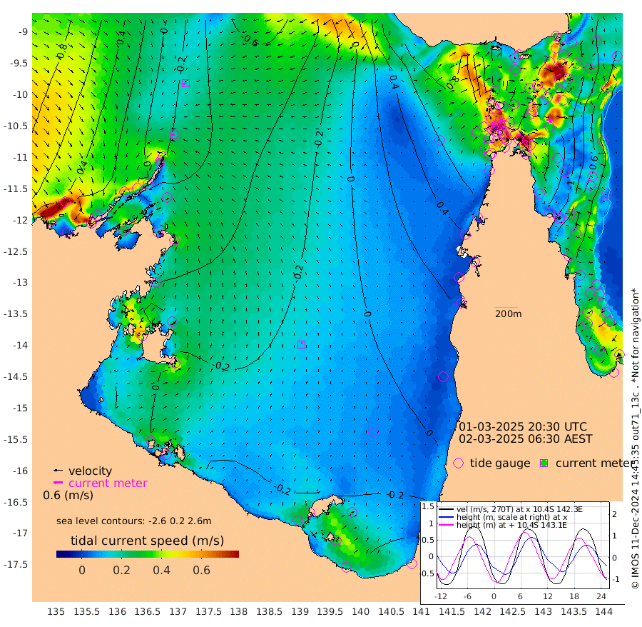 20cm/s -97T +3cm/s rms + 7cm/s -42T. ARA-GOC87 57m 13cm/s 11T +3cm/s rms + 2cm/s -2T. ARA-GOC87 60m 17cm/s -127T +2cm/s rms + 3cm/s 61T. ARA-GOC87 47m -145cm Daru -137cm Bobo Island -54cm Meer Island Barge -85cm Bramble Cay -116cm Unnamed Cay -123cm Pearce Cay -109cm Stephens Island -114cm Merrie England Shoals -135cm Mutacomal Reef -98cm Darnley Island Barge -60cm East Cay -116cm Yorke Island Barge -123cm Rennel Island -122cm Aureed Island -129cm Dungeness Reef -128cm Zagai Island -123cm Yam Island -101cm Dauan Island -85cm Saibai Island -117cm Phipi Reef -140cm Warrior Reef - West -47cm Mabuiag Island Barge -121cm Half Way Island -131cm Coconut Island -126cm Dugong Islet -126cm Poll Island -128cm Kirkcaldie Reef -107cm Suarji Island -116cm Sue Islet 37cm Hawkesbury Island -90cm Alert Patches -99cm Twin Island 10cm Badu Island -104cm St Pauls (Moa Island) -12cm Kubin (Moa Island) -63cm Ince Point -38cm Thursday Island -45cm Nardana Patches -14cm Turtle Head 13cm Round Island 41cm Goods Island 82cm Booby Island 71cm White Rocks Area 101cm Carpentaria -85cm Papou Point 86cm Bampfield Head 58cm Crab Island 66cm Red Wallis Island 7cm Packe Island -138cm Harrington Reef 48cm Herald Camp -37cm Sharp Point -10cm Red Island Point -48cm Possession Island -96cm Alpha Rock -118cm Frederick Point -134cm Wyborn Reef Light -134cm Tetley Island -55cm Triangle Reef -132cm Turtle Head Island -50cm Maclennan Cay -26cm Raine Island -109cm Mcsweeny Reef -96cm Collette Reef -55cm Shadwell Reef -103cm Hannibal Island -86cm Round Point 67cm Vrilya Point -68cm Cape Grenville -65cm Hicks Island -54cm Sir Charles Hardy Island -23cm Harvey Island -46cm Kay Reef -35cm Rocky Island -22cm Chapman Island -20cm Ham Reef -33cm Jubilee Reef -39cm Night Island -23cm Unnamed Reef No. 3 -37cm Morris Island -26cm 1st 3 Mile Opening -32cm Creech Reef -50cm Fife Island -31cm Eden Reef -34cm Stanley Island -41cm Normanby River 25cm Yabooma Island 2cm Hutchison River 18cm Elcho Island 18cm North West Crocodile Island -10cm Cape Wessel -10cm Stevens Island -63cm Guluwuru Island 9cm Hopeful Bay -3cm Auster Point -10cm Two Island Bay -51cm Cadell Strait -163cm Mallison Island -49cm Melville Bay (Gove Harbour) -50cm Truant Island -43cm Cape Arnhem -26cm Cape Grey -27cm Hawk Island -2cm Milner Bay (Groote Eylandt) -8cm Cape Beatrice 9cm West Island 13cm Centre Island -45cm Mornington Island -37cm West Wellesley Islands -27cm Bountiful Island -47cm Albert River Mouth -35cm Sweers Island -51cm Karumba -43cm Nassau River Offshore -30cm Christmas Creek 14cm Archer River 27cm Boyd Point 36cm Weipa (Humbug Point) 30cm Pennefather River 61cm Cullen Point