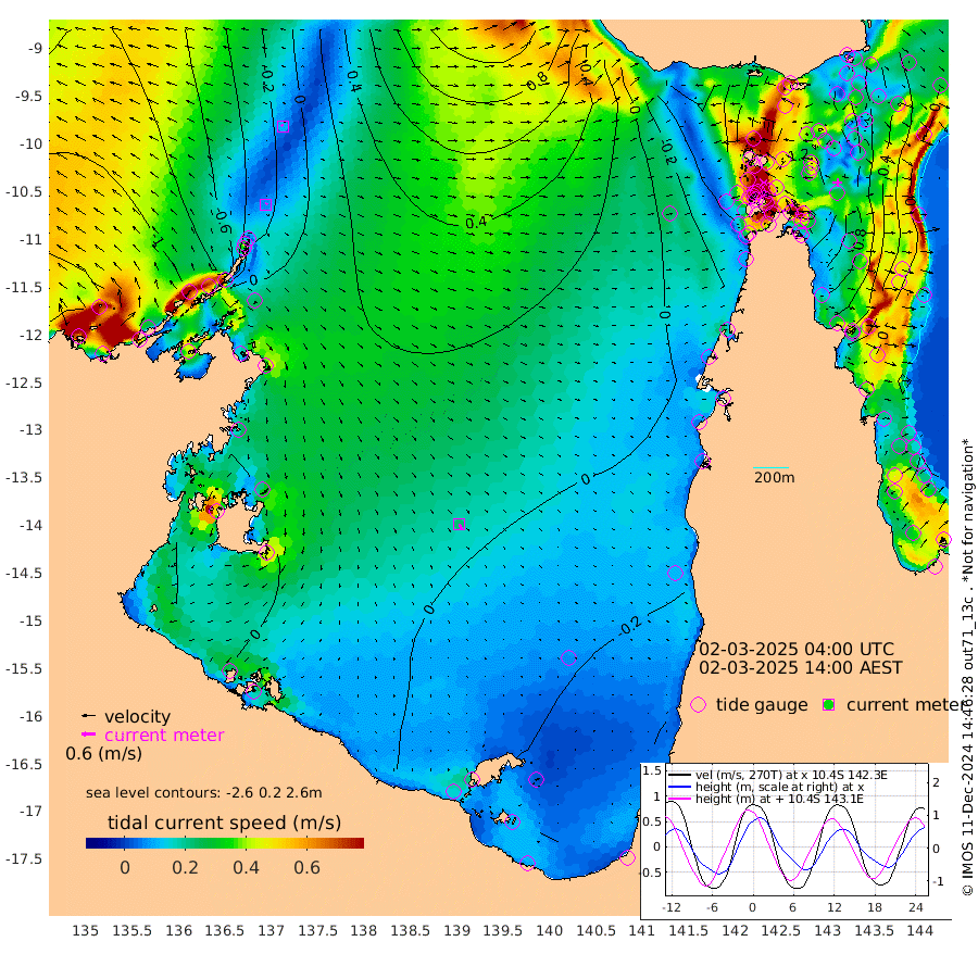 6cm/s 34T +3cm/s rms + 7cm/s -42T. ARA-GOC87 57m 22cm/s 161T +3cm/s rms + 2cm/s -2T. ARA-GOC87 60m 9cm/s -36T +2cm/s rms + 3cm/s 61T. ARA-GOC87 47m 103cm Daru 89cm Bobo Island 9cm Meer Island Barge 30cm Bramble Cay 67cm Unnamed Cay 65cm Pearce Cay 55cm Stephens Island 59cm Merrie England Shoals 95cm Mutacomal Reef 51cm Darnley Island Barge 8cm East Cay 77cm Yorke Island Barge 77cm Rennel Island 79cm Aureed Island 94cm Dungeness Reef 130cm Zagai Island 130cm Yam Island 132cm Dauan Island 134cm Saibai Island 111cm Phipi Reef 141cm Warrior Reef - West 94cm Mabuiag Island Barge 78cm Half Way Island 97cm Coconut Island 94cm Dugong Islet 110cm Poll Island 110cm Kirkcaldie Reef 108cm Suarji Island 118cm Sue Islet 15cm Hawkesbury Island 98cm Alert Patches 107cm Twin Island 29cm Badu Island 121cm St Pauls (Moa Island) 46cm Kubin (Moa Island) 87cm Ince Point 68cm Thursday Island 74cm Nardana Patches 41cm Turtle Head 19cm Round Island -4cm Goods Island -26cm Booby Island -25cm White Rocks Area -12cm Carpentaria 102cm Papou Point -33cm Bampfield Head -18cm Crab Island -12cm Red Wallis Island 24cm Packe Island 100cm Harrington Reef 3cm Herald Camp 47cm Sharp Point 37cm Red Island Point 60cm Possession Island 109cm Alpha Rock 107cm Frederick Point 100cm Wyborn Reef Light 108cm Tetley Island 23cm Triangle Reef 88cm Turtle Head Island 13cm Maclennan Cay -16cm Raine Island 63cm Mcsweeny Reef 49cm Collette Reef 14cm Shadwell Reef 48cm Hannibal Island 25cm Round Point -18cm Vrilya Point 19cm Cape Grenville 14cm Hicks Island 19cm Sir Charles Hardy Island 8cm Harvey Island 0cm Kay Reef -9cm Rocky Island -20cm Chapman Island -13cm Ham Reef -6cm Jubilee Reef -4cm Night Island -14cm Unnamed Reef No. 3 -11cm Morris Island -16cm 1st 3 Mile Opening -10cm Creech Reef -3cm Fife Island -25cm Eden Reef -13cm Stanley Island -13cm Normanby River -114cm Yabooma Island -112cm Hutchison River -110cm Elcho Island -103cm North West Crocodile Island -30cm Cape Wessel -76cm Stevens Island 18cm Guluwuru Island -88cm Hopeful Bay -59cm Auster Point -46cm Two Island Bay -45cm Cadell Strait 132cm Mallison Island -4cm Melville Bay (Gove Harbour) 0cm Truant Island 7cm Cape Arnhem -4cm Cape Grey -9cm Hawk Island -26cm Milner Bay (Groote Eylandt) -19cm Cape Beatrice -17cm West Island -26cm Centre Island -17cm Mornington Island -18cm West Wellesley Islands -47cm Bountiful Island -62cm Albert River Mouth -86cm Sweers Island -59cm Karumba -12cm Nassau River Offshore 0cm Christmas Creek -19cm Archer River -4cm Boyd Point -24cm Weipa (Humbug Point) -14cm Pennefather River -14cm Cullen Point