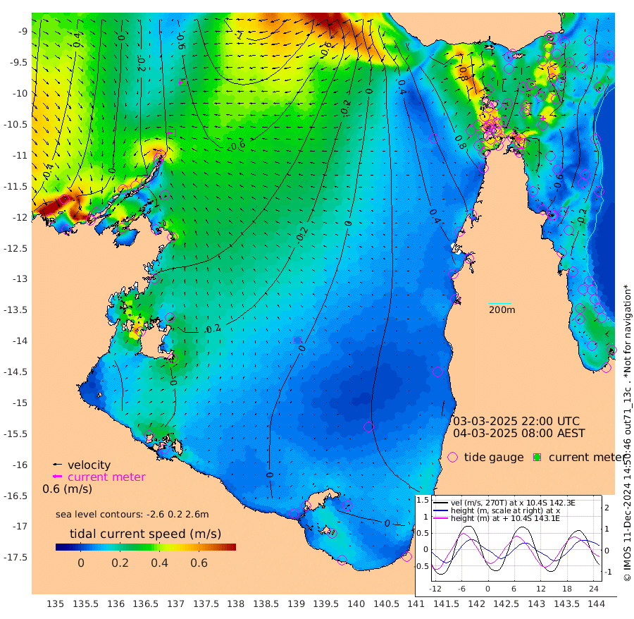 35cm/s -91T +3cm/s rms + 7cm/s -42T. ARA-GOC87 57m 5cm/s -30T +3cm/s rms + 2cm/s -2T. ARA-GOC87 60m 32cm/s -106T +2cm/s rms + 3cm/s 61T. ARA-GOC87 47m -73cm Daru -75cm Bobo Island -28cm Meer Island Barge -39cm Bramble Cay -51cm Unnamed Cay -61cm Pearce Cay -54cm Stephens Island -48cm Merrie England Shoals -58cm Mutacomal Reef -53cm Darnley Island Barge -26cm East Cay -62cm Yorke Island Barge -54cm Rennel Island -63cm Aureed Island -58cm Dungeness Reef -69cm Zagai Island -57cm Yam Island -45cm Dauan Island -42cm Saibai Island -45cm Phipi Reef -72cm Warrior Reef - West 0cm Mabuiag Island Barge -58cm Half Way Island -62cm Coconut Island -57cm Dugong Islet -55cm Poll Island -57cm Kirkcaldie Reef -30cm Suarji Island -55cm Sue Islet 79cm Hawkesbury Island -16cm Alert Patches -29cm Twin Island 54cm Badu Island -35cm St Pauls (Moa Island) 38cm Kubin (Moa Island) -1cm Ince Point 18cm Thursday Island 13cm Nardana Patches 41cm Turtle Head 61cm Round Island 82cm Goods Island 108cm Booby Island 108cm White Rocks Area 98cm Carpentaria -30cm Papou Point 118cm Bampfield Head 77cm Crab Island 97cm Red Wallis Island 58cm Packe Island -61cm Harrington Reef 89cm Herald Camp -17cm Sharp Point 32cm Red Island Point 10cm Possession Island -30cm Alpha Rock -46cm Frederick Point -60cm Wyborn Reef Light -60cm Tetley Island -24cm Triangle Reef -62cm Turtle Head Island -20cm Maclennan Cay -7cm Raine Island -50cm Mcsweeny Reef -43cm Collette Reef -23cm Shadwell Reef -48cm Hannibal Island -35cm Round Point 75cm Vrilya Point -24cm Cape Grenville -28cm Hicks Island -20cm Sir Charles Hardy Island -11cm Harvey Island -12cm Kay Reef -10cm Rocky Island -1cm Chapman Island -4cm Ham Reef -12cm Jubilee Reef -14cm Night Island -4cm Unnamed Reef No. 3 -11cm Morris Island -5cm 1st 3 Mile Opening -10cm Creech Reef -22cm Fife Island -11cm Eden Reef -8cm Stanley Island -13cm Normanby River 11cm Yabooma Island -13cm Hutchison River -1cm Elcho Island 2cm North West Crocodile Island -41cm Cape Wessel -28cm Stevens Island -94cm Guluwuru Island -10cm Hopeful Bay -27cm Auster Point -41cm Two Island Bay -83cm Cadell Strait -212cm Mallison Island -69cm Melville Bay (Gove Harbour) -75cm Truant Island -59cm Cape Arnhem -34cm Cape Grey -25cm Hawk Island -3cm Milner Bay (Groote Eylandt) 1cm Cape Beatrice 22cm West Island 24cm Centre Island -5cm Mornington Island 4cm West Wellesley Islands 22cm Bountiful Island 1cm Albert River Mouth 9cm Sweers Island 2cm Karumba 3cm Nassau River Offshore 11cm Christmas Creek 39cm Archer River 45cm Boyd Point 60cm Weipa (Humbug Point) 41cm Pennefather River 73cm Cullen Point