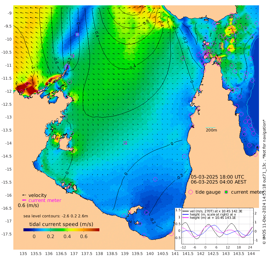 23cm/s 101T +3cm/s rms + 7cm/s -42T. ARA-GOC87 57m 20cm/s 151T +3cm/s rms + 2cm/s -2T. ARA-GOC87 60m 14cm/s 91T +2cm/s rms + 3cm/s 61T. ARA-GOC87 47m 59cm Daru 62cm Bobo Island 58cm Meer Island Barge 55cm Bramble Cay 59cm Unnamed Cay 59cm Pearce Cay 63cm Stephens Island 58cm Merrie England Shoals 50cm Mutacomal Reef 72cm Darnley Island Barge 52cm East Cay 68cm Yorke Island Barge 51cm Rennel Island 64cm Aureed Island 50cm Dungeness Reef 43cm Zagai Island 28cm Yam Island 16cm Dauan Island 22cm Saibai Island 19cm Phipi Reef 40cm Warrior Reef - West -6cm Mabuiag Island Barge 57cm Half Way Island 52cm Coconut Island 54cm Dugong Islet 38cm Poll Island 41cm Kirkcaldie Reef 23cm Suarji Island 46cm Sue Islet -51cm Hawkesbury Island 18cm Alert Patches 21cm Twin Island -33cm Badu Island 20cm St Pauls (Moa Island) -24cm Kubin (Moa Island) 3cm Ince Point -6cm Thursday Island -4cm Nardana Patches -17cm Turtle Head -35cm Round Island -37cm Goods Island -42cm Booby Island -53cm White Rocks Area -9cm Carpentaria 12cm Papou Point -38cm Bampfield Head -35cm Crab Island -44cm Red Wallis Island -29cm Packe Island 54cm Harrington Reef -44cm Herald Camp 8cm Sharp Point -25cm Red Island Point 0cm Possession Island 22cm Alpha Rock 35cm Frederick Point 49cm Wyborn Reef Light 45cm Tetley Island 46cm Triangle Reef 57cm Turtle Head Island 49cm Maclennan Cay 42cm Raine Island 60cm Mcsweeny Reef 59cm Collette Reef 53cm Shadwell Reef 66cm Hannibal Island 52cm Round Point -20cm Vrilya Point 53cm Cape Grenville 51cm Hicks Island 56cm Sir Charles Hardy Island 17cm Harvey Island 50cm Kay Reef 46cm Rocky Island 42cm Chapman Island 44cm Ham Reef 49cm Jubilee Reef 46cm Night Island 44cm Unnamed Reef No. 3 49cm Morris Island 51cm 1st 3 Mile Opening 51cm Creech Reef 48cm Fife Island 58cm Eden Reef 51cm Stanley Island 48cm Normanby River -114cm Yabooma Island -106cm Hutchison River -103cm Elcho Island -113cm North West Crocodile Island -23cm Cape Wessel -73cm Stevens Island 39cm Guluwuru Island -71cm Hopeful Bay -43cm Auster Point -41cm Two Island Bay -39cm Cadell Strait 186cm Mallison Island 16cm Melville Bay (Gove Harbour) 21cm Truant Island 26cm Cape Arnhem 11cm Cape Grey 1cm Hawk Island -13cm Milner Bay (Groote Eylandt) -17cm Cape Beatrice -20cm West Island -18cm Centre Island -13cm Mornington Island -15cm West Wellesley Islands -37cm Bountiful Island -65cm Albert River Mouth -60cm Sweers Island -66cm Karumba -7cm Nassau River Offshore 8cm Christmas Creek 0cm Archer River 4cm Boyd Point -9cm Weipa (Humbug Point) 2cm Pennefather River -19cm Cullen Point