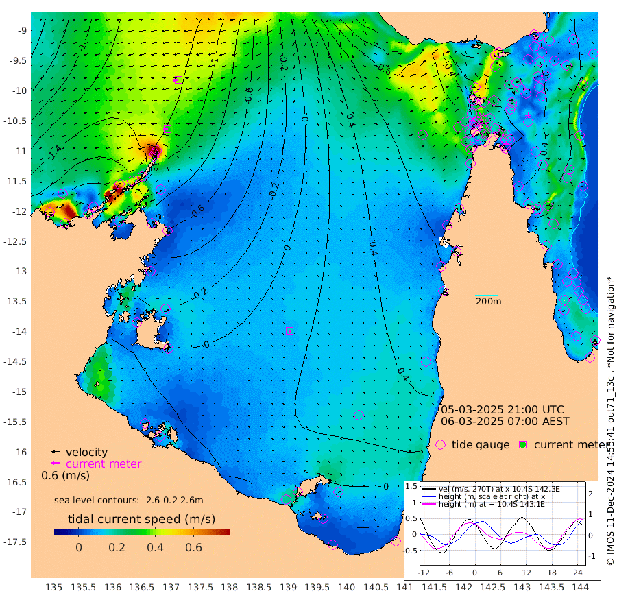 33cm/s -86T +3cm/s rms + 7cm/s -42T. ARA-GOC87 57m 17cm/s 156T +3cm/s rms + 2cm/s -2T. ARA-GOC87 60m 40cm/s -97T +2cm/s rms + 3cm/s 61T. ARA-GOC87 47m 36cm Daru 24cm Bobo Island 22cm Meer Island Barge 26cm Bramble Cay 44cm Unnamed Cay 25cm Pearce Cay 33cm Stephens Island 48cm Merrie England Shoals 49cm Mutacomal Reef 33cm Darnley Island Barge 20cm East Cay 36cm Yorke Island Barge 39cm Rennel Island 33cm Aureed Island 42cm Dungeness Reef 26cm Zagai Island 35cm Yam Island 16cm Dauan Island 20cm Saibai Island 24cm Phipi Reef 25cm Warrior Reef - West 39cm Mabuiag Island Barge 43cm Half Way Island 40cm Coconut Island 50cm Dugong Islet 42cm Poll Island 51cm Kirkcaldie Reef 55cm Suarji Island 47cm Sue Islet 54cm Hawkesbury Island 67cm Alert Patches 56cm Twin Island 44cm Badu Island 53cm St Pauls (Moa Island) 48cm Kubin (Moa Island) 58cm Ince Point 63cm Thursday Island 60cm Nardana Patches 61cm Turtle Head 54cm Round Island 62cm Goods Island 76cm Booby Island 71cm White Rocks Area 95cm Carpentaria 38cm Papou Point 81cm Bampfield Head 58cm Crab Island 71cm Red Wallis Island 62cm Packe Island 53cm Harrington Reef 68cm Herald Camp 19cm Sharp Point 44cm Red Island Point 55cm Possession Island 55cm Alpha Rock 51cm Frederick Point 42cm Wyborn Reef Light 42cm Tetley Island 22cm Triangle Reef 44cm Turtle Head Island 27cm Maclennan Cay 16cm Raine Island 39cm Mcsweeny Reef 38cm Collette Reef 29cm Shadwell Reef 40cm Hannibal Island 28cm Round Point 72cm Vrilya Point 39cm Cape Grenville 24cm Hicks Island 31cm Sir Charles Hardy Island 10cm Harvey Island 35cm Kay Reef 22cm Rocky Island 19cm Chapman Island 20cm Ham Reef 21cm Jubilee Reef 23cm Night Island 23cm Unnamed Reef No. 3 23cm Morris Island 28cm 1st 3 Mile Opening 26cm Creech Reef 14cm Fife Island 20cm Eden Reef 31cm Stanley Island 22cm Normanby River -202cm Yabooma Island -237cm Hutchison River -206cm Elcho Island -201cm North West Crocodile Island -145cm Cape Wessel -191cm Stevens Island -136cm Guluwuru Island -170cm Hopeful Bay -153cm Auster Point -166cm Two Island Bay -229cm Cadell Strait -109cm Mallison Island -127cm Melville Bay (Gove Harbour) -132cm Truant Island -84cm Cape Arnhem -53cm Cape Grey -41cm Hawk Island -14cm Milner Bay (Groote Eylandt) -3cm Cape Beatrice 44cm West Island 47cm Centre Island 22cm Mornington Island 33cm West Wellesley Islands 12cm Bountiful Island -32cm Albert River Mouth -28cm Sweers Island -25cm Karumba 32cm Nassau River Offshore 46cm Christmas Creek 49cm Archer River 55cm Boyd Point 52cm Weipa (Humbug Point) 59cm Pennefather River 64cm Cullen Point