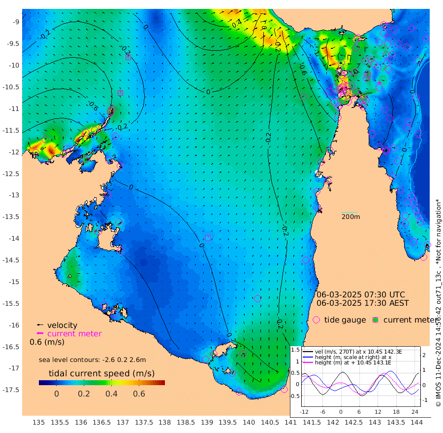 19cm/s -1T +3cm/s rms + 7cm/s -42T. ARA-GOC87 57m 13cm/s 11T +3cm/s rms + 2cm/s -2T. ARA-GOC87 60m 19cm/s 2T +2cm/s rms + 3cm/s 61T. ARA-GOC87 47m -11cm Daru -6cm Bobo Island -3cm Meer Island Barge -4cm Bramble Cay -3cm Unnamed Cay -17cm Pearce Cay -2cm Stephens Island 1cm Merrie England Shoals -7cm Mutacomal Reef 4cm Darnley Island Barge -4cm East Cay 0cm Yorke Island Barge -12cm Rennel Island -10cm Aureed Island -26cm Dungeness Reef -32cm Zagai Island -32cm Yam Island -79cm Dauan Island -55cm Saibai Island -81cm Phipi Reef -43cm Warrior Reef - West -75cm Mabuiag Island Barge -4cm Half Way Island -24cm Coconut Island -8cm Dugong Islet -32cm Poll Island -22cm Kirkcaldie Reef -59cm Suarji Island -18cm Sue Islet -129cm Hawkesbury Island -65cm Alert Patches -54cm Twin Island -139cm Badu Island -59cm St Pauls (Moa Island) -109cm Kubin (Moa Island) -76cm Ince Point -88cm Thursday Island -86cm Nardana Patches -113cm Turtle Head -111cm Round Island -138cm Goods Island -142cm Booby Island -141cm White Rocks Area -84cm Carpentaria -49cm Papou Point -140cm Bampfield Head -114cm Crab Island -132cm Red Wallis Island -121cm Packe Island -13cm Harrington Reef -116cm Herald Camp -4cm Sharp Point -90cm Red Island Point -72cm Possession Island -32cm Alpha Rock -37cm Frederick Point -16cm Wyborn Reef Light -19cm Tetley Island -15cm Triangle Reef -19cm Turtle Head Island -8cm Maclennan Cay -16cm Raine Island -7cm Mcsweeny Reef -3cm Collette Reef -7cm Shadwell Reef 0cm Hannibal Island -9cm Round Point -92cm Vrilya Point 0cm Cape Grenville -6cm Hicks Island -7cm Sir Charles Hardy Island 1cm Harvey Island -1cm Kay Reef -10cm Rocky Island -17cm Chapman Island -8cm Ham Reef -8cm Jubilee Reef -8cm Night Island -11cm Unnamed Reef No. 3 -10cm Morris Island -16cm 1st 3 Mile Opening -9cm Creech Reef -10cm Fife Island -8cm Eden Reef -3cm Stanley Island 1cm Normanby River -100cm Yabooma Island -118cm Hutchison River -96cm Elcho Island -90cm North West Crocodile Island -31cm Cape Wessel -70cm Stevens Island -11cm Guluwuru Island -63cm Hopeful Bay -50cm Auster Point -37cm Two Island Bay -66cm Cadell Strait 90cm Mallison Island -25cm Melville Bay (Gove Harbour) -25cm Truant Island -10cm Cape Arnhem 5cm Cape Grey 11cm Hawk Island 34cm Milner Bay (Groote Eylandt) 34cm Cape Beatrice 61cm West Island 63cm Centre Island 40cm Mornington Island 43cm West Wellesley Islands 22cm Bountiful Island 30cm Albert River Mouth 41cm Sweers Island 27cm Karumba -2cm Nassau River Offshore -28cm Christmas Creek -59cm Archer River -63cm Boyd Point -83cm Weipa (Humbug Point) -63cm Pennefather River -83cm Cullen Point