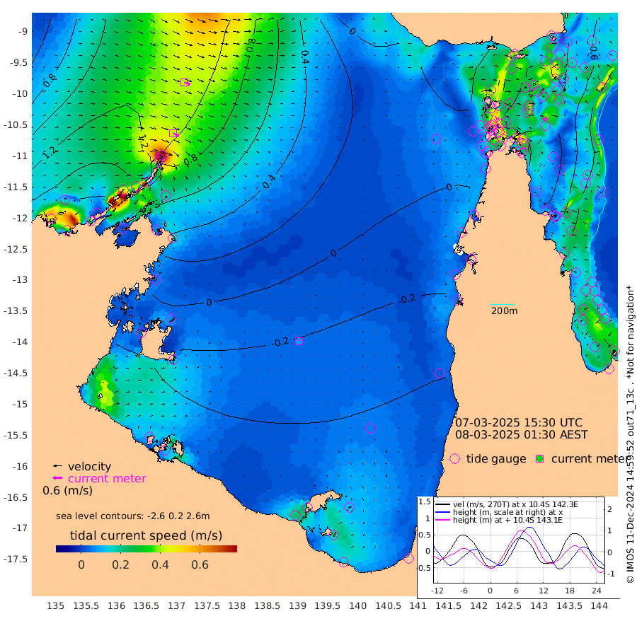 42cm/s 117T +3cm/s rms + 7cm/s -42T. ARA-GOC87 57m 8cm/s 31T +3cm/s rms + 2cm/s -2T. ARA-GOC87 60m 42cm/s 111T +2cm/s rms + 3cm/s 61T. ARA-GOC87 47m -69cm Daru -61cm Bobo Island -40cm Meer Island Barge -56cm Bramble Cay -75cm Unnamed Cay -59cm Pearce Cay -68cm Stephens Island -80cm Merrie England Shoals -80cm Mutacomal Reef -62cm Darnley Island Barge -46cm East Cay -65cm Yorke Island Barge -72cm Rennel Island -64cm Aureed Island -63cm Dungeness Reef -33cm Zagai Island -42cm Yam Island 7cm Dauan Island 4cm Saibai Island -11cm Phipi Reef -35cm Warrior Reef - West 9cm Mabuiag Island Barge -73cm Half Way Island -58cm Coconut Island -78cm Dugong Islet -53cm Poll Island -64cm Kirkcaldie Reef -48cm Suarji Island -53cm Sue Islet 43cm Hawkesbury Island -39cm Alert Patches -38cm Twin Island 53cm Badu Island -31cm St Pauls (Moa Island) 22cm Kubin (Moa Island) -16cm Ince Point -4cm Thursday Island -7cm Nardana Patches 10cm Turtle Head 24cm Round Island 40cm Goods Island 52cm Booby Island 41cm White Rocks Area 34cm Carpentaria -20cm Papou Point 48cm Bampfield Head 49cm Crab Island 43cm Red Wallis Island 22cm Packe Island -80cm Harrington Reef 26cm Herald Camp -17cm Sharp Point 15cm Red Island Point -14cm Possession Island -47cm Alpha Rock -52cm Frederick Point -65cm Wyborn Reef Light -60cm Tetley Island -33cm Triangle Reef -61cm Turtle Head Island -44cm Maclennan Cay -23cm Raine Island -67cm Mcsweeny Reef -63cm Collette Reef -42cm Shadwell Reef -70cm Hannibal Island -56cm Round Point 41cm Vrilya Point -62cm Cape Grenville -48cm Hicks Island -50cm Sir Charles Hardy Island -19cm Harvey Island -53cm Kay Reef -36cm Rocky Island -26cm Chapman Island -29cm Ham Reef -32cm Jubilee Reef -36cm Night Island -31cm Unnamed Reef No. 3 -38cm Morris Island -31cm 1st 3 Mile Opening -36cm Creech Reef -37cm Fife Island -37cm Eden Reef -46cm Stanley Island -49cm Normanby River 166cm Yabooma Island 191cm Hutchison River 167cm Elcho Island 158cm North West Crocodile Island 117cm Cape Wessel 155cm Stevens Island 100cm Guluwuru Island 137cm Hopeful Bay 127cm Auster Point 130cm Two Island Bay 176cm Cadell Strait 76cm Mallison Island 94cm Melville Bay (Gove Harbour) 104cm Truant Island 62cm Cape Arnhem 24cm Cape Grey 5cm Hawk Island -24cm Milner Bay (Groote Eylandt) -43cm Cape Beatrice -90cm West Island -88cm Centre Island -101cm Mornington Island -112cm West Wellesley Islands -107cm Bountiful Island -97cm Albert River Mouth -99cm Sweers Island -100cm Karumba -79cm Nassau River Offshore -54cm Christmas Creek -8cm Archer River 3cm Boyd Point 9cm Weipa (Humbug Point) 19cm Pennefather River 30cm Cullen Point