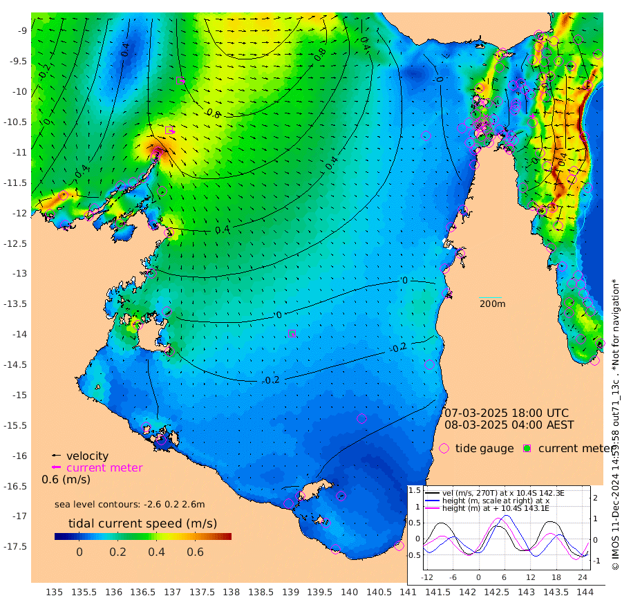 42cm/s 112T +3cm/s rms + 7cm/s -42T. ARA-GOC87 57m 19cm/s 153T +3cm/s rms + 2cm/s -2T. ARA-GOC87 60m 35cm/s 107T +2cm/s rms + 3cm/s 61T. ARA-GOC87 47m -4cm Daru 11cm Bobo Island 53cm Meer Island Barge 38cm Bramble Cay 12cm Unnamed Cay 22cm Pearce Cay 26cm Stephens Island 13cm Merrie England Shoals -11cm Mutacomal Reef 38cm Darnley Island Barge 48cm East Cay 20cm Yorke Island Barge 1cm Rennel Island 13cm Aureed Island -10cm Dungeness Reef -23cm Zagai Island -36cm Yam Island -28cm Dauan Island -22cm Saibai Island -39cm Phipi Reef -27cm Warrior Reef - West -36cm Mabuiag Island Barge 5cm Half Way Island -9cm Coconut Island -7cm Dugong Islet -26cm Poll Island -25cm Kirkcaldie Reef -50cm Suarji Island -20cm Sue Islet -10cm Hawkesbury Island -41cm Alert Patches -37cm Twin Island -9cm Badu Island -45cm St Pauls (Moa Island) -18cm Kubin (Moa Island) -36cm Ince Point -31cm Thursday Island -33cm Nardana Patches -21cm Turtle Head -25cm Round Island -2cm Goods Island 6cm Booby Island -10cm White Rocks Area 20cm Carpentaria -34cm Papou Point 2cm Bampfield Head 5cm Crab Island -1cm Red Wallis Island -13cm Packe Island -16cm Harrington Reef -15cm Herald Camp -22cm Sharp Point -20cm Red Island Point -34cm Possession Island -38cm Alpha Rock -27cm Frederick Point -10cm Wyborn Reef Light -16cm Tetley Island 38cm Triangle Reef 2cm Turtle Head Island 42cm Maclennan Cay 55cm Raine Island 17cm Mcsweeny Reef 24cm Collette Reef 43cm Shadwell Reef 29cm Hannibal Island 36cm Round Point 14cm Vrilya Point 34cm Cape Grenville 41cm Hicks Island 50cm Sir Charles Hardy Island 11cm Harvey Island 47cm Kay Reef 52cm Rocky Island 59cm Chapman Island 58cm Ham Reef 56cm Jubilee Reef 46cm Night Island 57cm Unnamed Reef No. 3 55cm Morris Island 56cm 1st 3 Mile Opening 57cm Creech Reef 53cm Fife Island 75cm Eden Reef 55cm Stanley Island 57cm Normanby River 46cm Yabooma Island 68cm Hutchison River 52cm Elcho Island 37cm North West Crocodile Island 75cm Cape Wessel 61cm Stevens Island 108cm Guluwuru Island 56cm Hopeful Bay 64cm Auster Point 71cm Two Island Bay 107cm Cadell Strait 220cm Mallison Island 82cm Melville Bay (Gove Harbour) 92cm Truant Island 62cm Cape Arnhem 20cm Cape Grey -3cm Hawk Island -42cm Milner Bay (Groote Eylandt) -52cm Cape Beatrice -93cm West Island -92cm Centre Island -88cm Mornington Island -91cm West Wellesley Islands -105cm Bountiful Island -130cm Albert River Mouth -135cm Sweers Island -133cm Karumba -54cm Nassau River Offshore -20cm Christmas Creek 9cm Archer River 17cm Boyd Point 15cm Weipa (Humbug Point) 16cm Pennefather River 10cm Cullen Point