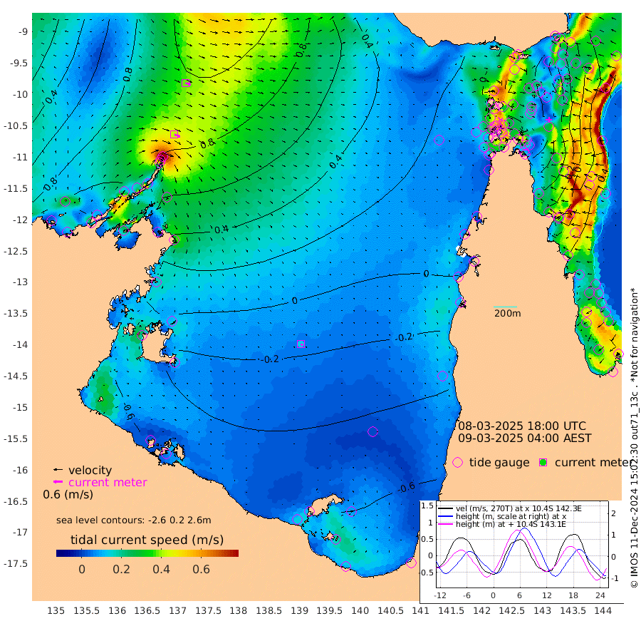 42cm/s 115T +3cm/s rms + 7cm/s -42T. ARA-GOC87 57m 13cm/s 143T +3cm/s rms + 2cm/s -2T. ARA-GOC87 60m 38cm/s 111T +2cm/s rms + 3cm/s 61T. ARA-GOC87 47m -54cm Daru -39cm Bobo Island 23cm Meer Island Barge 0cm Bramble Cay -34cm Unnamed Cay -27cm Pearce Cay -21cm Stephens Island -33cm Merrie England Shoals -59cm Mutacomal Reef -6cm Darnley Island Barge 17cm East Cay -27cm Yorke Island Barge -46cm Rennel Island -36cm Aureed Island -58cm Dungeness Reef -61cm Zagai Island -71cm Yam Island -47cm Dauan Island -38cm Saibai Island -66cm Phipi Reef -66cm Warrior Reef - West -42cm Mabuiag Island Barge -44cm Half Way Island -55cm Coconut Island -57cm Dugong Islet -67cm Poll Island -70cm Kirkcaldie Reef -87cm Suarji Island -59cm Sue Islet 13cm Hawkesbury Island -71cm Alert Patches -69cm Twin Island 5cm Badu Island -75cm St Pauls (Moa Island) -14cm Kubin (Moa Island) -53cm Ince Point -41cm Thursday Island -45cm Nardana Patches -23cm Turtle Head -13cm Round Island 14cm Goods Island 32cm Booby Island 14cm White Rocks Area 42cm Carpentaria -58cm Papou Point 30cm Bampfield Head 26cm Crab Island 21cm Red Wallis Island -6cm Packe Island -69cm Harrington Reef 6cm Herald Camp -33cm Sharp Point -18cm Red Island Point -48cm Possession Island -67cm Alpha Rock -67cm Frederick Point -55cm Wyborn Reef Light -59cm Tetley Island 12cm Triangle Reef -46cm Turtle Head Island 13cm Maclennan Cay 35cm Raine Island -28cm Mcsweeny Reef -17cm Collette Reef 14cm Shadwell Reef -16cm Hannibal Island -1cm Round Point 33cm Vrilya Point -1cm Cape Grenville 9cm Hicks Island 20cm Sir Charles Hardy Island -1cm Harvey Island 19cm Kay Reef 28cm Rocky Island 40cm Chapman Island 39cm Ham Reef 33cm Jubilee Reef 22cm Night Island 36cm Unnamed Reef No. 3 29cm Morris Island 33cm 1st 3 Mile Opening 31cm Creech Reef 25cm Fife Island 48cm Eden Reef 30cm Stanley Island 29cm Normanby River 102cm Yabooma Island 122cm Hutchison River 104cm Elcho Island 90cm North West Crocodile Island 101cm Cape Wessel 104cm Stevens Island 111cm Guluwuru Island 99cm Hopeful Bay 96cm Auster Point 103cm Two Island Bay 139cm Cadell Strait 193cm Mallison Island 90cm Melville Bay (Gove Harbour) 101cm Truant Island 62cm Cape Arnhem 18cm Cape Grey -5cm Hawk Island -44cm Milner Bay (Groote Eylandt) -59cm Cape Beatrice -106cm West Island -104cm Centre Island -114cm Mornington Island -117cm West Wellesley Islands -125cm Bountiful Island -146cm Albert River Mouth -150cm Sweers Island -149cm Karumba -77cm Nassau River Offshore -39cm Christmas Creek 8cm Archer River 19cm Boyd Point 21cm Weipa (Humbug Point) 22cm Pennefather River 28cm Cullen Point