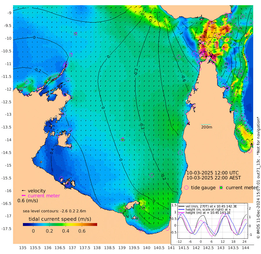 17cm/s 34T +3cm/s rms + 7cm/s -42T. ARA-GOC87 57m 32cm/s 4T +3cm/s rms + 2cm/s -2T. ARA-GOC87 60m 21cm/s 47T +2cm/s rms + 3cm/s 61T. ARA-GOC87 47m 68cm Daru 72cm Bobo Island 12cm Meer Island Barge 36cm Bramble Cay 60cm Unnamed Cay 61cm Pearce Cay 57cm Stephens Island 64cm Merrie England Shoals 73cm Mutacomal Reef 43cm Darnley Island Barge 19cm East Cay 55cm Yorke Island Barge 63cm Rennel Island 63cm Aureed Island 56cm Dungeness Reef 40cm Zagai Island 38cm Yam Island -41cm Dauan Island -35cm Saibai Island -20cm Phipi Reef 24cm Warrior Reef - West -30cm Mabuiag Island Barge 67cm Half Way Island 67cm Coconut Island 67cm Dugong Islet 56cm Poll Island 56cm Kirkcaldie Reef 46cm Suarji Island 46cm Sue Islet -110cm Hawkesbury Island 22cm Alert Patches 33cm Twin Island -99cm Badu Island 29cm St Pauls (Moa Island) -63cm Kubin (Moa Island) -6cm Ince Point -26cm Thursday Island -22cm Nardana Patches -62cm Turtle Head -67cm Round Island -109cm Goods Island -130cm Booby Island -105cm White Rocks Area -102cm Carpentaria 26cm Papou Point -110cm Bampfield Head -108cm Crab Island -116cm Red Wallis Island -80cm Packe Island 87cm Harrington Reef -107cm Herald Camp 15cm Sharp Point -52cm Red Island Point 0cm Possession Island 42cm Alpha Rock 54cm Frederick Point 74cm Wyborn Reef Light 71cm Tetley Island 8cm Triangle Reef 77cm Turtle Head Island 11cm Maclennan Cay -12cm Raine Island 55cm Mcsweeny Reef 44cm Collette Reef 8cm Shadwell Reef 51cm Hannibal Island 38cm Round Point -103cm Vrilya Point 31cm Cape Grenville 23cm Hicks Island 3cm Sir Charles Hardy Island 11cm Harvey Island 13cm Kay Reef -3cm Rocky Island -15cm Chapman Island -14cm Ham Reef -6cm Jubilee Reef 3cm Night Island -11cm Unnamed Reef No. 3 0cm Morris Island -9cm 1st 3 Mile Opening -5cm Creech Reef 8cm Fife Island -10cm Eden Reef 0cm Stanley Island 12cm Normanby River -7cm Yabooma Island -10cm Hutchison River -7cm Elcho Island -6cm North West Crocodile Island 19cm Cape Wessel 15cm Stevens Island 12cm Guluwuru Island 3cm Hopeful Bay 17cm Auster Point 14cm Two Island Bay 0cm Cadell Strait -5cm Mallison Island 16cm Melville Bay (Gove Harbour) 18cm Truant Island 16cm Cape Arnhem 31cm Cape Grey 36cm Hawk Island 64cm Milner Bay (Groote Eylandt) 55cm Cape Beatrice 76cm West Island 77cm Centre Island 46cm Mornington Island 48cm West Wellesley Islands 36cm Bountiful Island 53cm Albert River Mouth 81cm Sweers Island 47cm Karumba -9cm Nassau River Offshore -49cm Christmas Creek -82cm Archer River -87cm Boyd Point -104cm Weipa (Humbug Point) -75cm Pennefather River -103cm Cullen Point