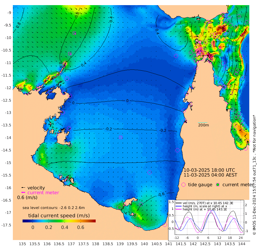 25cm/s 123T +3cm/s rms + 7cm/s -42T. ARA-GOC87 57m 10cm/s 47T +3cm/s rms + 2cm/s -2T. ARA-GOC87 60m 27cm/s 121T +2cm/s rms + 3cm/s 61T. ARA-GOC87 47m -133cm Daru -128cm Bobo Island -51cm Meer Island Barge -83cm Bramble Cay -114cm Unnamed Cay -122cm Pearce Cay -110cm Stephens Island -117cm Merrie England Shoals -134cm Mutacomal Reef -93cm Darnley Island Barge -64cm East Cay -109cm Yorke Island Barge -126cm Rennel Island -122cm Aureed Island -128cm Dungeness Reef -104cm Zagai Island -108cm Yam Island -59cm Dauan Island -47cm Saibai Island -90cm Phipi Reef -114cm Warrior Reef - West -33cm Mabuiag Island Barge -124cm Half Way Island -127cm Coconut Island -132cm Dugong Islet -121cm Poll Island -128cm Kirkcaldie Reef -119cm Suarji Island -107cm Sue Islet 35cm Hawkesbury Island -97cm Alert Patches -102cm Twin Island 20cm Badu Island -99cm St Pauls (Moa Island) -8cm Kubin (Moa Island) -65cm Ince Point -44cm Thursday Island -49cm Nardana Patches -22cm Turtle Head 11cm Round Island 30cm Goods Island 63cm Booby Island 42cm White Rocks Area 77cm Carpentaria -80cm Papou Point 70cm Bampfield Head 51cm Crab Island 47cm Red Wallis Island 0cm Packe Island -149cm Harrington Reef 38cm Herald Camp -36cm Sharp Point -20cm Red Island Point -55cm Possession Island -95cm Alpha Rock -119cm Frederick Point -125cm Wyborn Reef Light -123cm Tetley Island -52cm Triangle Reef -125cm Turtle Head Island -56cm Maclennan Cay -27cm Raine Island -109cm Mcsweeny Reef -95cm Collette Reef -52cm Shadwell Reef -103cm Hannibal Island -87cm Round Point 57cm Vrilya Point -76cm Cape Grenville -68cm Hicks Island -57cm Sir Charles Hardy Island -25cm Harvey Island -55cm Kay Reef -39cm Rocky Island -27cm Chapman Island -24cm Ham Reef -34cm Jubilee Reef -42cm Night Island -30cm Unnamed Reef No. 3 -42cm Morris Island -30cm 1st 3 Mile Opening -38cm Creech Reef -52cm Fife Island -35cm Eden Reef -42cm Stanley Island -52cm Normanby River 111cm Yabooma Island 111cm Hutchison River 107cm Elcho Island 98cm North West Crocodile Island 78cm Cape Wessel 96cm Stevens Island 55cm Guluwuru Island 96cm Hopeful Bay 83cm Auster Point 89cm Two Island Bay 92cm Cadell Strait 73cm Mallison Island 49cm Melville Bay (Gove Harbour) 58cm Truant Island 30cm Cape Arnhem 3cm Cape Grey -12cm Hawk Island -24cm Milner Bay (Groote Eylandt) -44cm Cape Beatrice -72cm West Island -69cm Centre Island -114cm Mornington Island -116cm West Wellesley Islands -116cm Bountiful Island -126cm Albert River Mouth -123cm Sweers Island -133cm Karumba -95cm Nassau River Offshore -64cm Christmas Creek -5cm Archer River 15cm Boyd Point 20cm Weipa (Humbug Point) 25cm Pennefather River 51cm Cullen Point