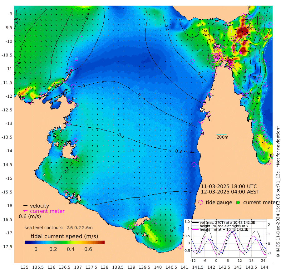 13cm/s 134T +3cm/s rms + 7cm/s -42T. ARA-GOC87 57m 15cm/s 28T +3cm/s rms + 2cm/s -2T. ARA-GOC87 60m 17cm/s 134T +2cm/s rms + 3cm/s 61T. ARA-GOC87 47m -147cm Daru -148cm Bobo Island -77cm Meer Island Barge -110cm Bramble Cay -133cm Unnamed Cay -148cm Pearce Cay -133cm Stephens Island -138cm Merrie England Shoals -147cm Mutacomal Reef -116cm Darnley Island Barge -93cm East Cay -127cm Yorke Island Barge -143cm Rennel Island -140cm Aureed Island -137cm Dungeness Reef -102cm Zagai Island -104cm Yam Island -53cm Dauan Island -42cm Saibai Island -84cm Phipi Reef -115cm Warrior Reef - West -24cm Mabuiag Island Barge -138cm Half Way Island -138cm Coconut Island -142cm Dugong Islet -124cm Poll Island -130cm Kirkcaldie Reef -111cm Suarji Island -109cm Sue Islet 30cm Hawkesbury Island -92cm Alert Patches -98cm Twin Island 18cm Badu Island -90cm St Pauls (Moa Island) -7cm Kubin (Moa Island) -59cm Ince Point -37cm Thursday Island -42cm Nardana Patches -21cm Turtle Head 14cm Round Island 26cm Goods Island 62cm Booby Island 41cm White Rocks Area 84cm Carpentaria -75cm Papou Point 72cm Bampfield Head 50cm Crab Island 46cm Red Wallis Island -2cm Packe Island -159cm Harrington Reef 41cm Herald Camp -29cm Sharp Point -23cm Red Island Point -50cm Possession Island -90cm Alpha Rock -122cm Frederick Point -138cm Wyborn Reef Light -133cm Tetley Island -74cm Triangle Reef -139cm Turtle Head Island -79cm Maclennan Cay -53cm Raine Island -129cm Mcsweeny Reef -116cm Collette Reef -75cm Shadwell Reef -127cm Hannibal Island -116cm Round Point 58cm Vrilya Point -100cm Cape Grenville -93cm Hicks Island -83cm Sir Charles Hardy Island -32cm Harvey Island -83cm Kay Reef -66cm Rocky Island -57cm Chapman Island -52cm Ham Reef -60cm Jubilee Reef -66cm Night Island -59cm Unnamed Reef No. 3 -70cm Morris Island -54cm 1st 3 Mile Opening -64cm Creech Reef -82cm Fife Island -70cm Eden Reef -69cm Stanley Island -84cm Normanby River 66cm Yabooma Island 55cm Hutchison River 62cm Elcho Island 56cm North West Crocodile Island 39cm Cape Wessel 50cm Stevens Island 12cm Guluwuru Island 53cm Hopeful Bay 45cm Auster Point 50cm Two Island Bay 30cm Cadell Strait 2cm Mallison Island 12cm Melville Bay (Gove Harbour) 18cm Truant Island 5cm Cape Arnhem -6cm Cape Grey -16cm Hawk Island -8cm Milner Bay (Groote Eylandt) -27cm Cape Beatrice -36cm West Island -32cm Centre Island -91cm Mornington Island -92cm West Wellesley Islands -92cm Bountiful Island -97cm Albert River Mouth -92cm Sweers Island -107cm Karumba -87cm Nassau River Offshore -64cm Christmas Creek -12cm Archer River 10cm Boyd Point 13cm Weipa (Humbug Point) 23cm Pennefather River 51cm Cullen Point