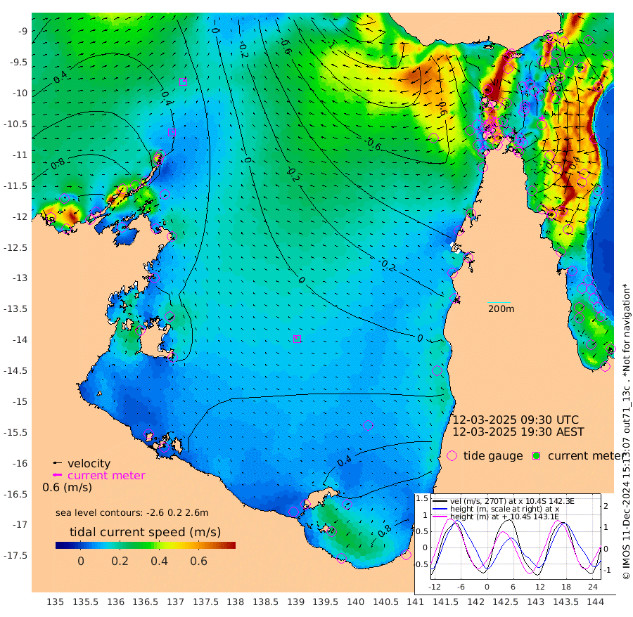 9cm/s 48T +3cm/s rms + 7cm/s -42T. ARA-GOC87 57m 19cm/s -46T +3cm/s rms + 2cm/s -2T. ARA-GOC87 60m 15cm/s 56T +2cm/s rms + 3cm/s 61T. ARA-GOC87 47m -23cm Daru -9cm Bobo Island 40cm Meer Island Barge 41cm Bramble Cay 10cm Unnamed Cay 6cm Pearce Cay 17cm Stephens Island 25cm Merrie England Shoals -13cm Mutacomal Reef 18cm Darnley Island Barge 49cm East Cay -7cm Yorke Island Barge -7cm Rennel Island -12cm Aureed Island -38cm Dungeness Reef -88cm Zagai Island -92cm Yam Island -124cm Dauan Island -120cm Saibai Island -95cm Phipi Reef -91cm Warrior Reef - West -118cm Mabuiag Island Barge -12cm Half Way Island -36cm Coconut Island -32cm Dugong Islet -67cm Poll Island -60cm Kirkcaldie Reef -97cm Suarji Island -72cm Sue Islet -106cm Hawkesbury Island -96cm Alert Patches -97cm Twin Island -103cm Badu Island -118cm St Pauls (Moa Island) -108cm Kubin (Moa Island) -107cm Ince Point -108cm Thursday Island -109cm Nardana Patches -95cm Turtle Head -101cm Round Island -88cm Goods Island -96cm Booby Island -85cm White Rocks Area -107cm Carpentaria -99cm Papou Point -106cm Bampfield Head -75cm Crab Island -94cm Red Wallis Island -95cm Packe Island -36cm Harrington Reef -109cm Herald Camp -38cm Sharp Point -78cm Red Island Point -95cm Possession Island -85cm Alpha Rock -72cm Frederick Point -32cm Wyborn Reef Light -46cm Tetley Island 18cm Triangle Reef -35cm Turtle Head Island 29cm Maclennan Cay 51cm Raine Island 6cm Mcsweeny Reef 20cm Collette Reef 36cm Shadwell Reef 29cm Hannibal Island 44cm Round Point -75cm Vrilya Point 40cm Cape Grenville 39cm Hicks Island 34cm Sir Charles Hardy Island 10cm Harvey Island 56cm Kay Reef 51cm Rocky Island 60cm Chapman Island 51cm Ham Reef 48cm Jubilee Reef 43cm Night Island 55cm Unnamed Reef No. 3 56cm Morris Island 45cm 1st 3 Mile Opening 50cm Creech Reef 56cm Fife Island 75cm Eden Reef 60cm Stanley Island 69cm Normanby River 83cm Yabooma Island 96cm Hutchison River 89cm Elcho Island 84cm North West Crocodile Island 40cm Cape Wessel 79cm Stevens Island 39cm Guluwuru Island 83cm Hopeful Bay 53cm Auster Point 41cm Two Island Bay 77cm Cadell Strait 73cm Mallison Island 40cm Melville Bay (Gove Harbour) 34cm Truant Island 23cm Cape Arnhem 29cm Cape Grey 34cm Hawk Island 38cm Milner Bay (Groote Eylandt) 42cm Cape Beatrice 31cm West Island 35cm Centre Island 83cm Mornington Island 85cm West Wellesley Islands 108cm Bountiful Island 152cm Albert River Mouth 158cm Sweers Island 142cm Karumba 66cm Nassau River Offshore 33cm Christmas Creek 6cm Archer River -33cm Boyd Point -19cm Weipa (Humbug Point) -35cm Pennefather River -70cm Cullen Point